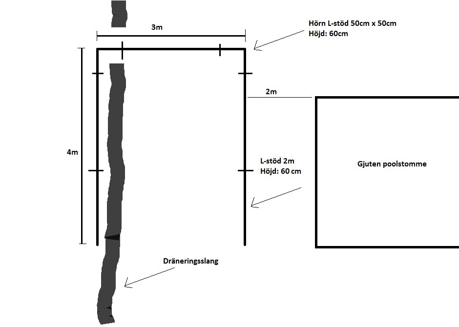 Poolhuset kommer vara 3m x 5 m och ligga precis ovanpå utfyllnaden och L-stöden.