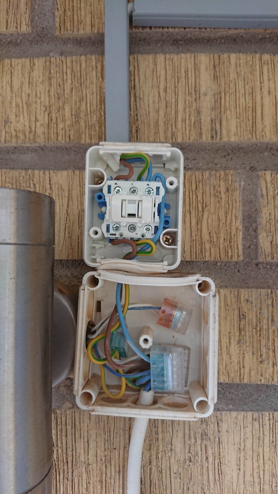 För att koppla det till det ni ser på bilden så kommer strömmen ut ur väggen nästan nederst, bakom den blåa wagon. Kabeln neråt går till två väggkontakter. Till vänster ser ni utbelysning 1. Ovanför kopplingsdosan sitter en vridströmbrytare. Ur toppen på den går kabel till utebelysning två.