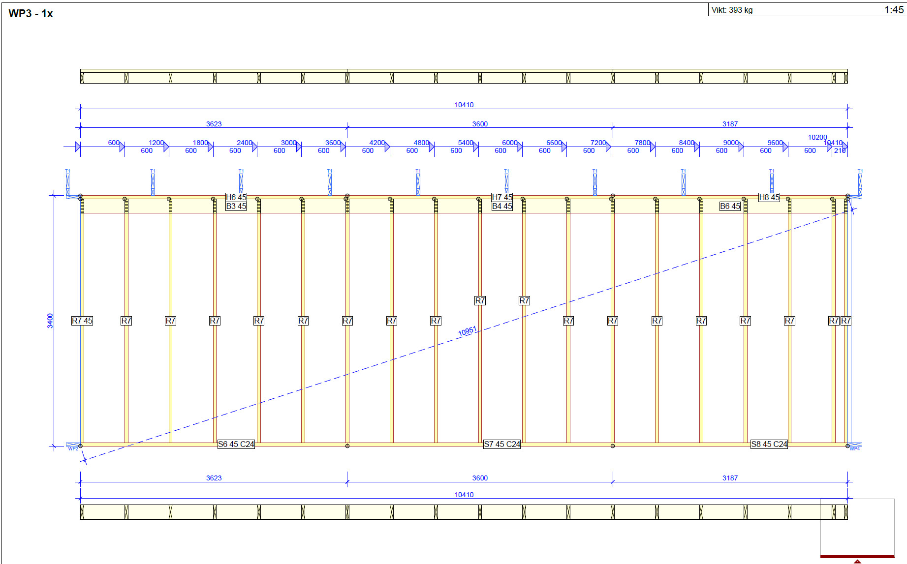 Väggarna är lösvirke, reglar och syll på 195mm. Så här är ritningen för väggen med största problemet (plattan lägre än kanten mellan S7 o S8 på ca 2m).