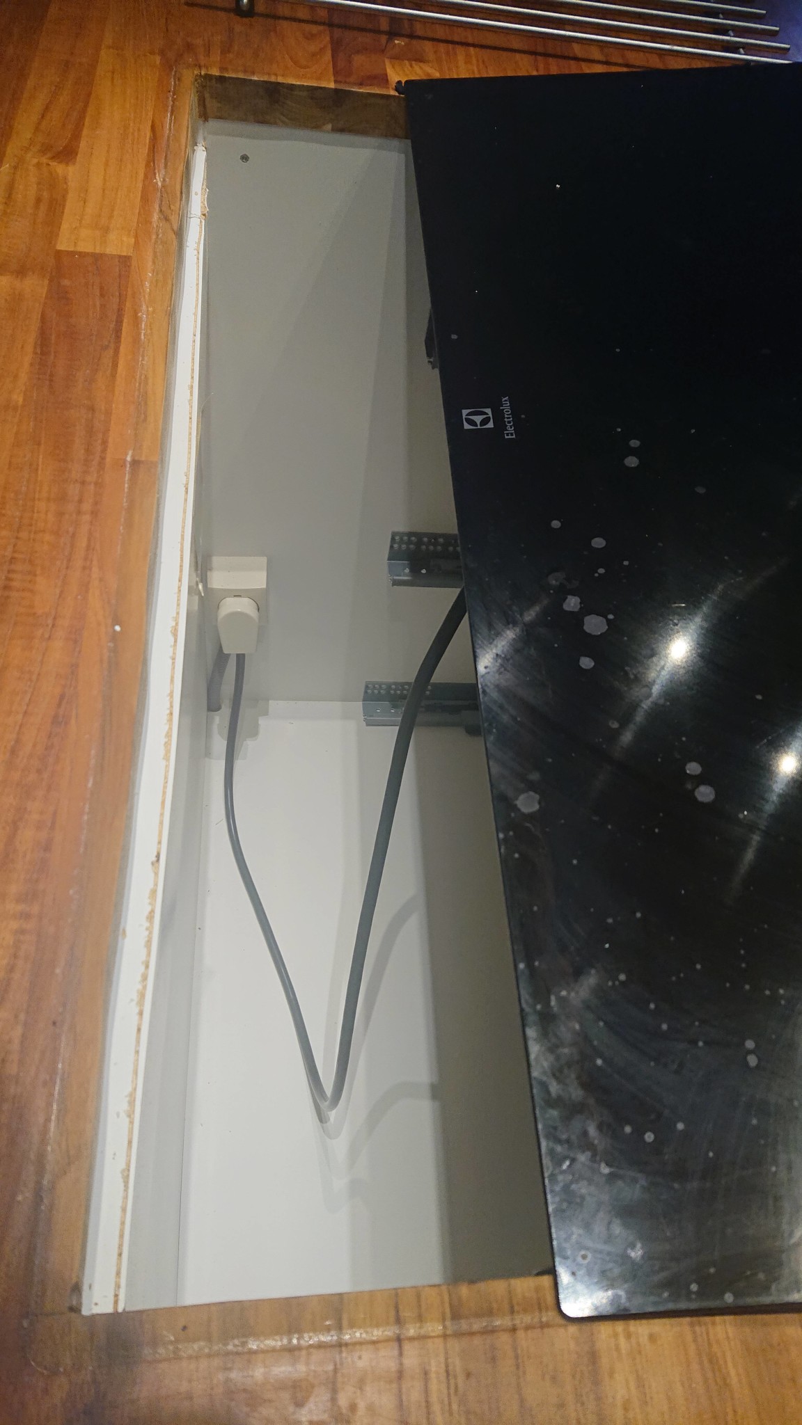 Fanns inte plats för utanpåliggande kabel bakom skåp för ugn/micro. Åker på att fräsa in slangarna i väggen vilket jag gärna sluppit.