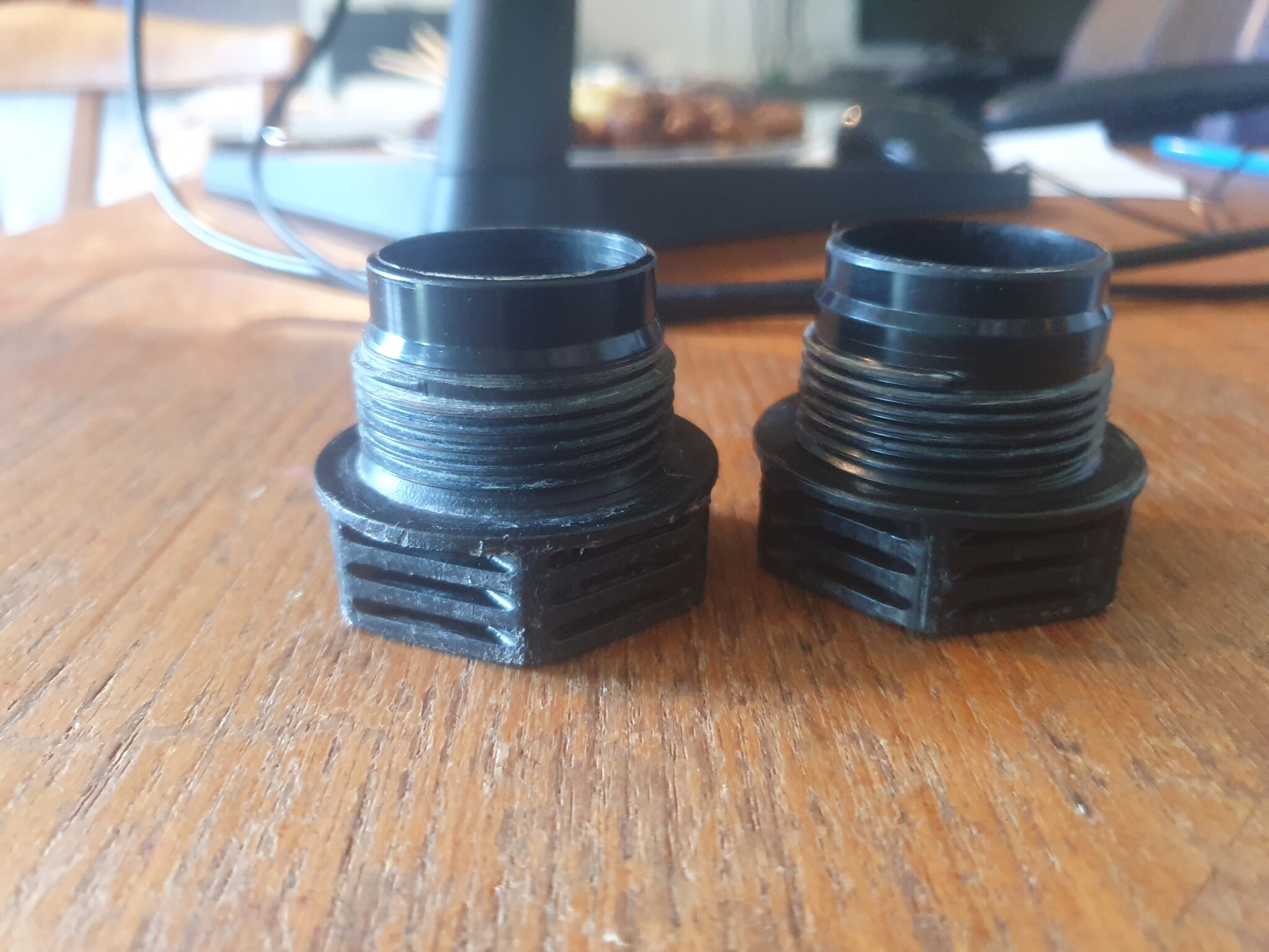 Andra fotot visar två tryckskruvar. Vänstra tryckskruven är den som satt i servisventilen först. Den högra är inköpt nyligen. Det står PRK på båda. De ser inte helt lika ut tycker jag. Den raka delen i änden där muttern inte är är längre på den gamla. Har tryckskruvarna ändrats genom åren? Jag vet inte hur gammal servisventilen är, men tror att den är från 2009 och ingen inkoppling är gjord sedan tidigare. I handeln finns det bara en sorts tryckskruv för pem32 och PRK vad jag sett.