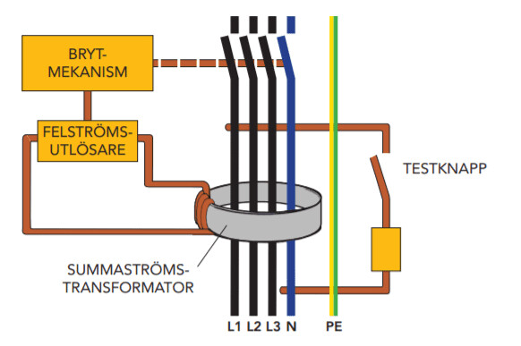 Ifall det skulle gå ström i endast L1, så bildas det ett motsvarande magnetfält i denna järnkärna, och sen är det lindat en lindning runt kärnan som leder till mekanismen som känner av detta magnetfält och då trippar JFB'ns kontakter (som är fjäderuppspända).