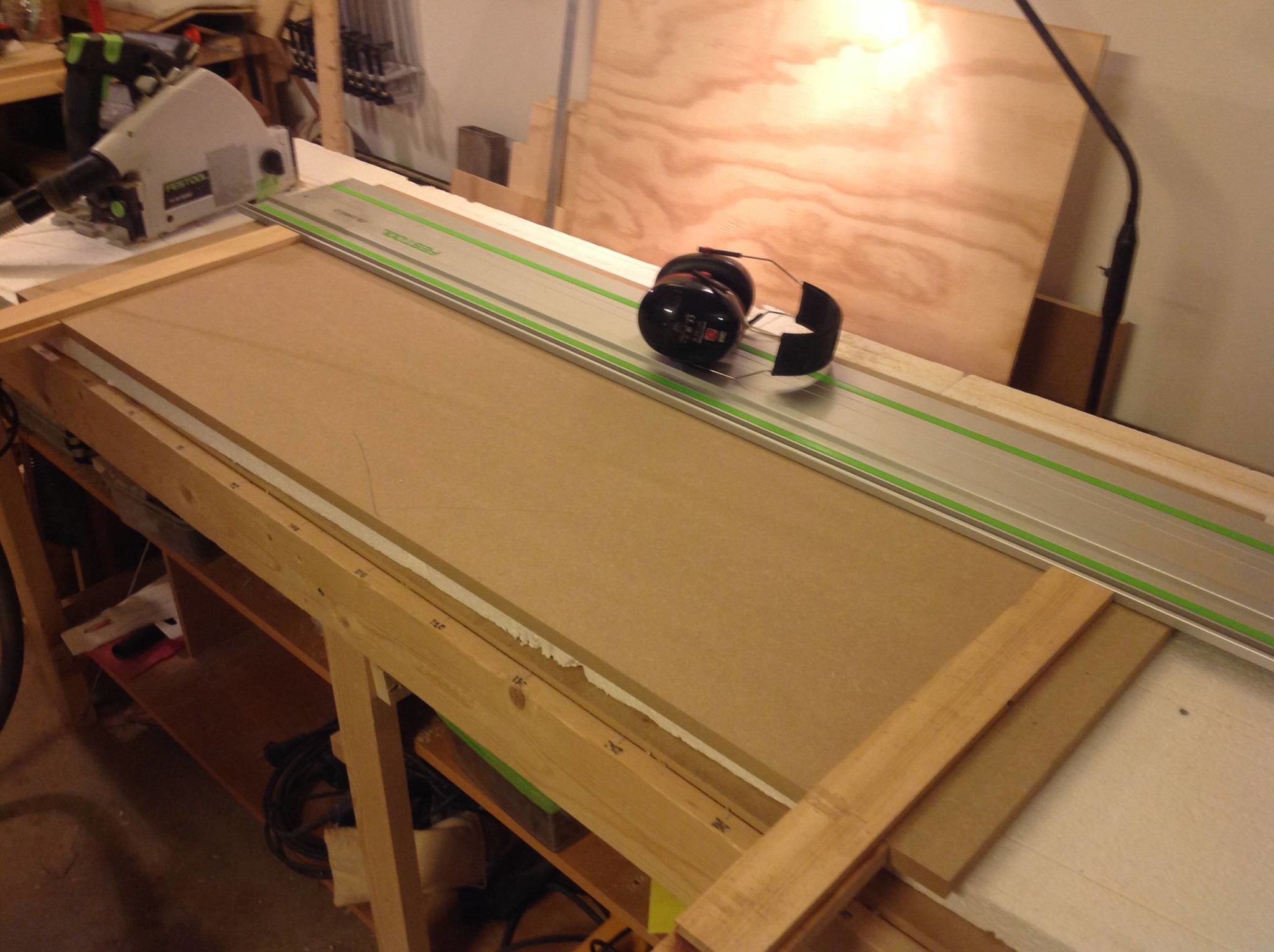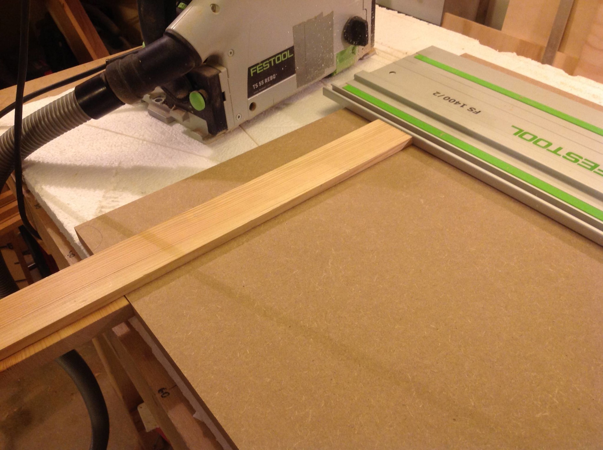 Bygger skåpen i sextonmillimeters mdf och då jag av olika anledningar inte kan såga upp allt på justersågen får TS-femtiofemman träda i tjänst. Ett gäng gavlar, bottnar och toppbitar med samma djupmått ska kapas till så för att streamlina serieproduktionen fuskade jag ihop en egen variant av Festools FS-PA: