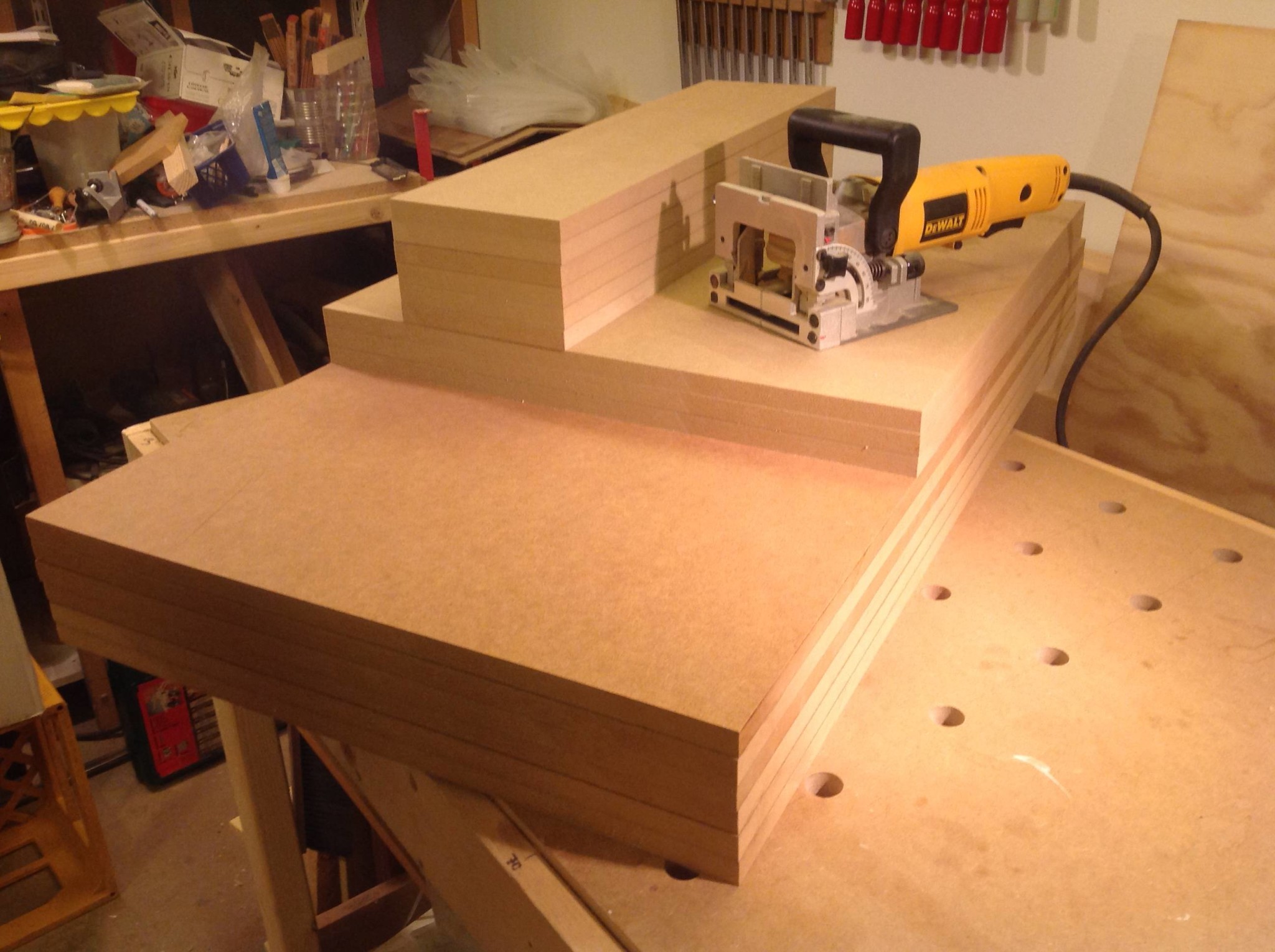 Dags att fräsa för kex; sedan ska det fräsas en fals i stomdelarna för ryggstycket plus att gavlarna ska få hålrader för hyllbärare/hyllplan innan allt sätts ihop. Eftersom jag behöver förvaringen pronto blir det hyllor men på sikt ska de ersättas med lådor.