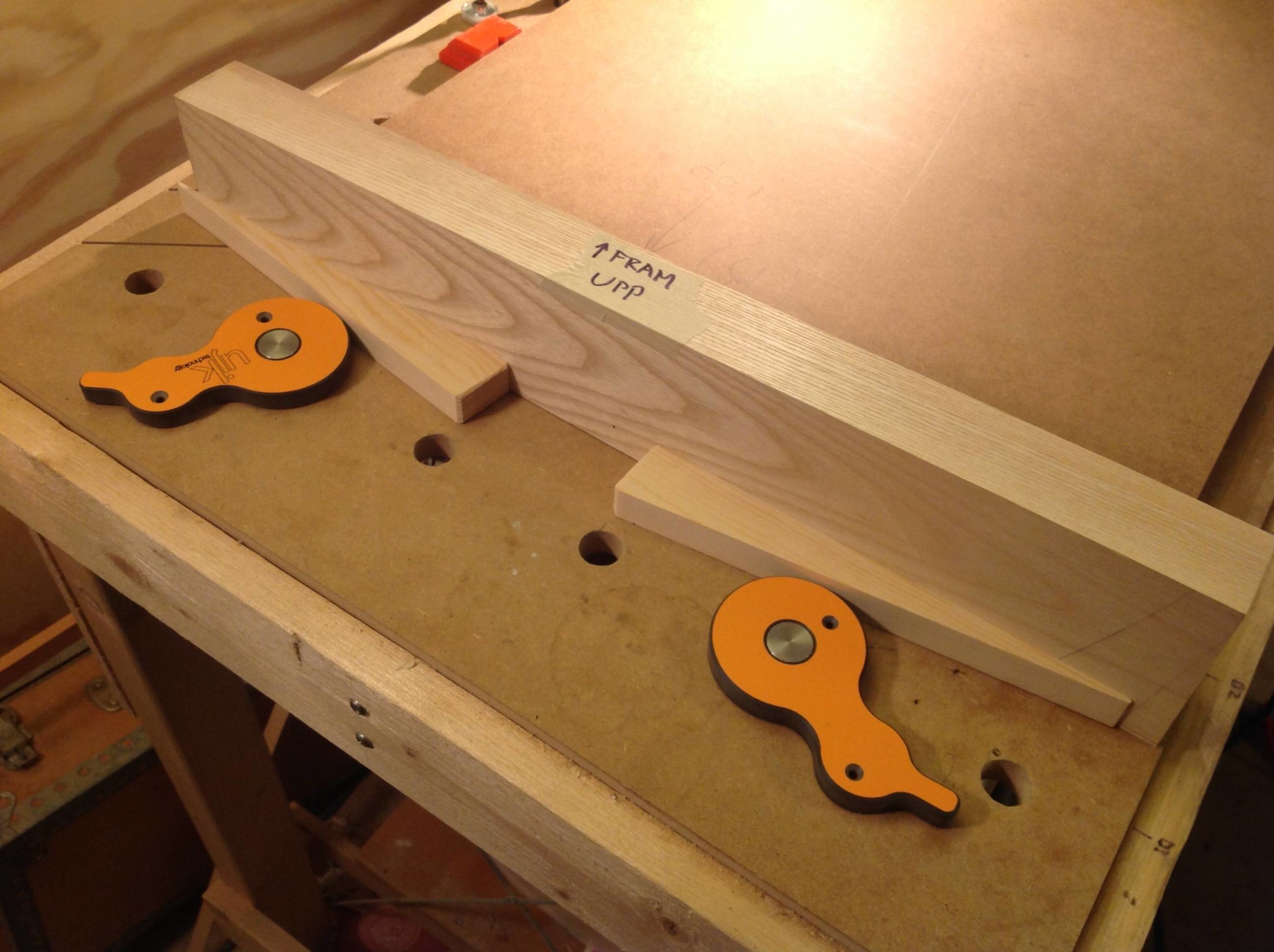 När det gäller gavlarna skulle de såklart fräsas på insidan och jag brukar använda mig av ett anhåll som jag kör kexfräsen stående på nosen med sulan mot anhållet. Den här gången hade jag en överbliven bit ask från ett bordsbygge som jag använde som anhåll. Vid fräsningen för toppbitarna fick jag användning för mina nya cam levers från Axminster, funkade enkelt och smidigt.