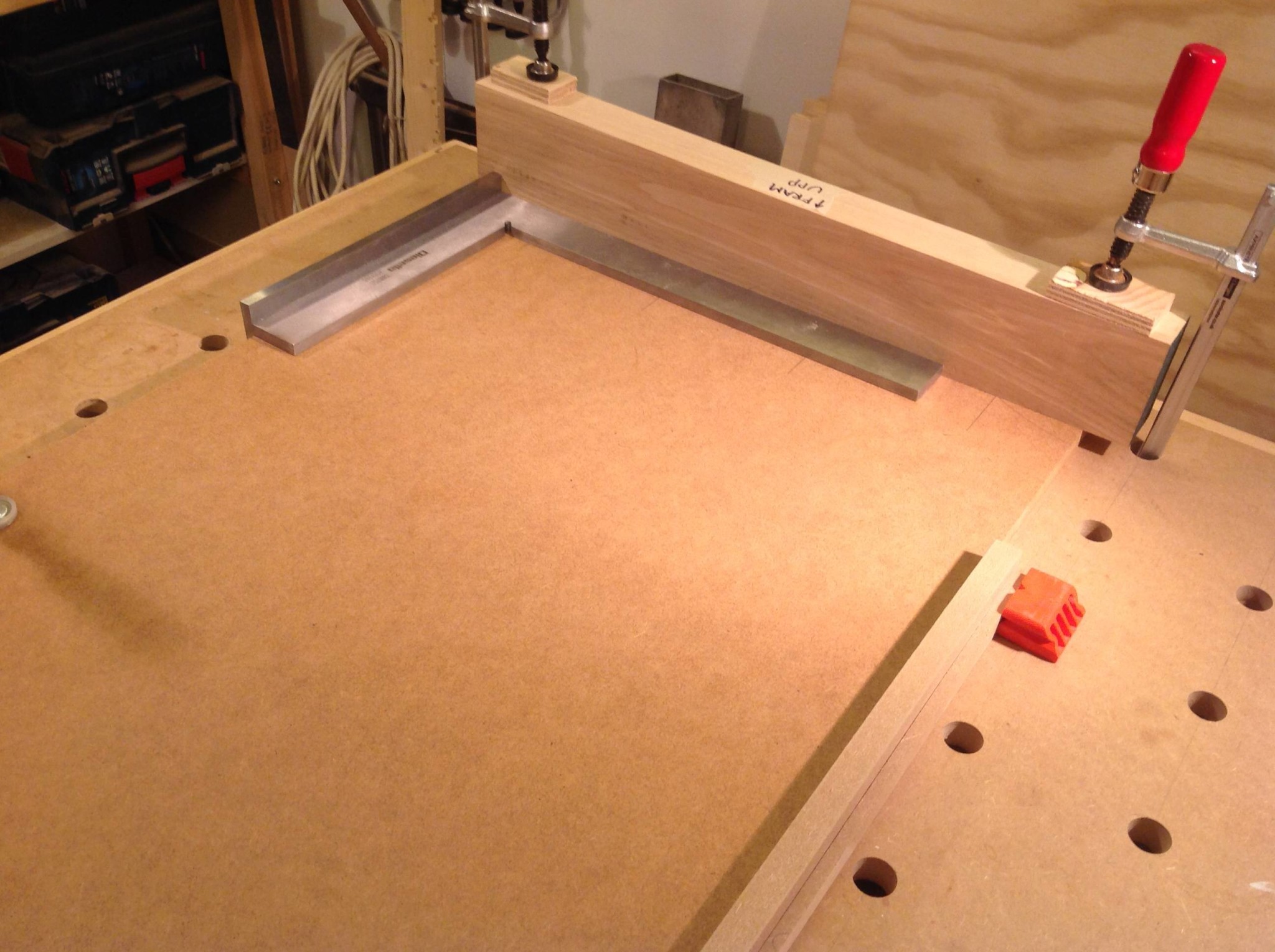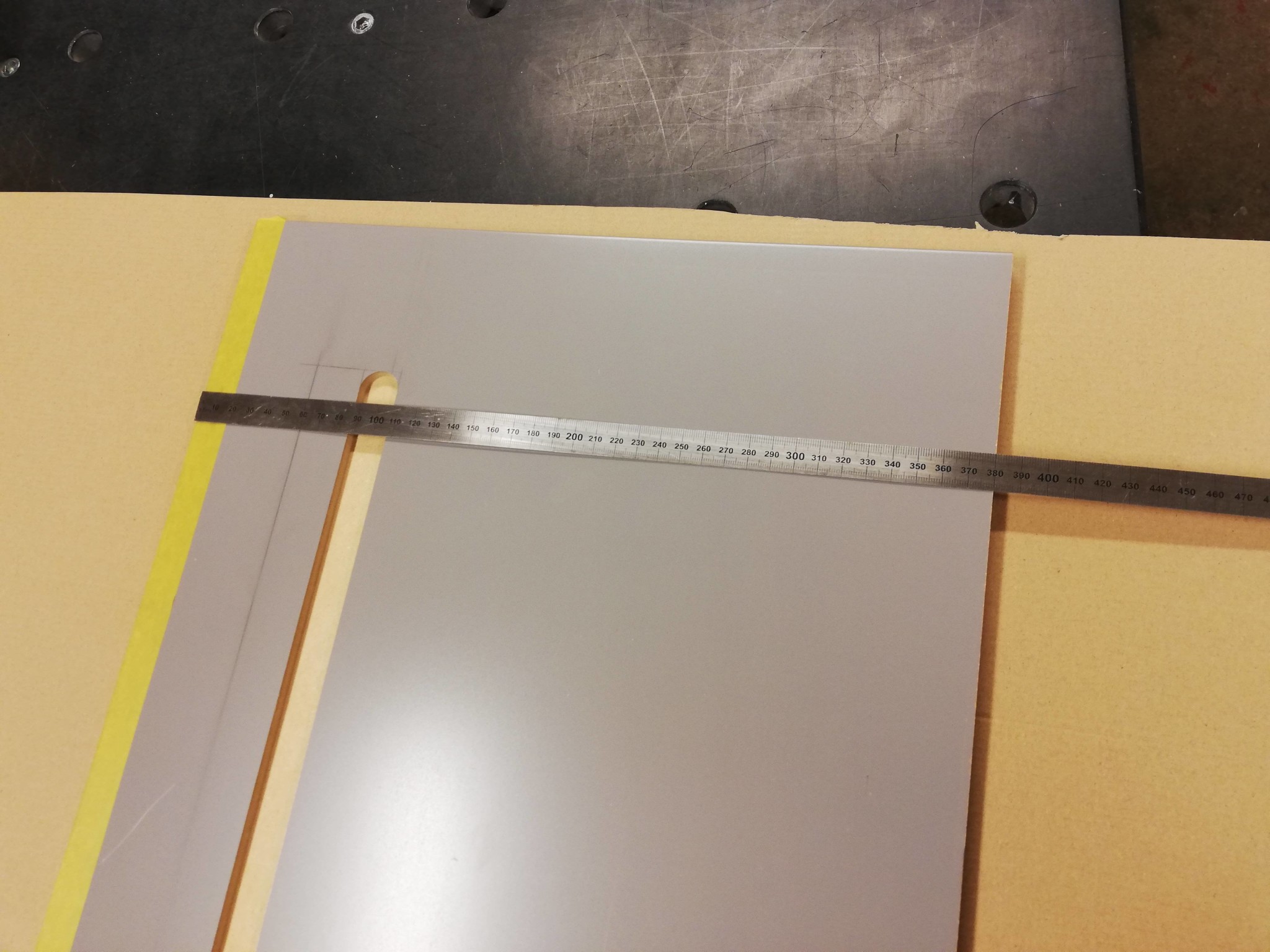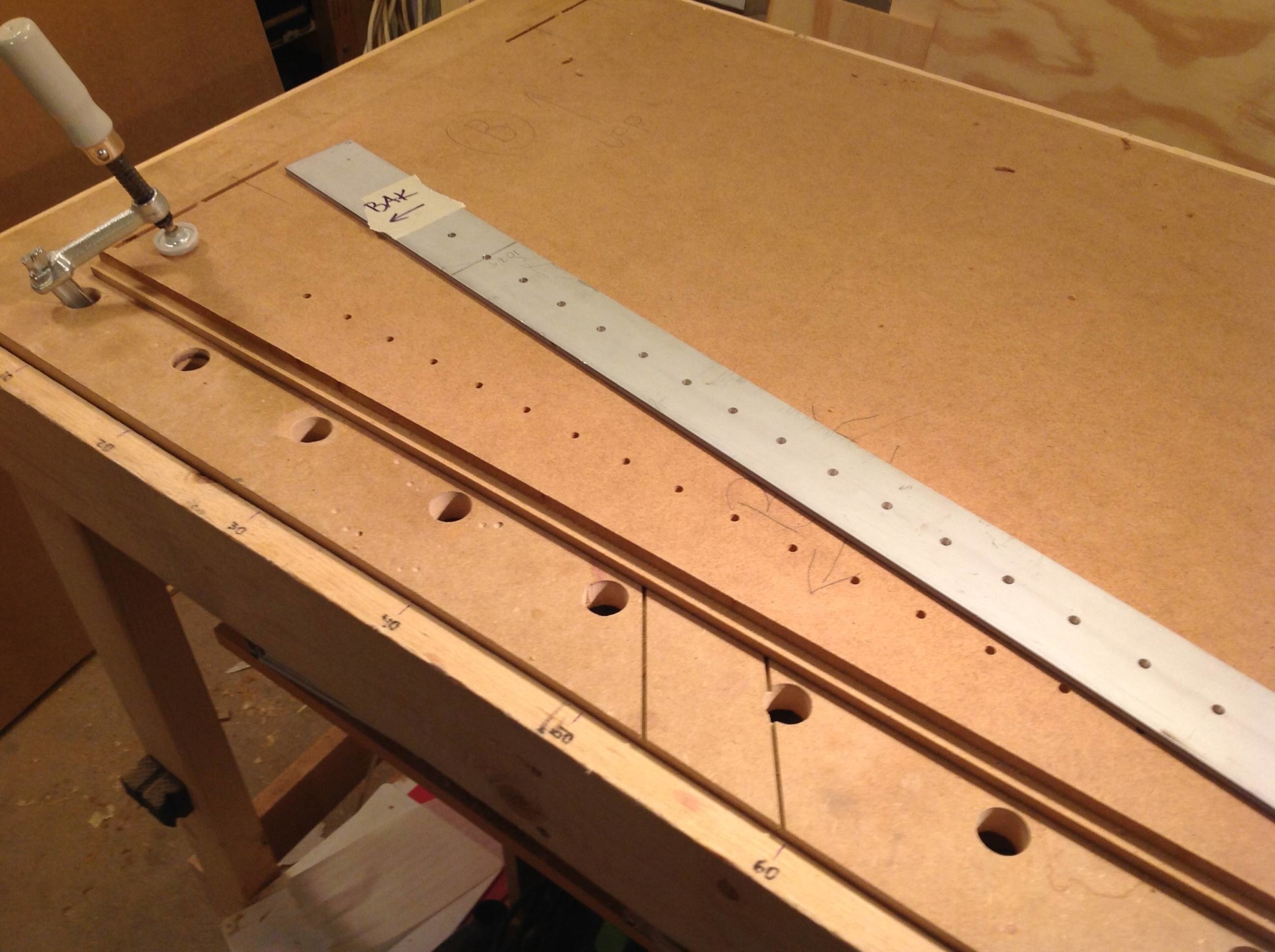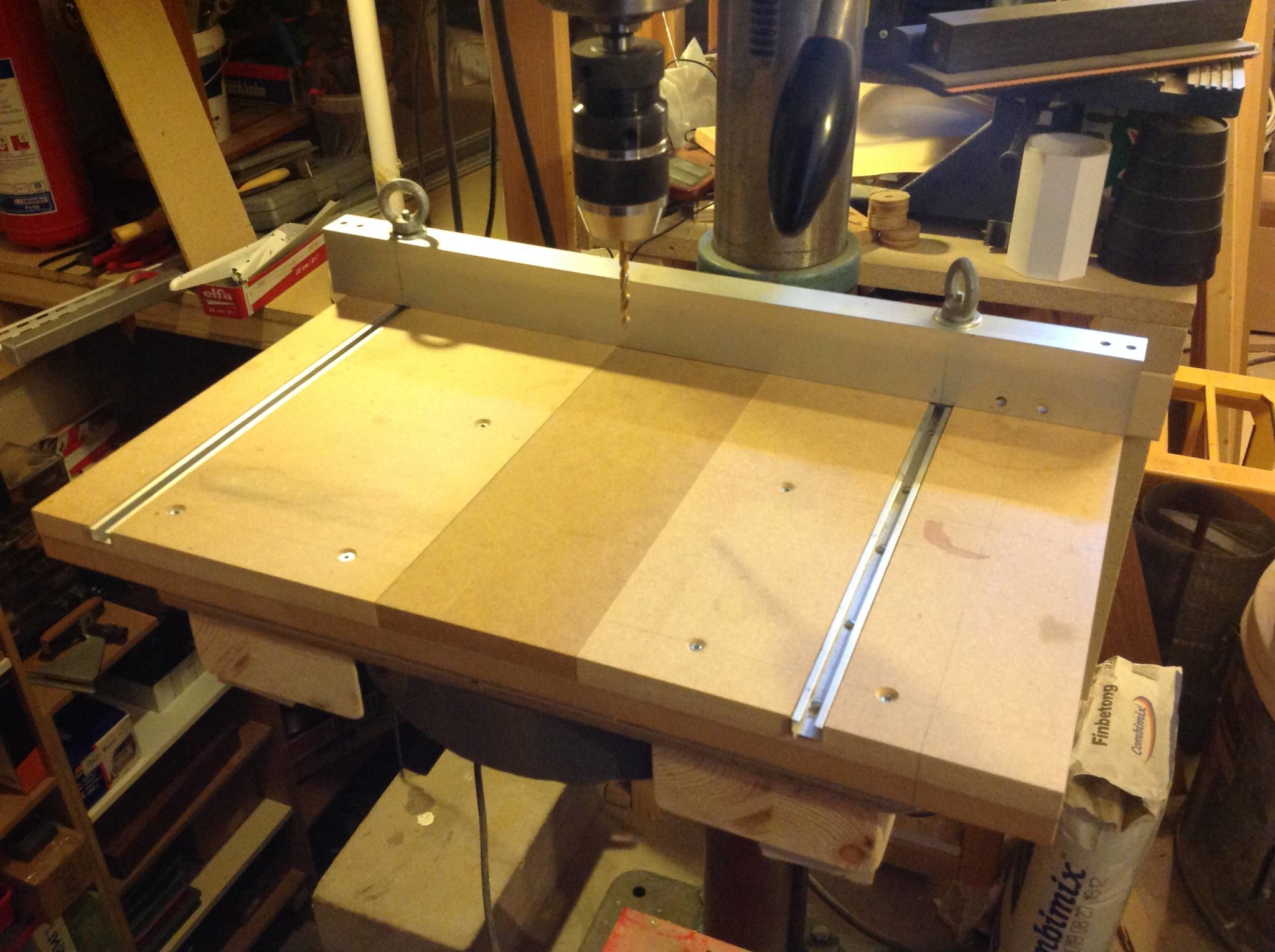 När bordet var på plats kunde jag rigga upp en anordning för att borra en ny hålmall i en aluminiumskena, en före detta gipsvinkel som inte var rätvinklig. Det är de ju iofs aldrig men nu blev den en riktigt värdefull resurs.