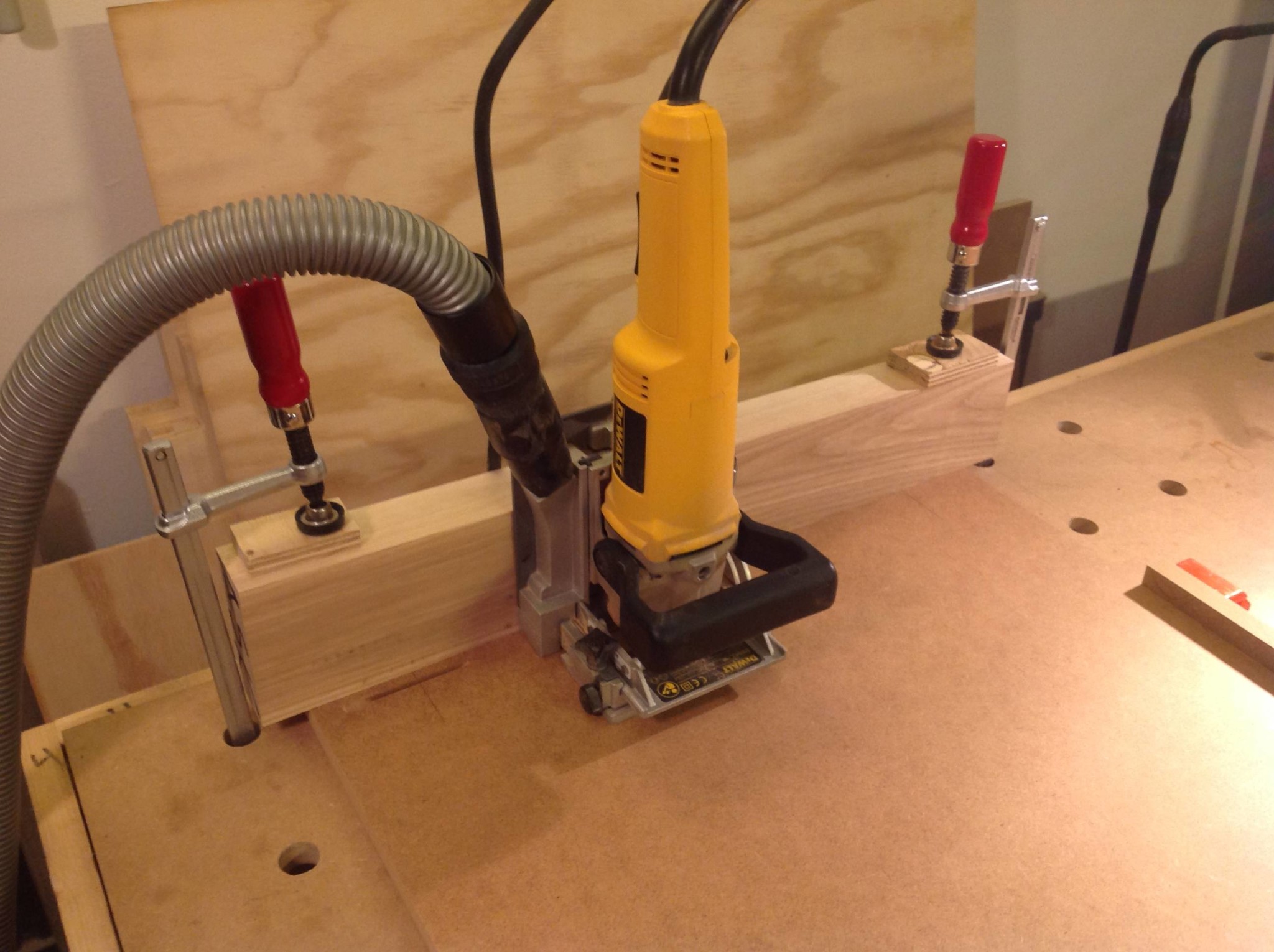Jobbar ofta med kilar och bitar att spänna mot i kombination med olika dogs i arbetsbänken, framför allt när det är flera ämnen som ska bearbetas på samma sätt. Satt som berget och var snabbt och enkelt att skifta.