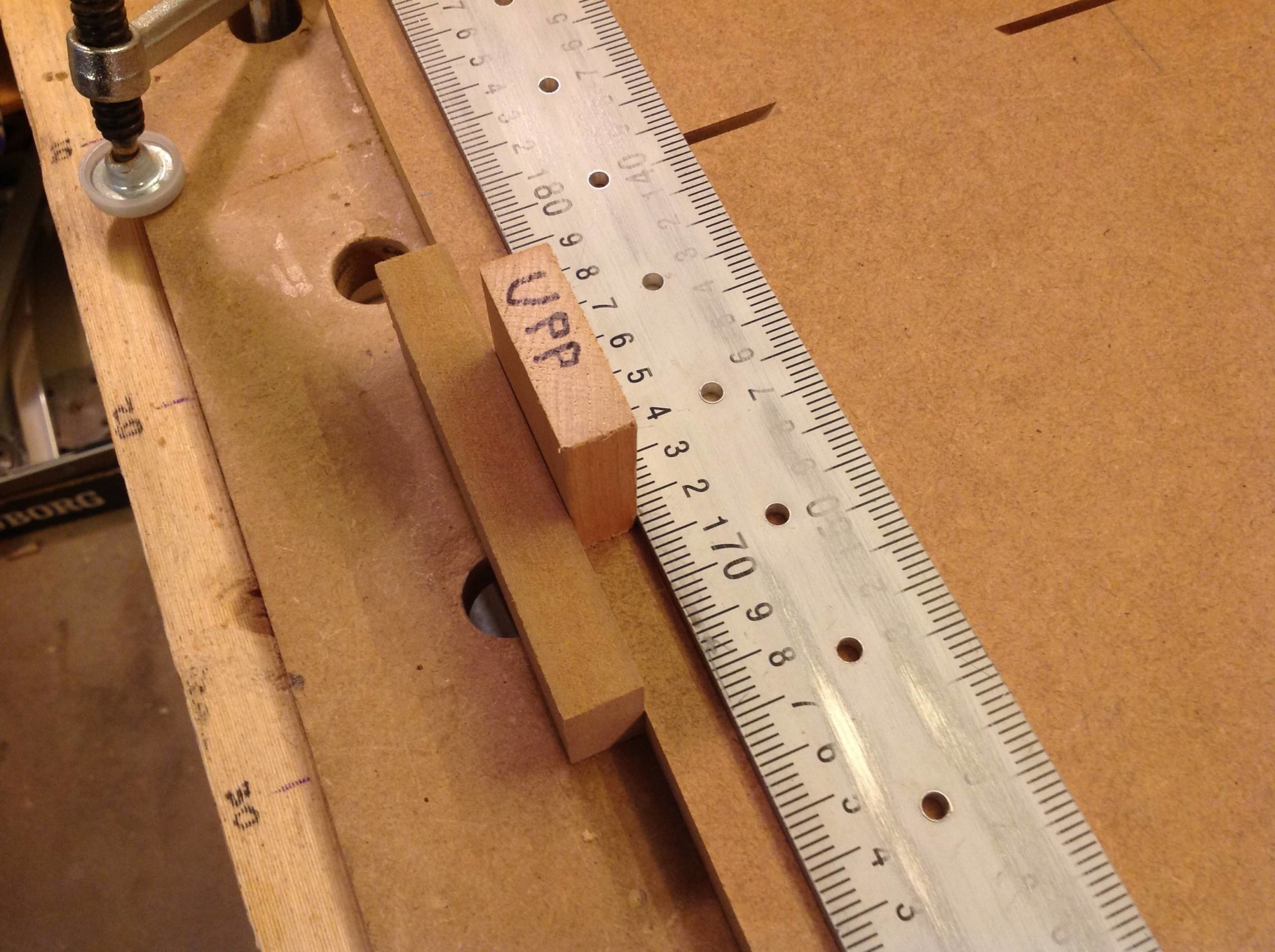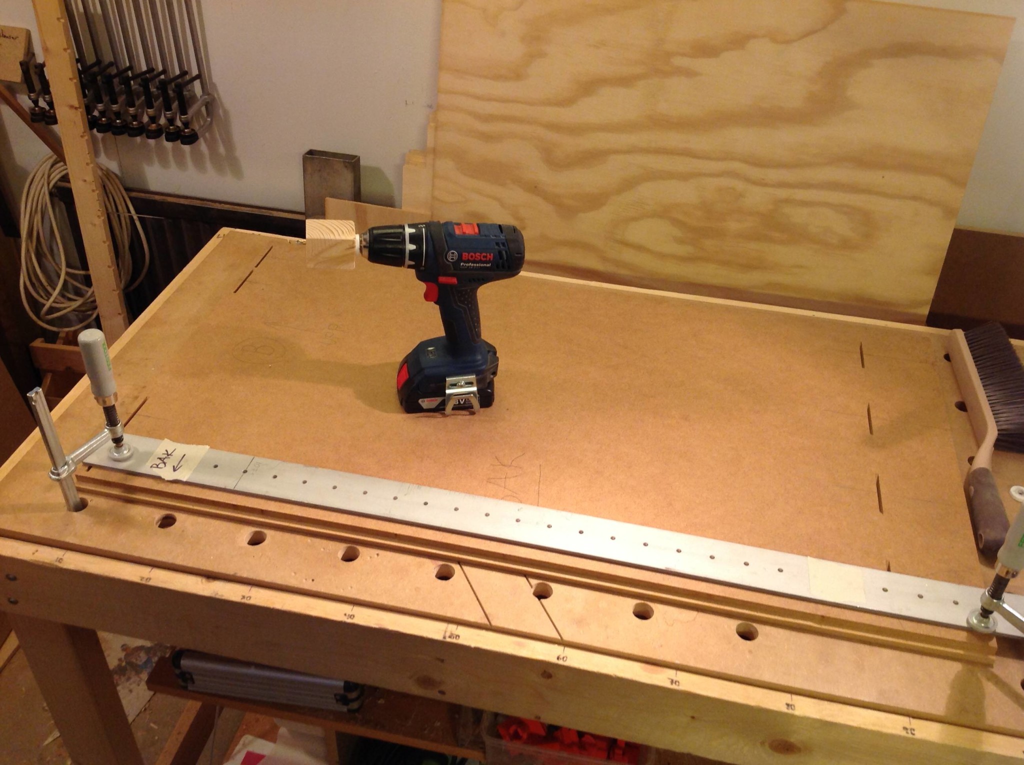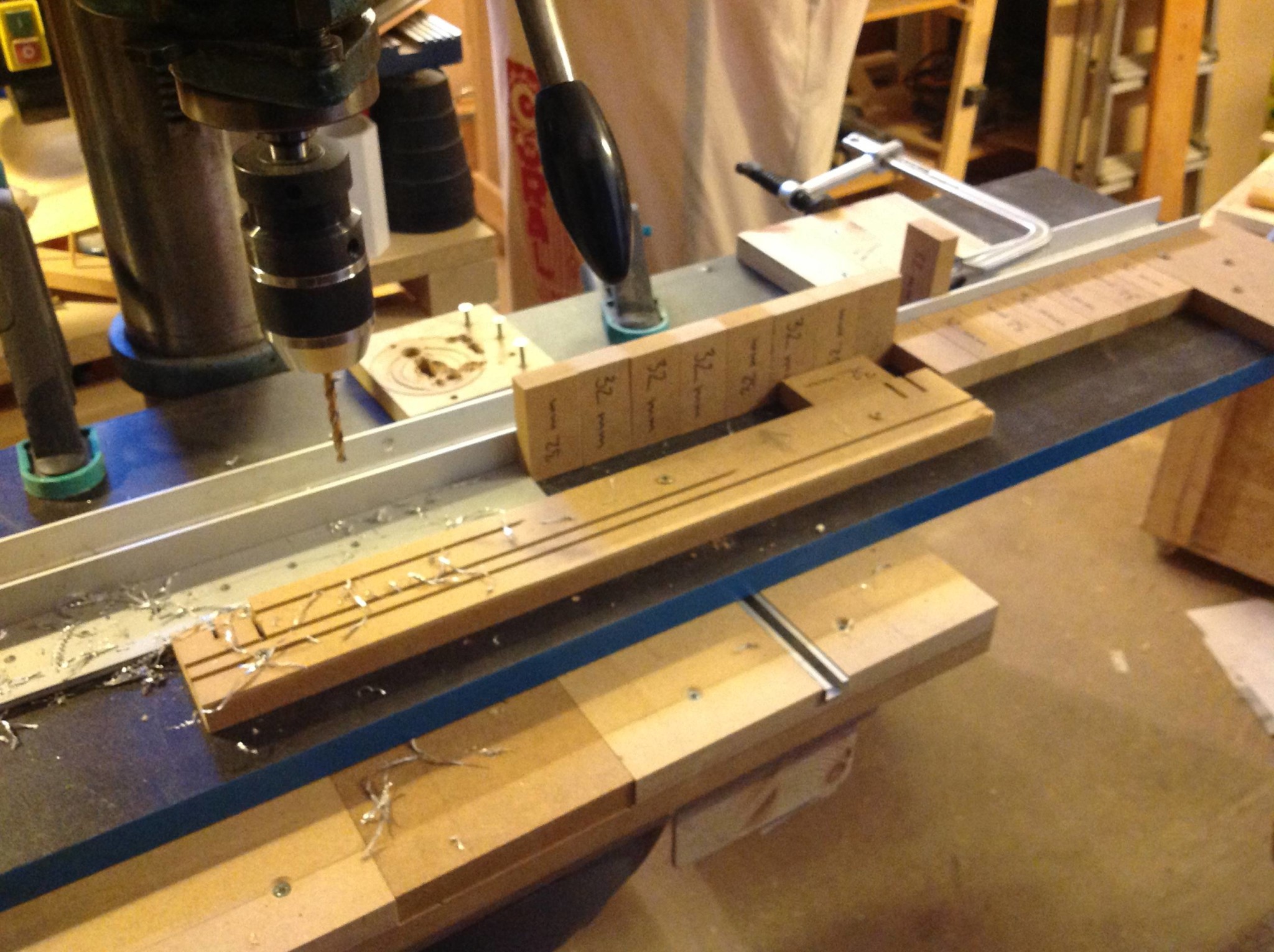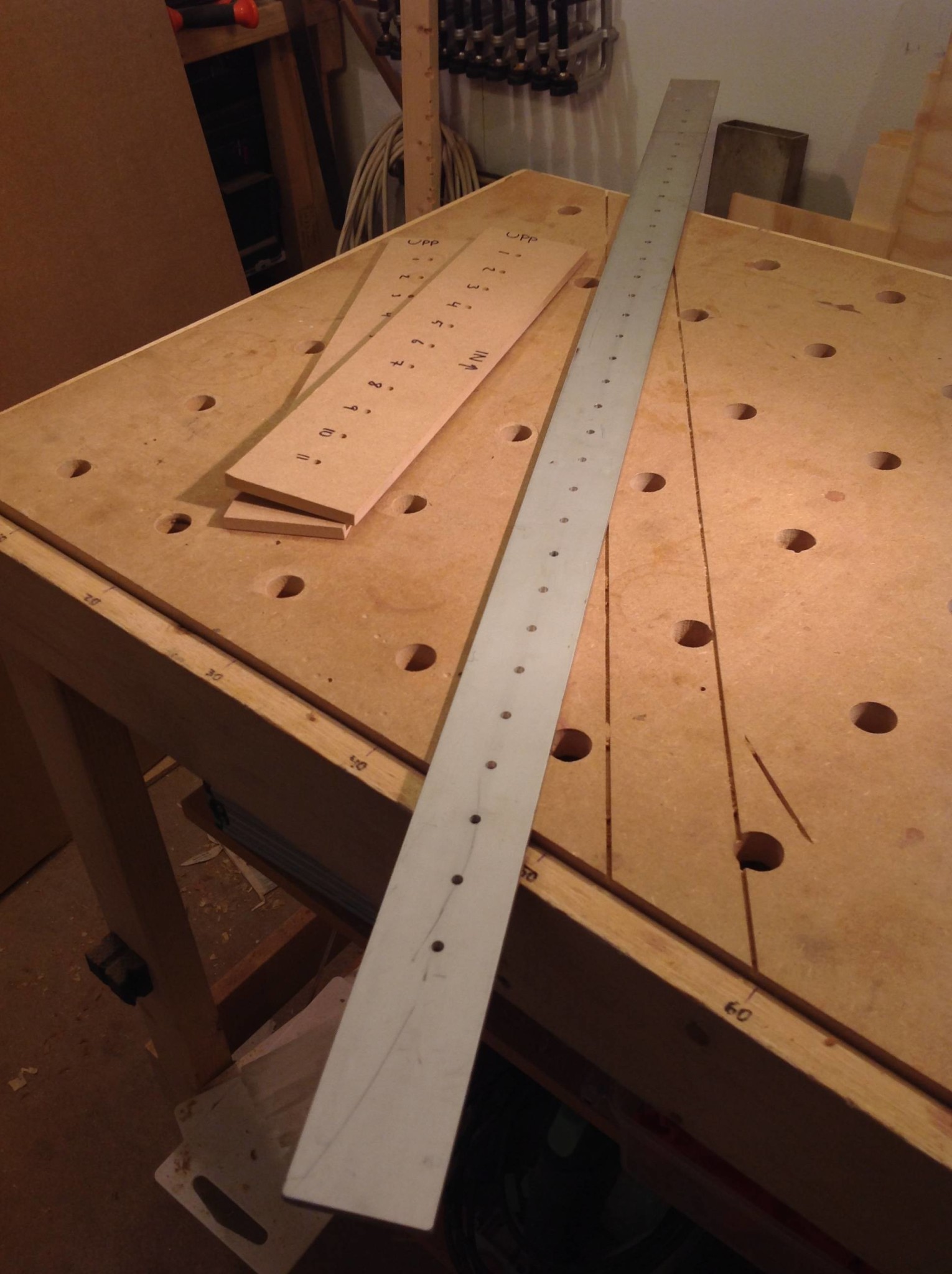 Ett långt hyllplan med en aluprofil som anhåll och en bit mdf för att hålla aluskenan på plats samt 32-millimeters distanser. Började med att lägga upp en räcka distanser framför skenan med början mot dess kortände och ett stopp i slutet av distanserna. Sedan borra första hålet, ta bort närmsta distansen och flytta fram skenan till nästa distans borra nytt hål och upprepa proceduren.