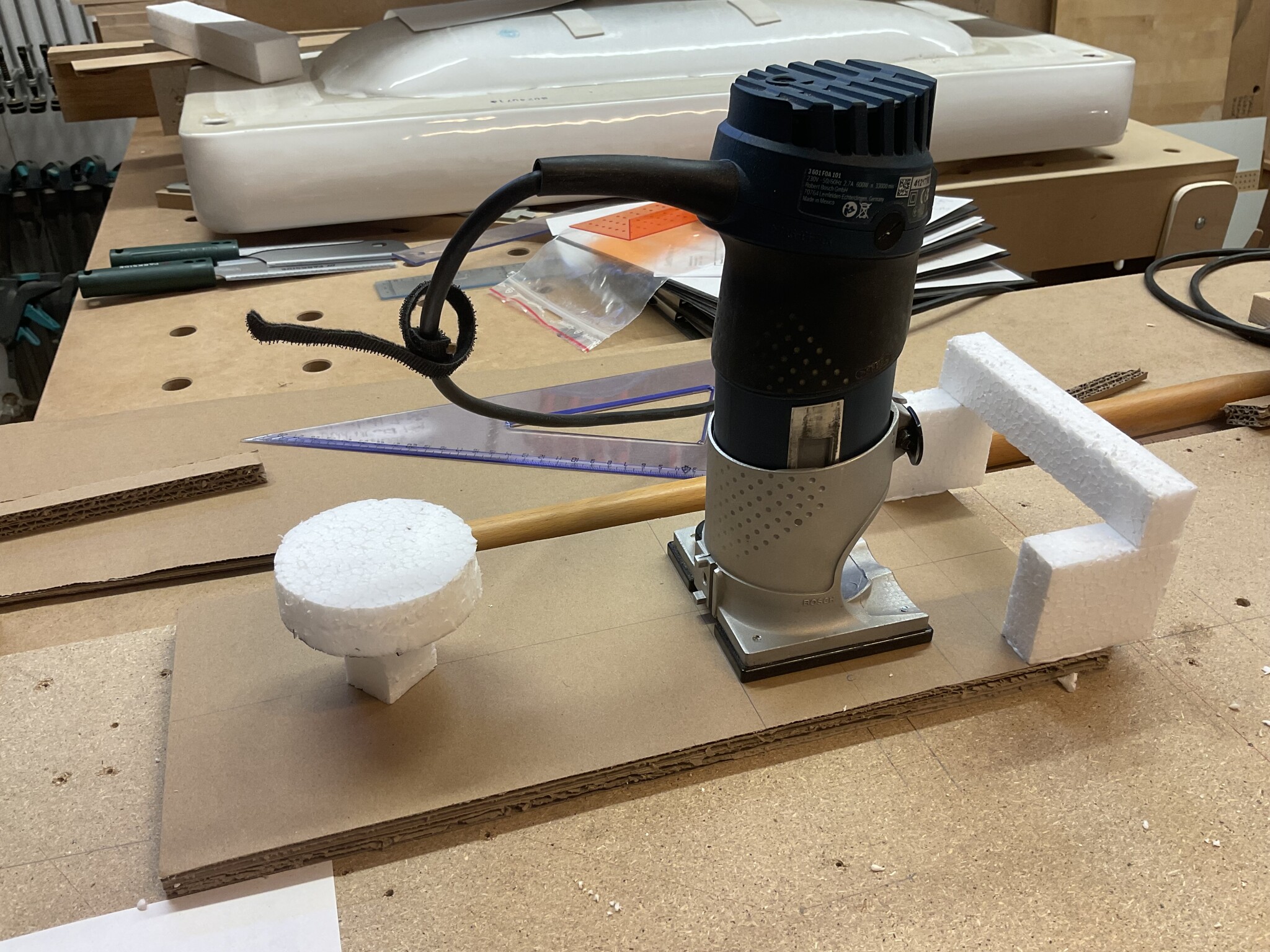 Ett runt handtag bak och ett bygelformat fram verkar vettigare. Då kontrollerar jag fräsningarna från ändarna av jiggen och bör ha bättre kontroll. Lite ”torrsim” förstärker känslan.