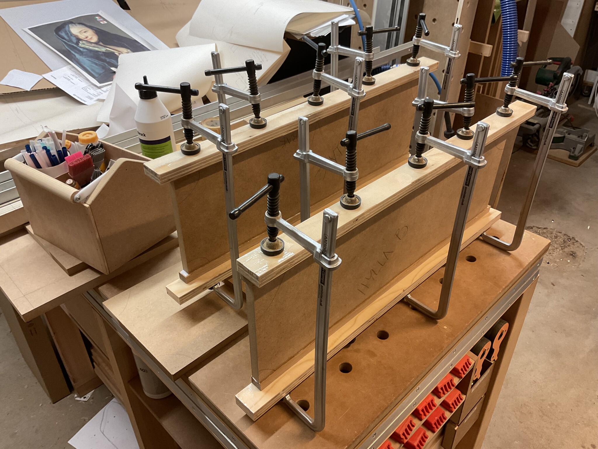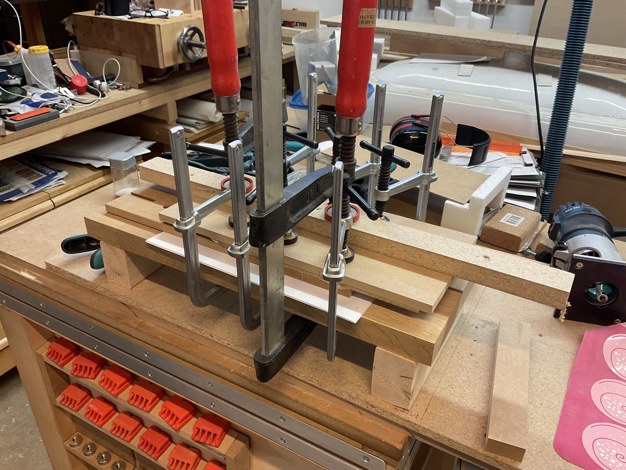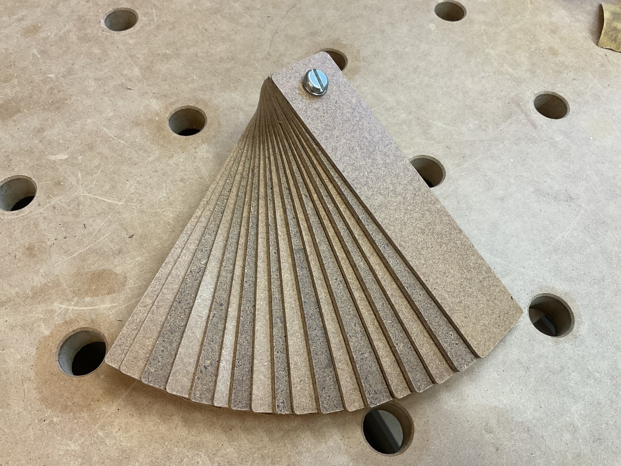 16 mm mdf med lite böj i sig limmades ”konkavt mot konkavt” vid en plan yta och resultatet blev helt plana arbetsstycken. Jipppiiee!