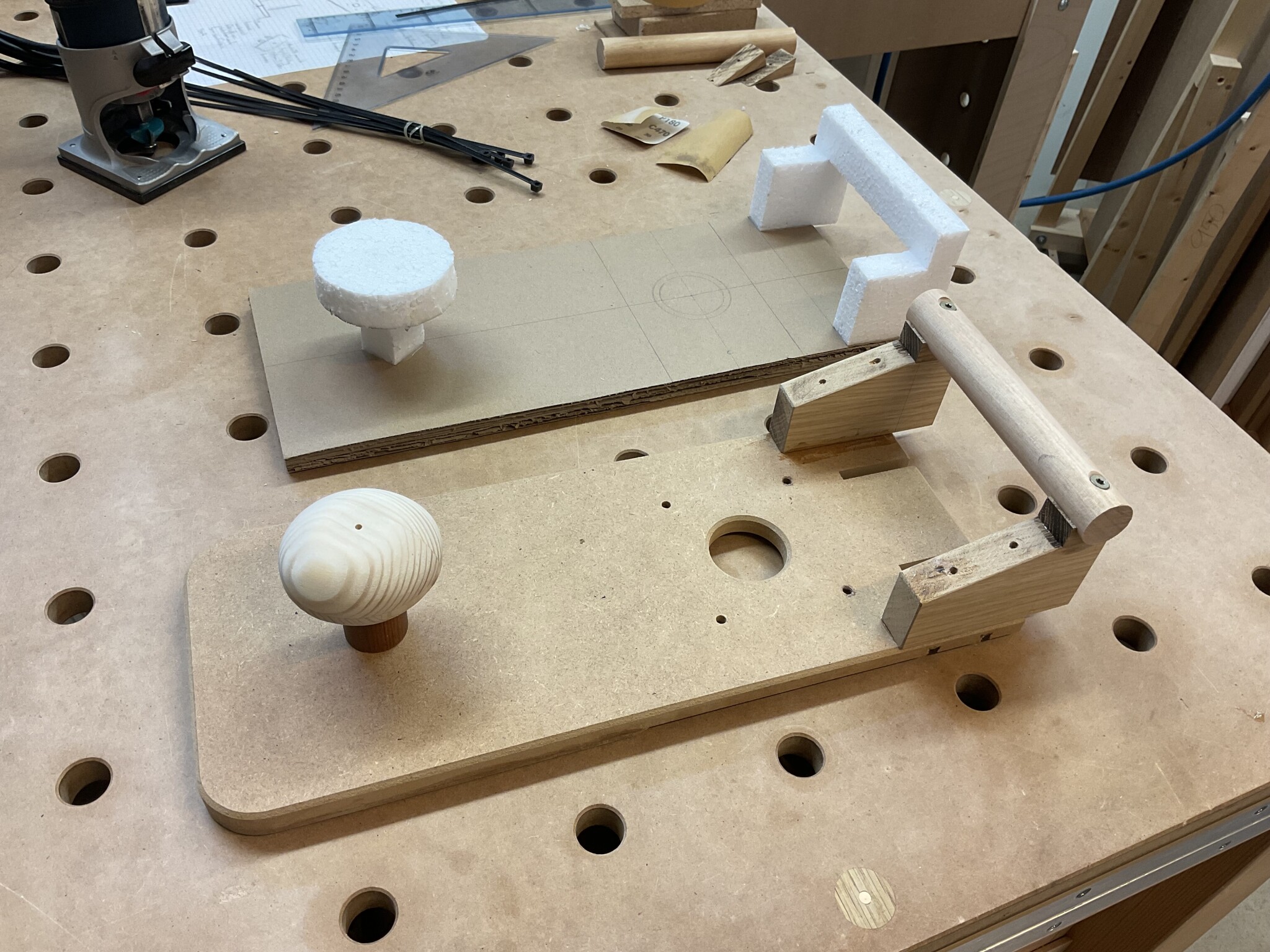 Prototyp och färdigt resultat sida vid sida. Handfilad knopp och ett fult handtag i björk och ek; känns faktiskt bra och jag tror att det blir relativt enkelt att hålla tyngden på knoppen och bara styra fräsningen med handtaget.