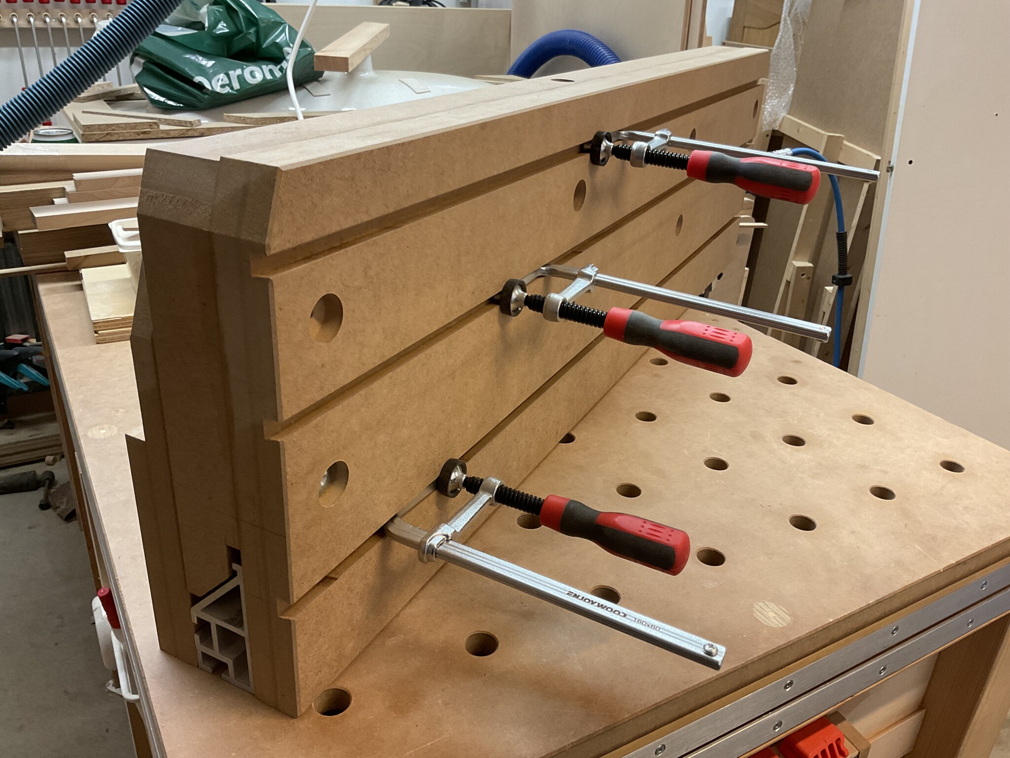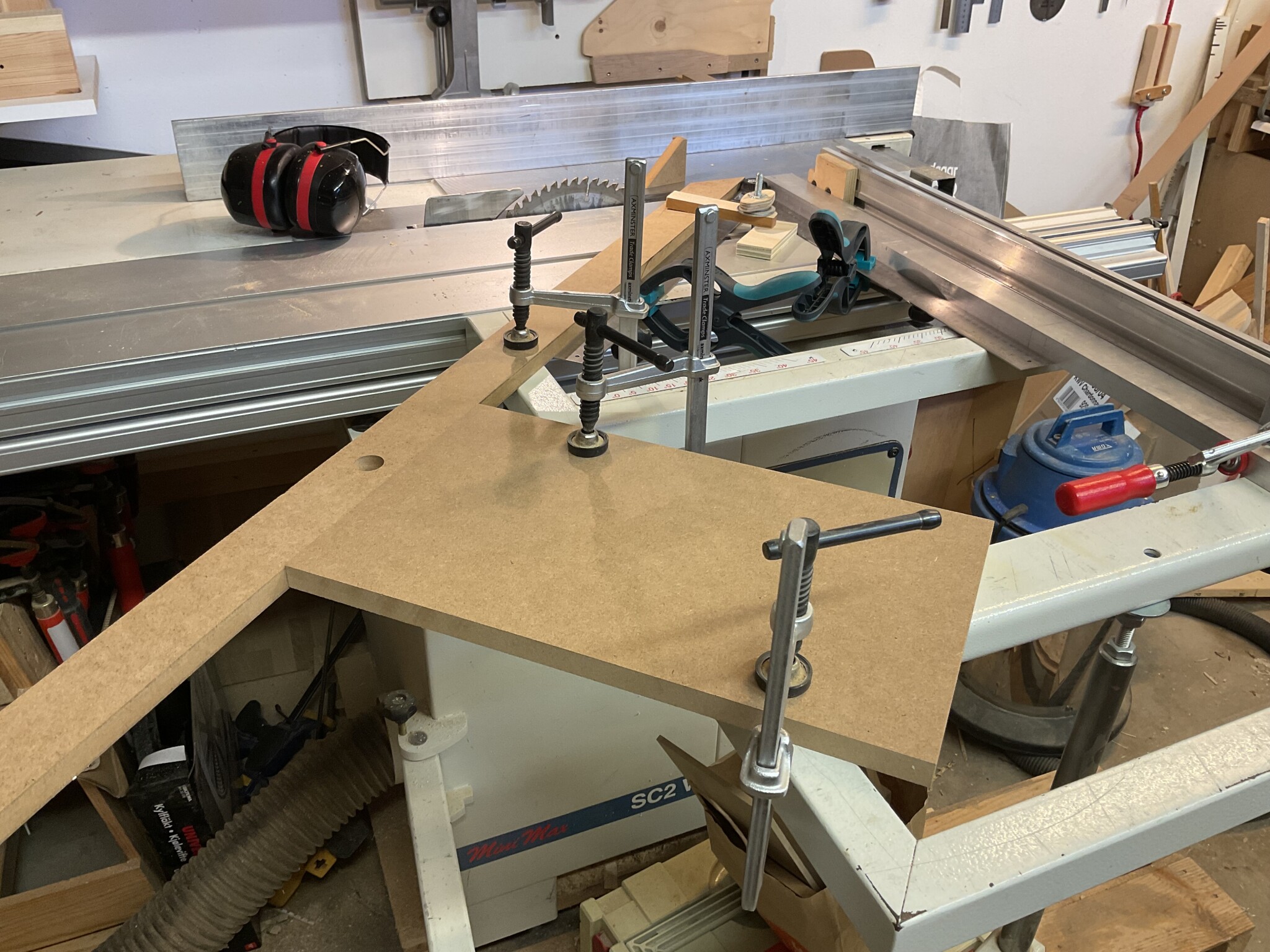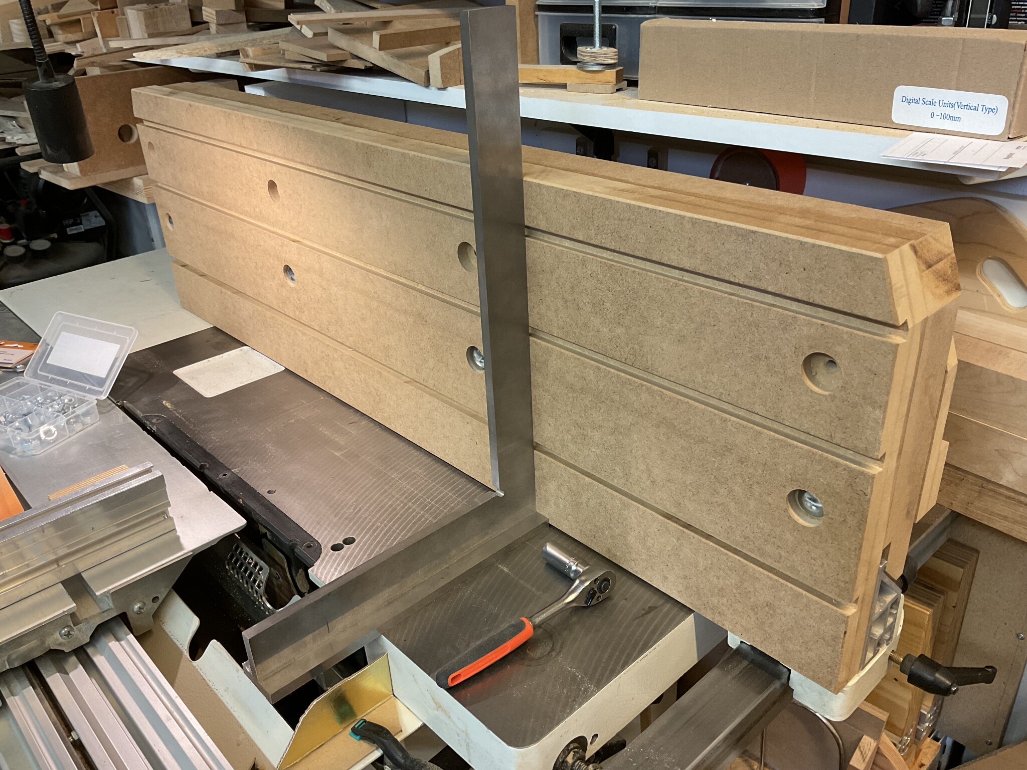 Det höga anhållet ska bestå av två halvor så att jag ska kunna säkerställa att det är 90 grader mot sågbordet genom att shimsa om nödvändigt. För att skapa styvhet är den ”främre” halvan av anhållet uppstyvad med mdf-lister som skapar en torsionbox av anhållet när det är komplett.