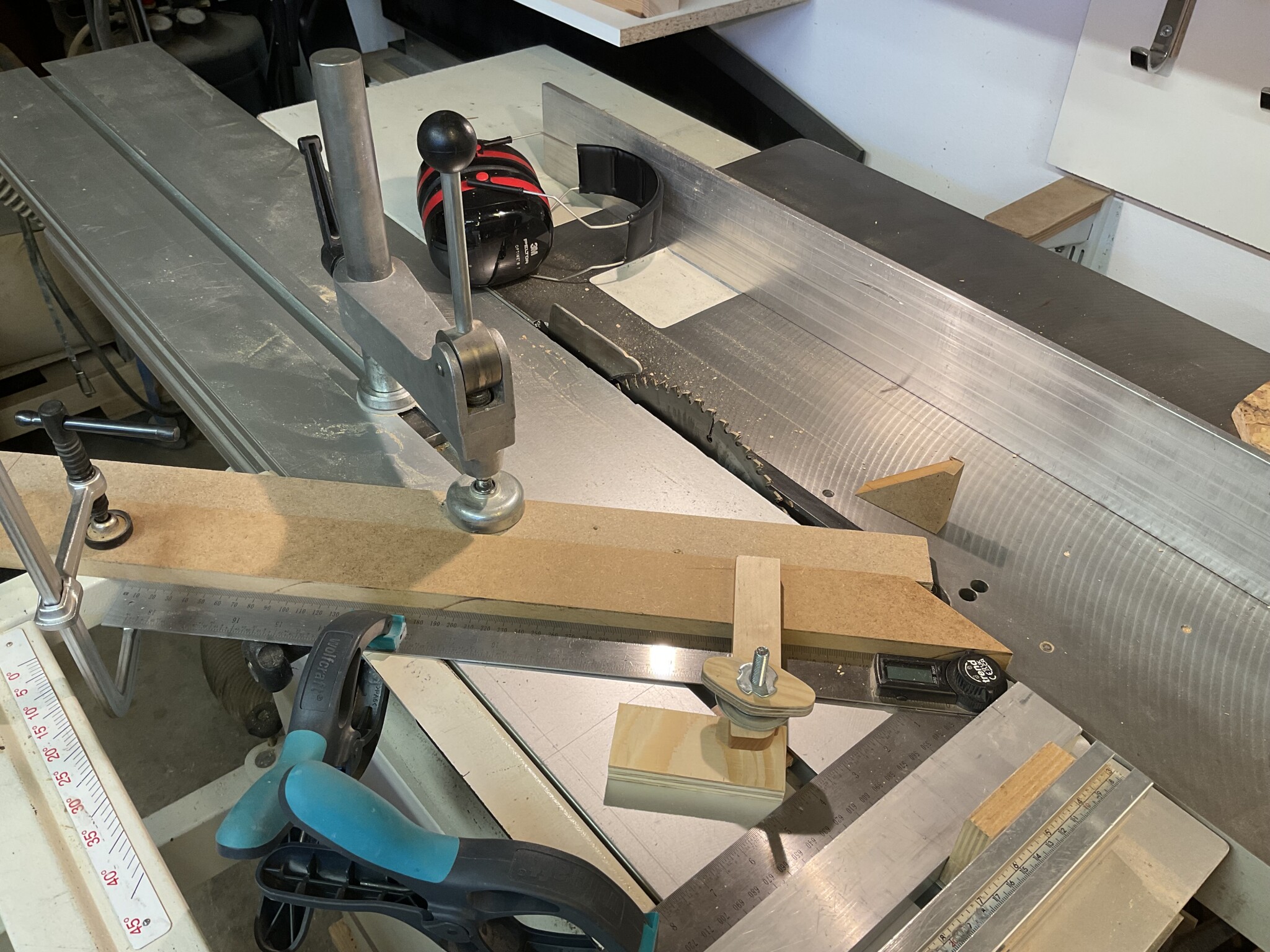 En helt parallell mdf-remsa utgör anhåll som kapas vilket ger mig en zero-clearence ände mot sågklingan eller hur man nu ska säga.