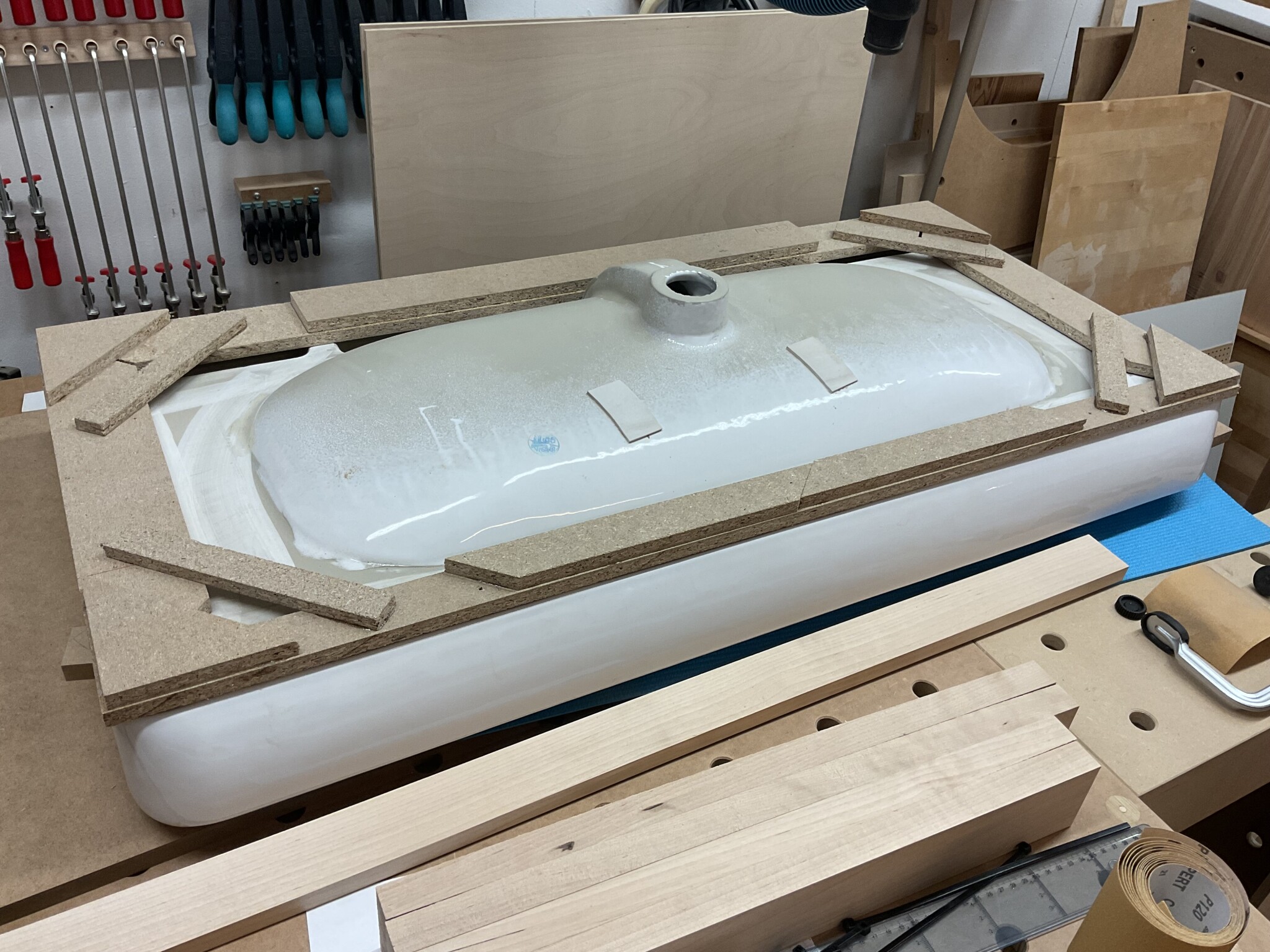Gjort en dummy-ram till badrumskommoden för att fastställa måtten — tvättfatet är så klart inte rätvinkligt någonstans.