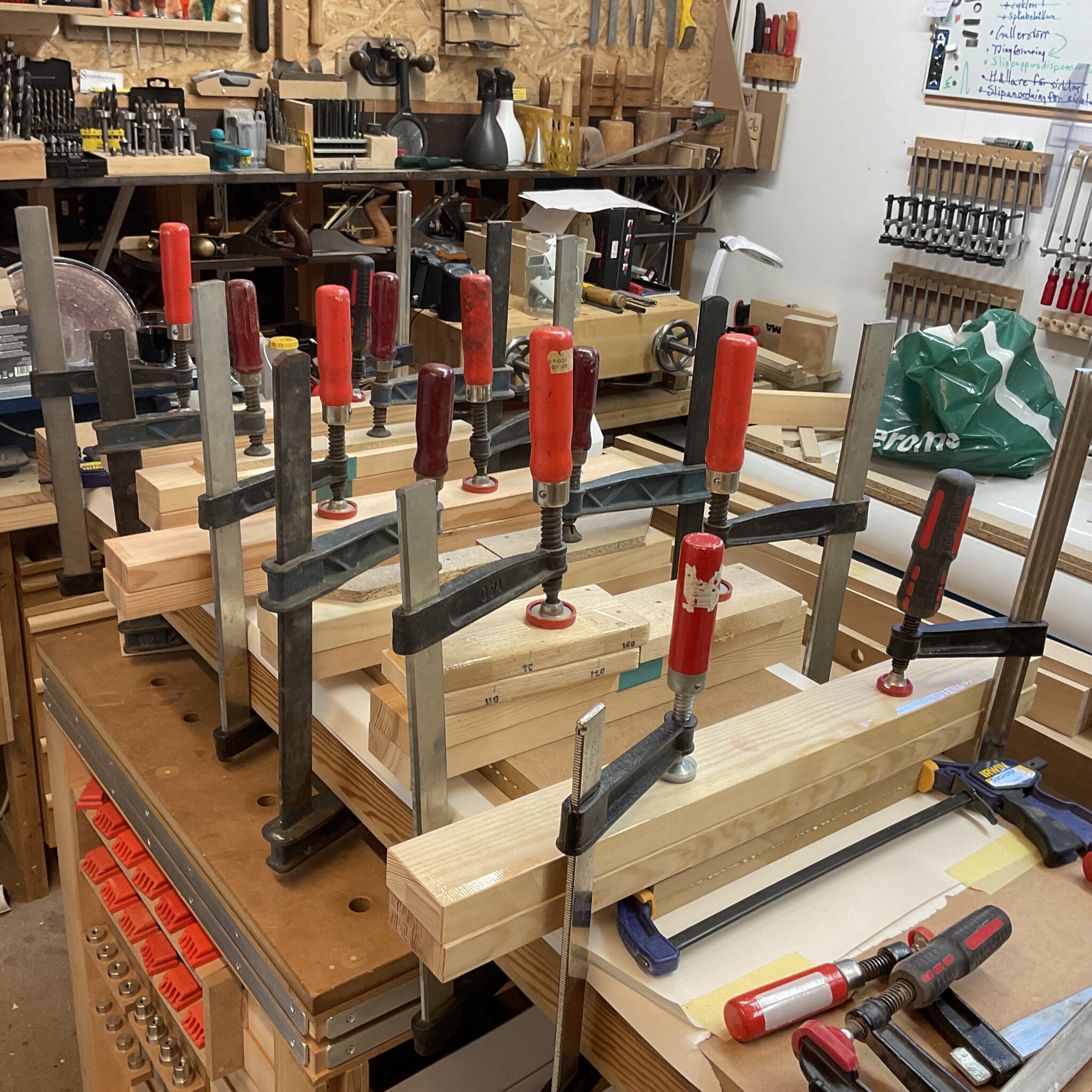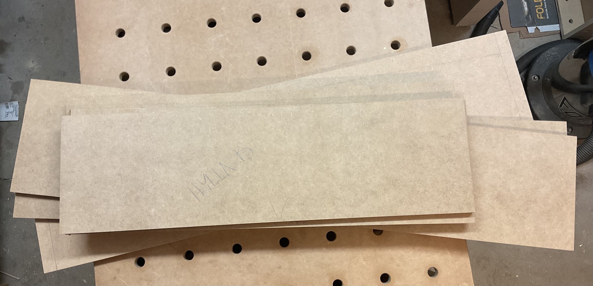 Toppskivan har en kurva i framkanten och hyllan under ska följa den kurvan så den hyllan fick dubbla eklister i framkant för att ha lite ”kött” kvar när kurvan var fräst.