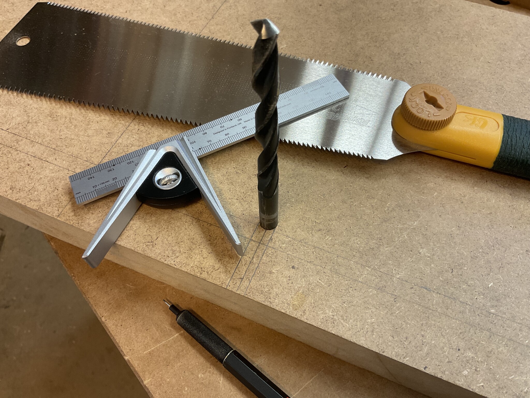 Samma borr som gjorde hålen, en vinkel och en japansåg med några defekta tänder dessvärre ska åstadkomma slitsarna för de fem M8 vagnsbultarna som fäster det höga anhållet vid det vanliga.