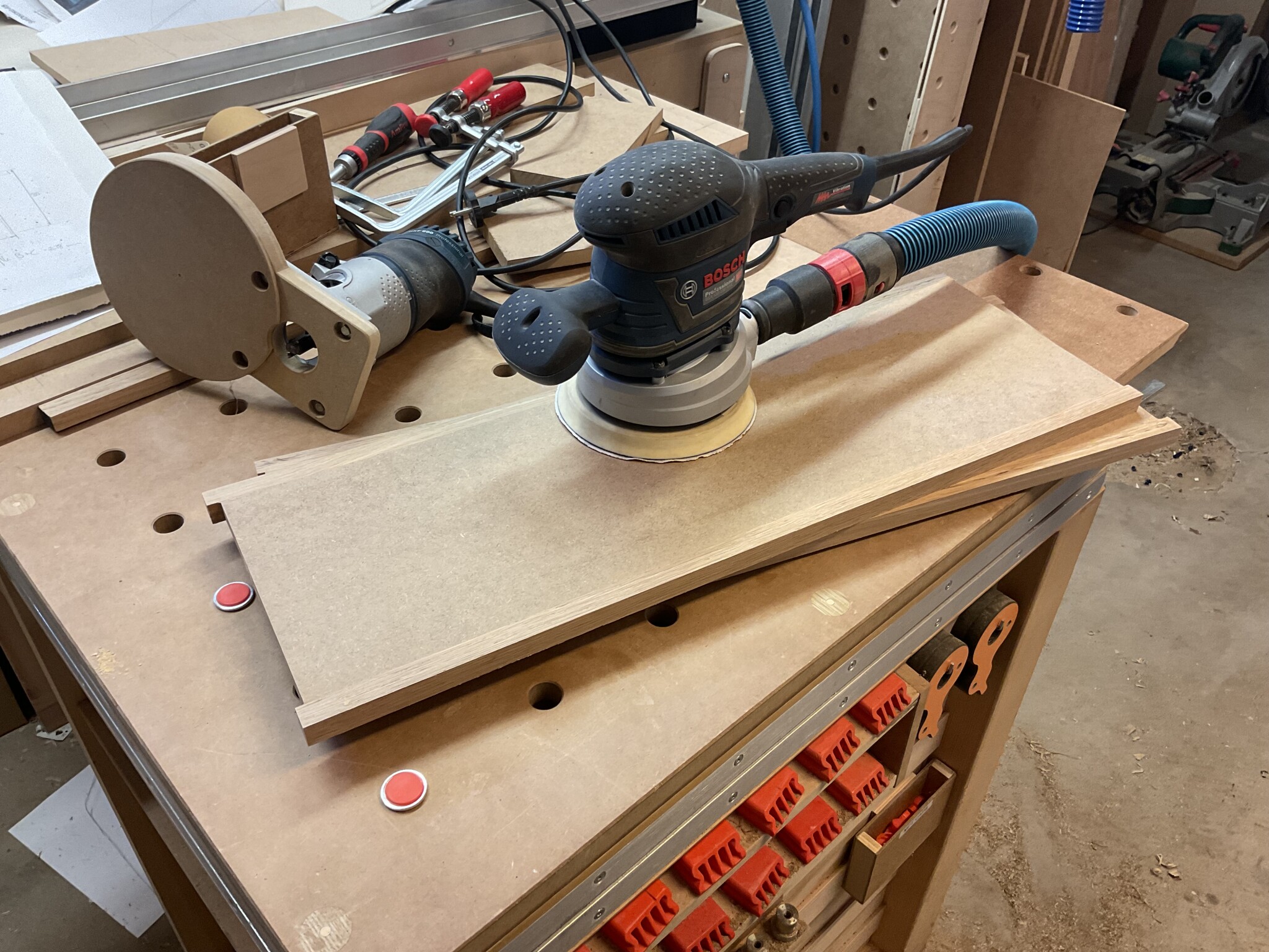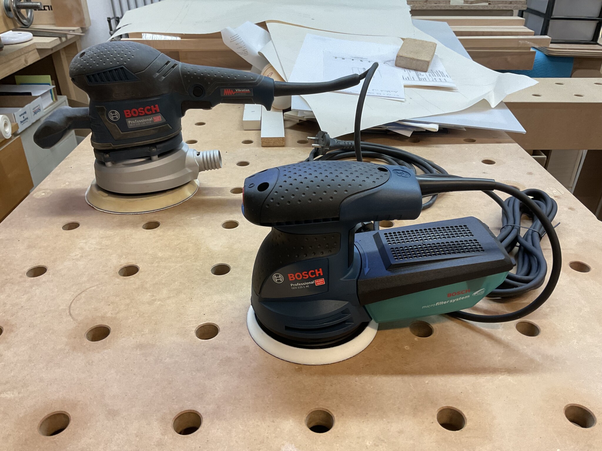 Kan ju berätta att då och då på mina resor söderöver får jag möjlighet att använda en Festool ETS (tror jag den heter) i ett utförande som inte längre tillverkas — en helt underbar excenterslip. Lätt, kompakt och smidig, 150 mm slipsula och effektiv som bara den. Den hade varit mitt val varje dag i veckan! Annars en Mirka Deros som också finns där men den är för dyr för mig även om den går att köpa ny till skillnad från Festoolen.