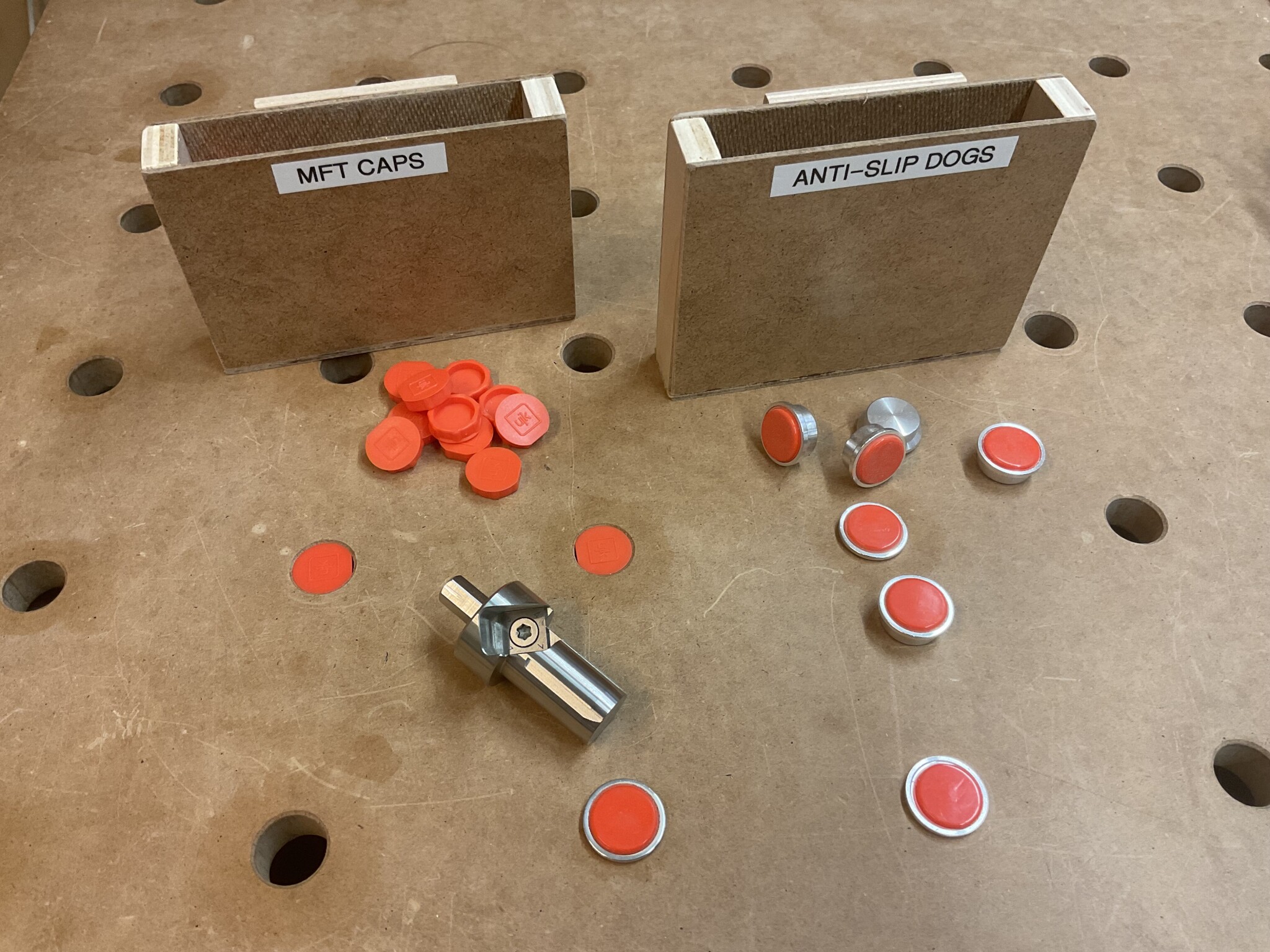 I början av sommare upptäckte jag att det runnit lim ner i några dog holes på arbetsbänken vilket gjorde att dogsen inte gick i. Samtidigt blev jag sugen på ”Anti-slip dogs” och MFT-caps från ujk så jag lätt Swedendro leverera 16 st av de första och 40 st av de andra samt en en tjusig ”brotsch och avfasningsverktyg” för att hantera limproblemet i skivans hål.