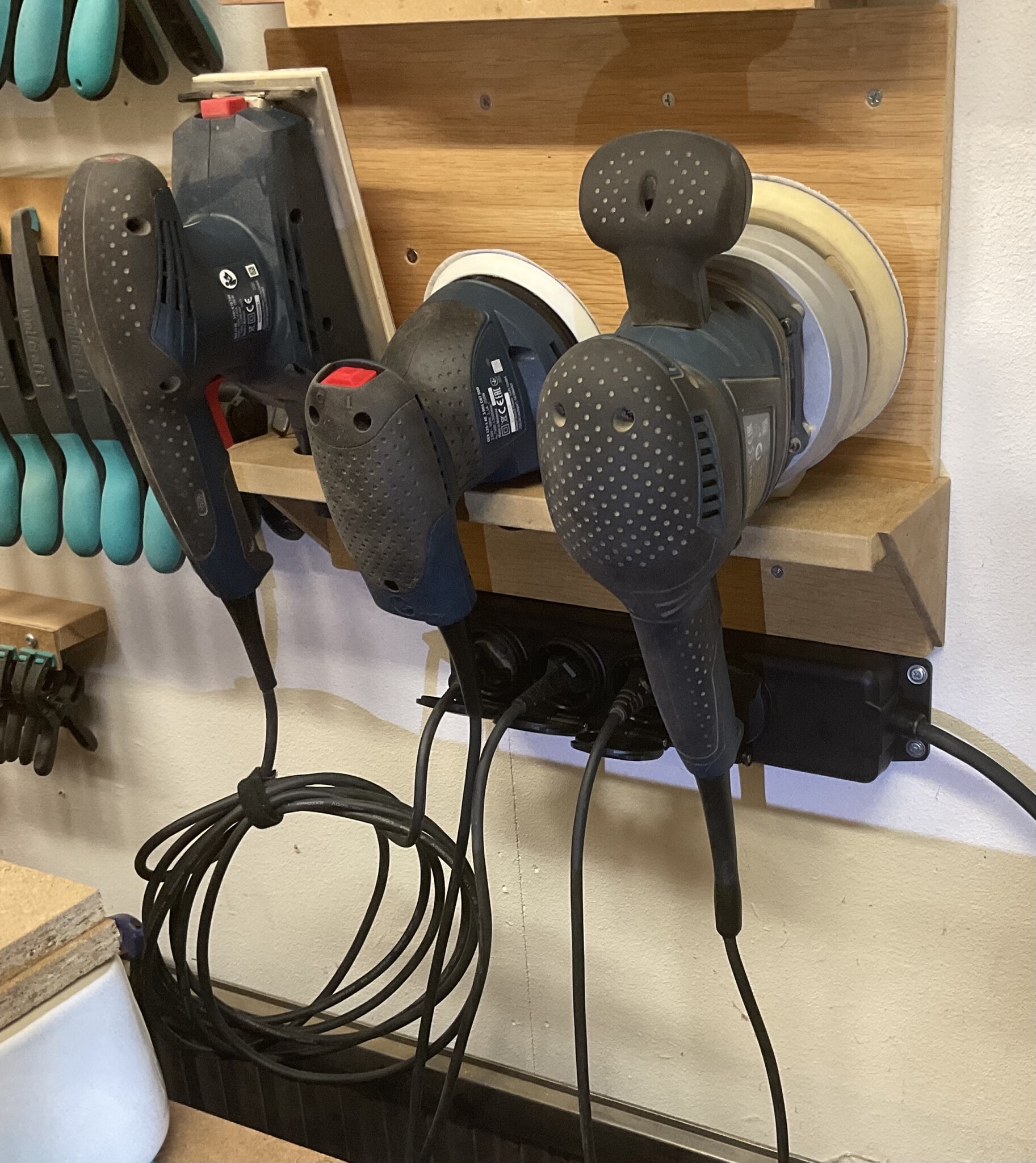 Gjorde en enkel hylla med tre hål; slipmaskinerna har ju alla rör i aktern för dammsugarslangen och det är med hjälp av dessa jag förvarar dem på hyllan.