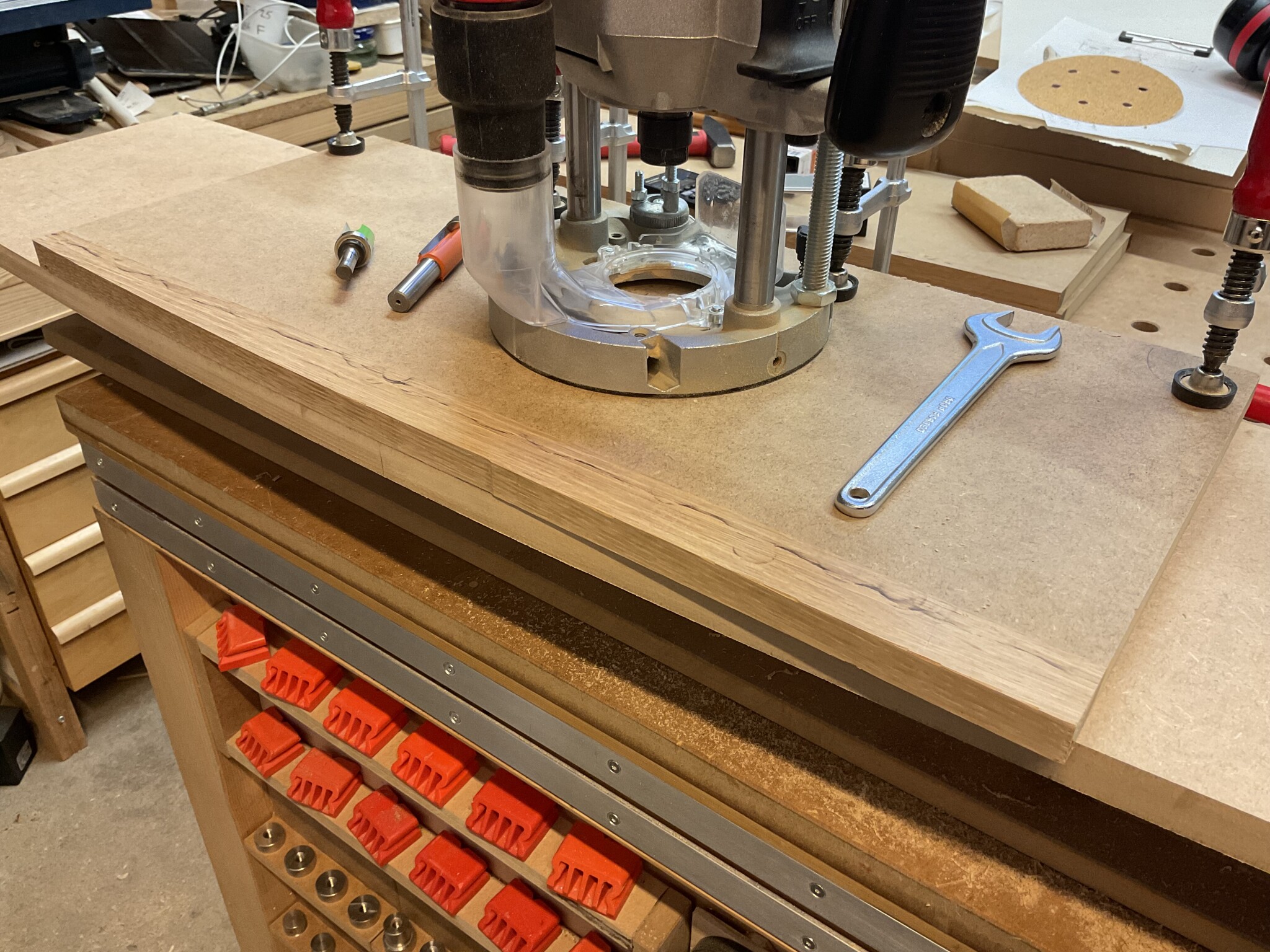 Gammalt och slött frässtål gav mycket brännmärken i eken men det saknar betydelse eftersom side boardet ska målas.