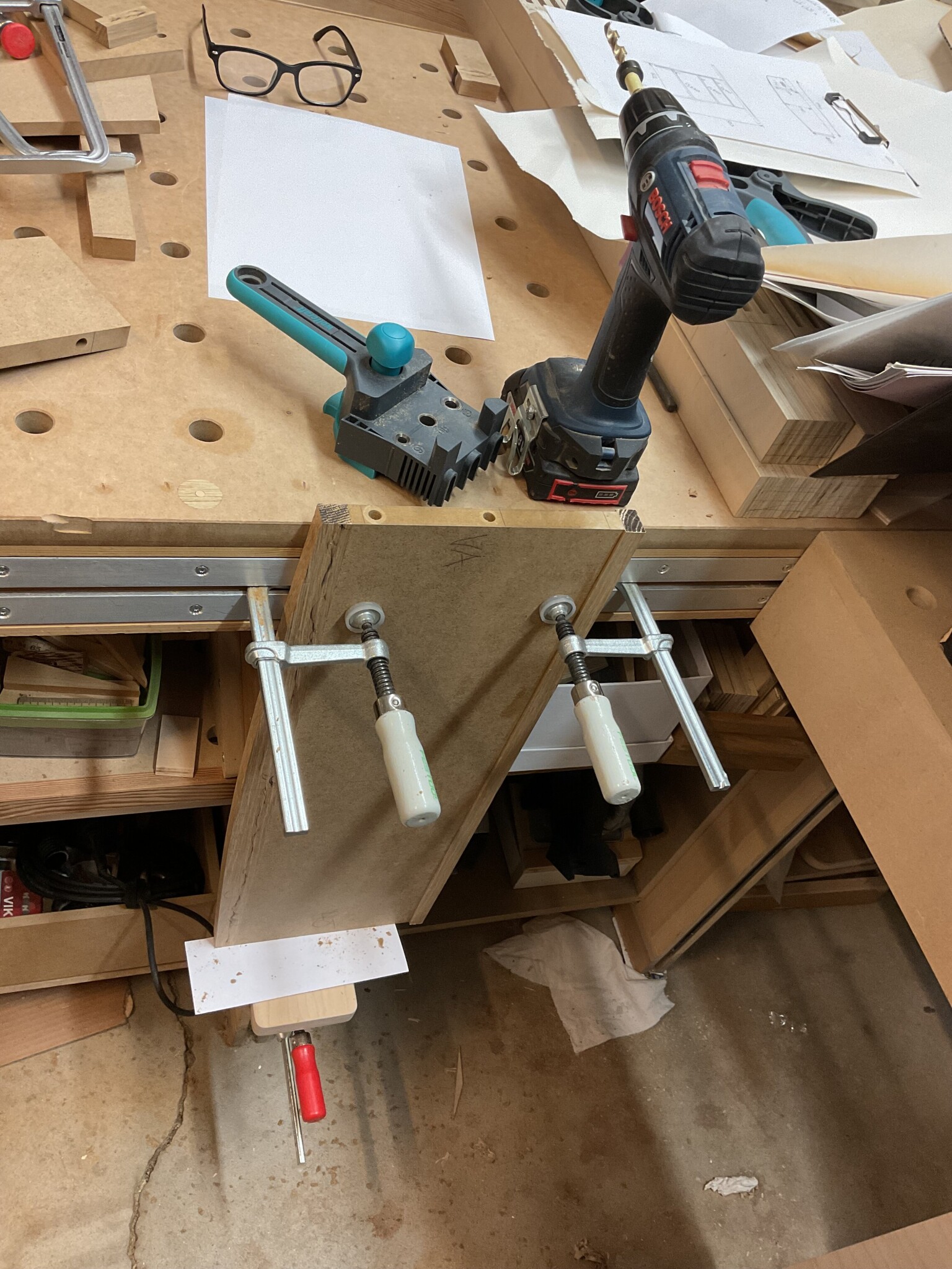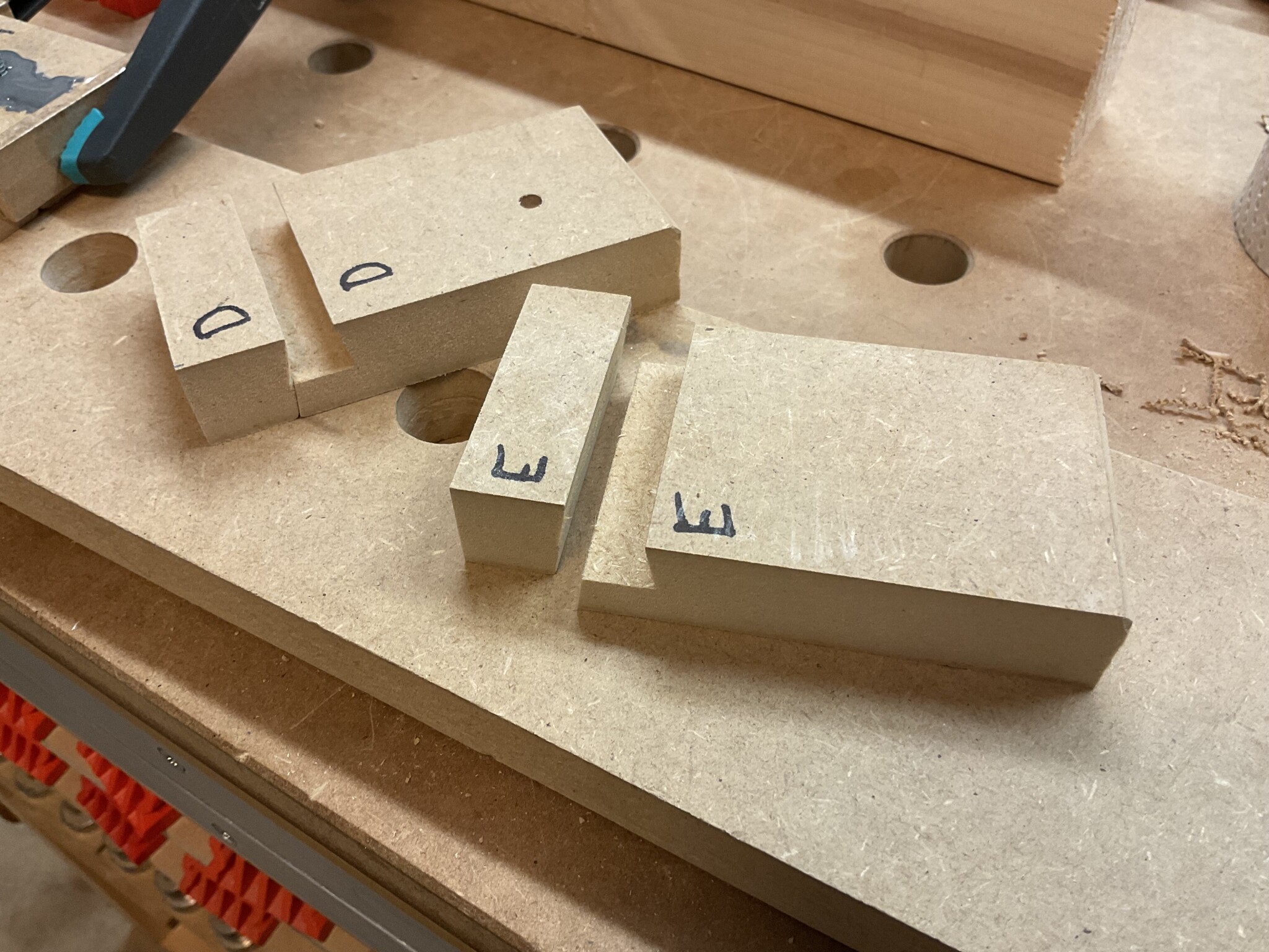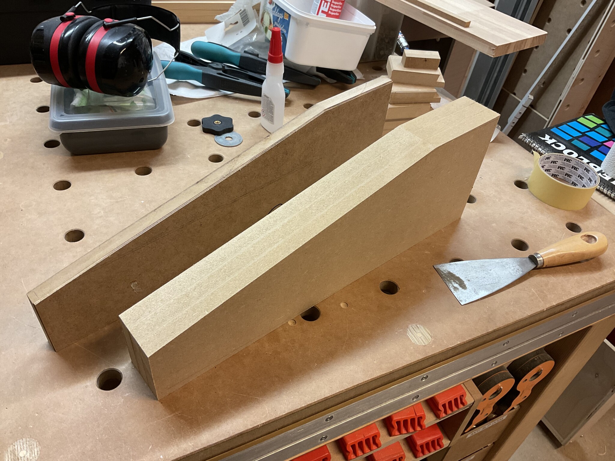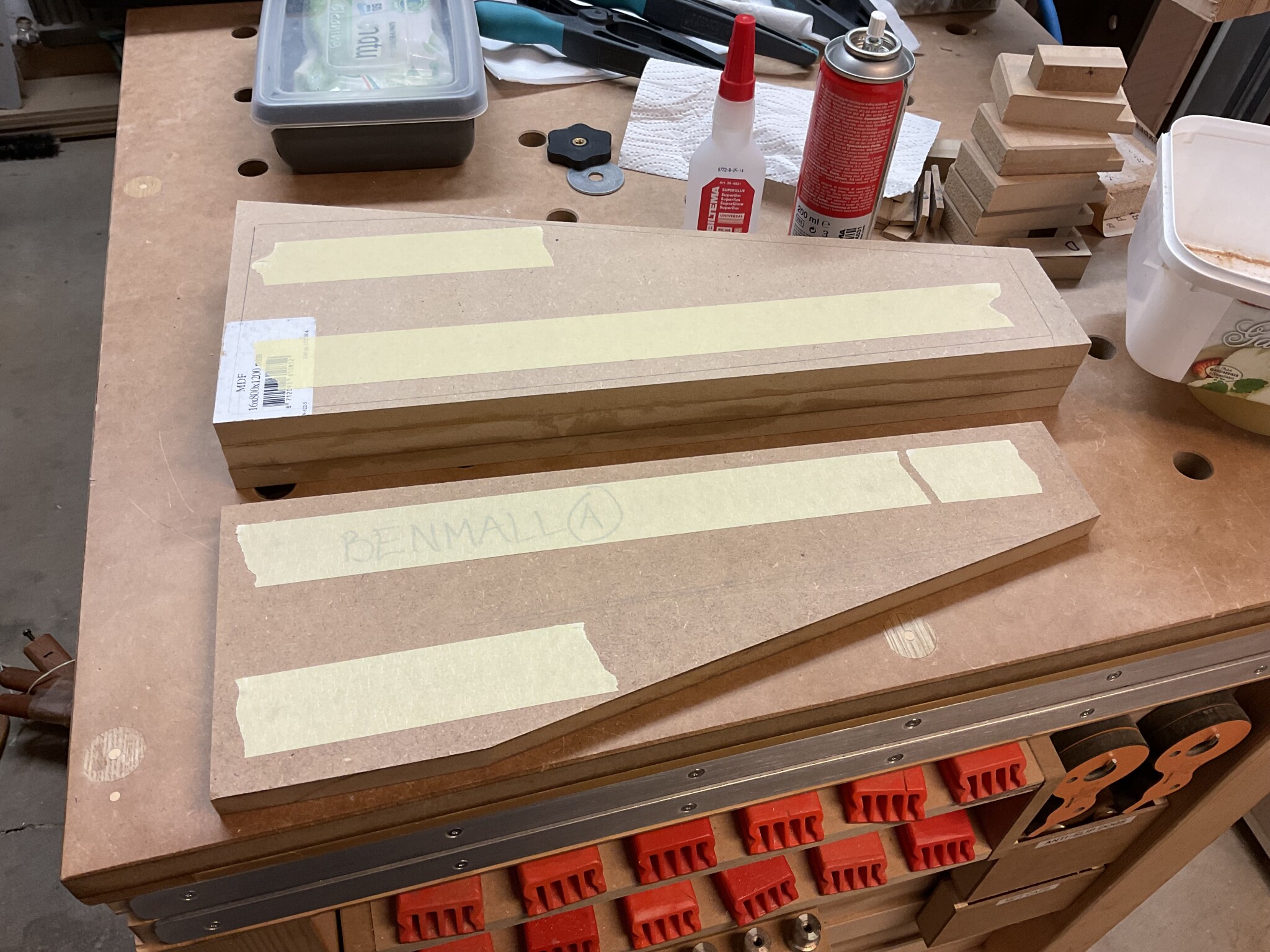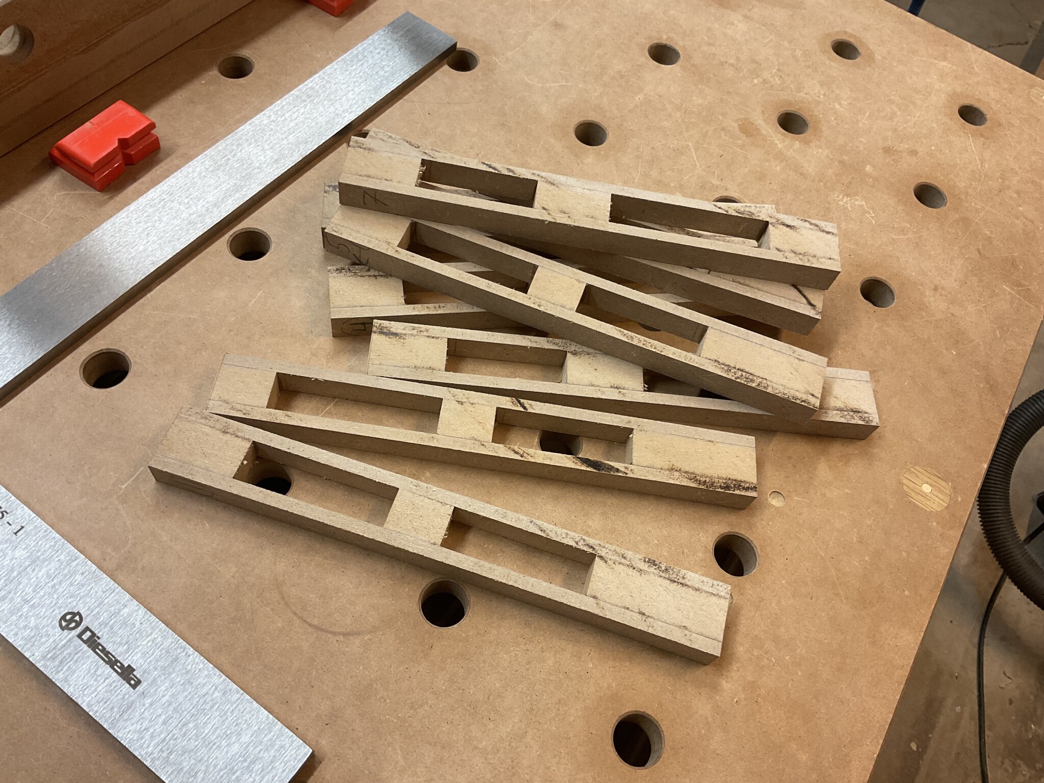 Hade en bit 16 millimeters mdf över som behöver skäras ner i mindre bitar som limmas ihop. Sammanlagt behövdes tolv bitar.