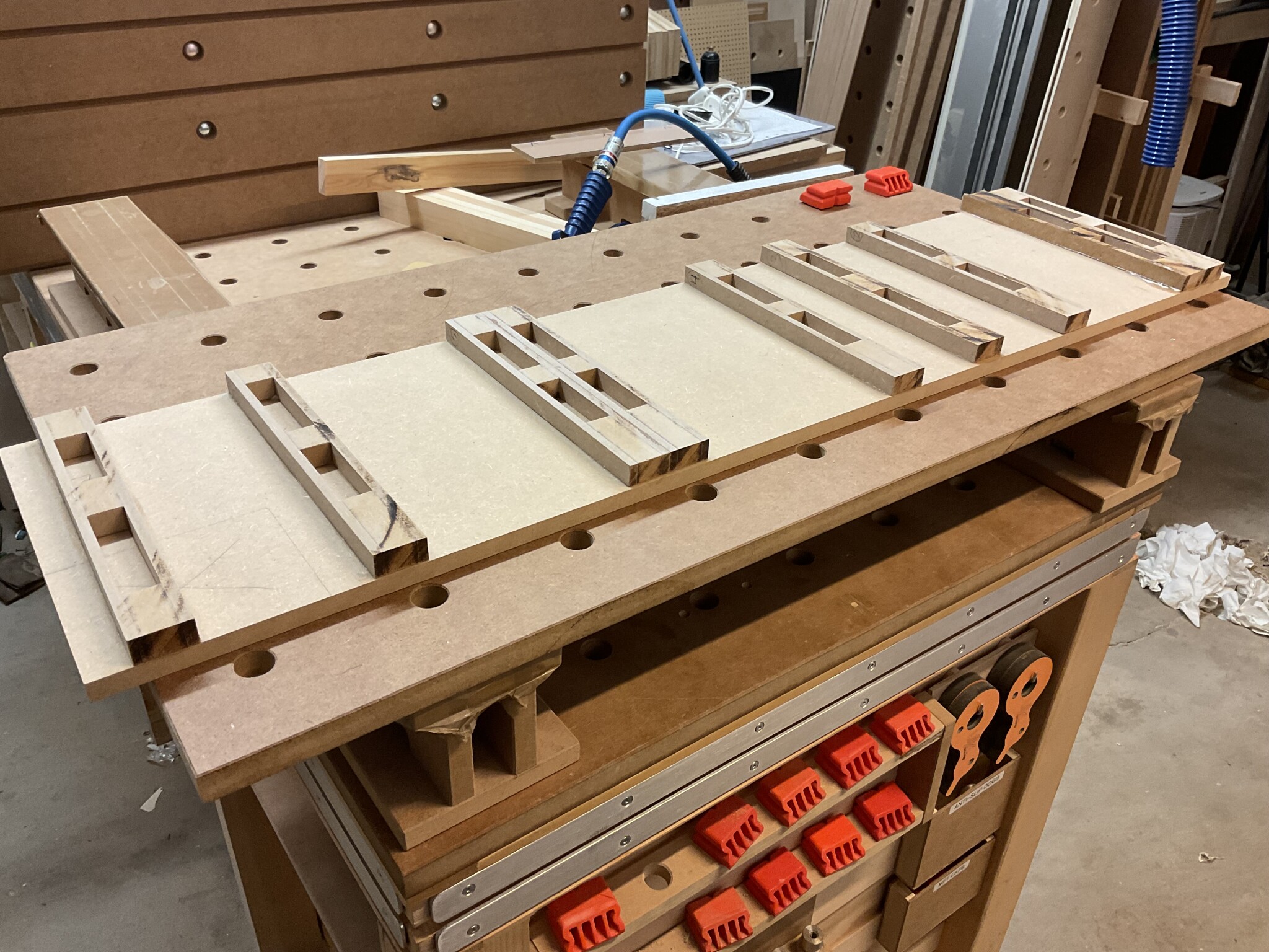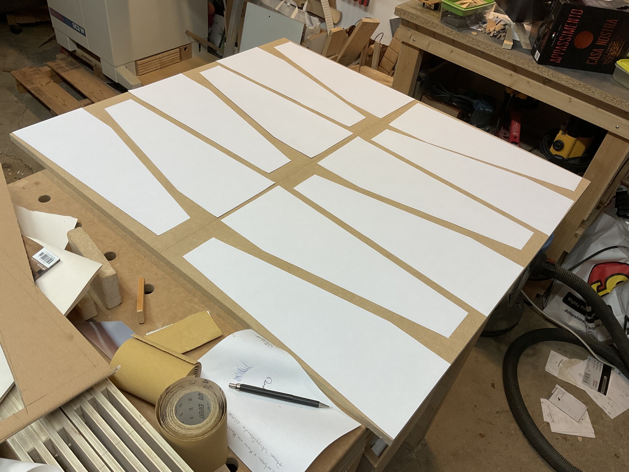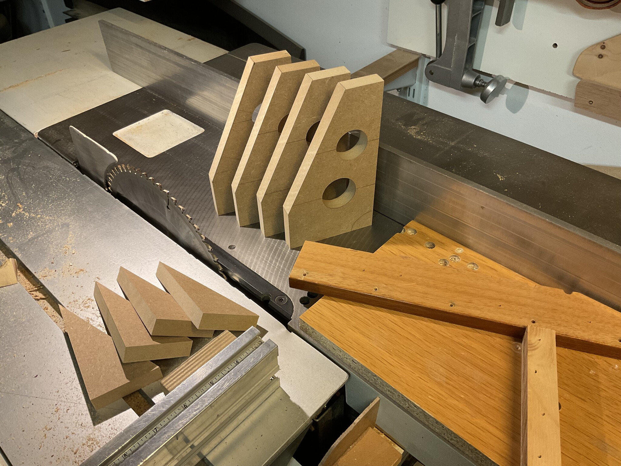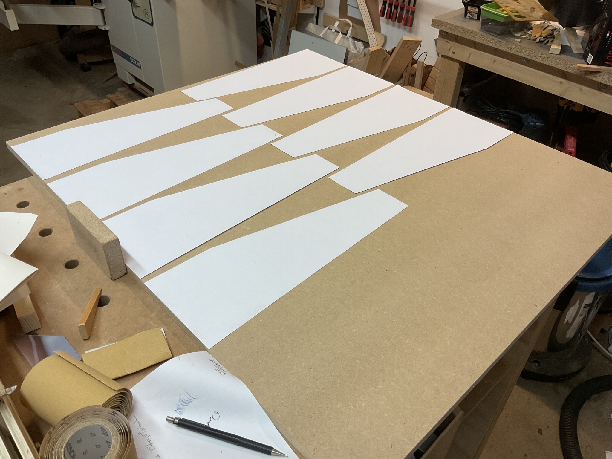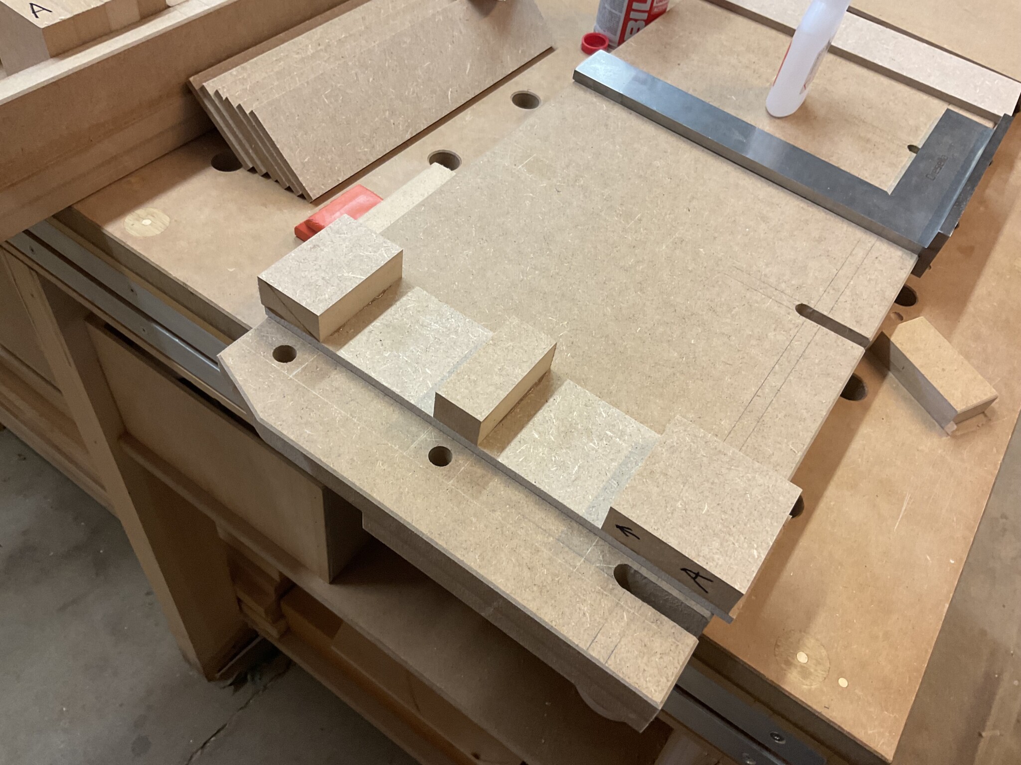 Hade en bit 16 millimeters mdf över som behöver skäras ner i mindre bitar som limmas ihop. Sammanlagt behövdes tolv bitar.