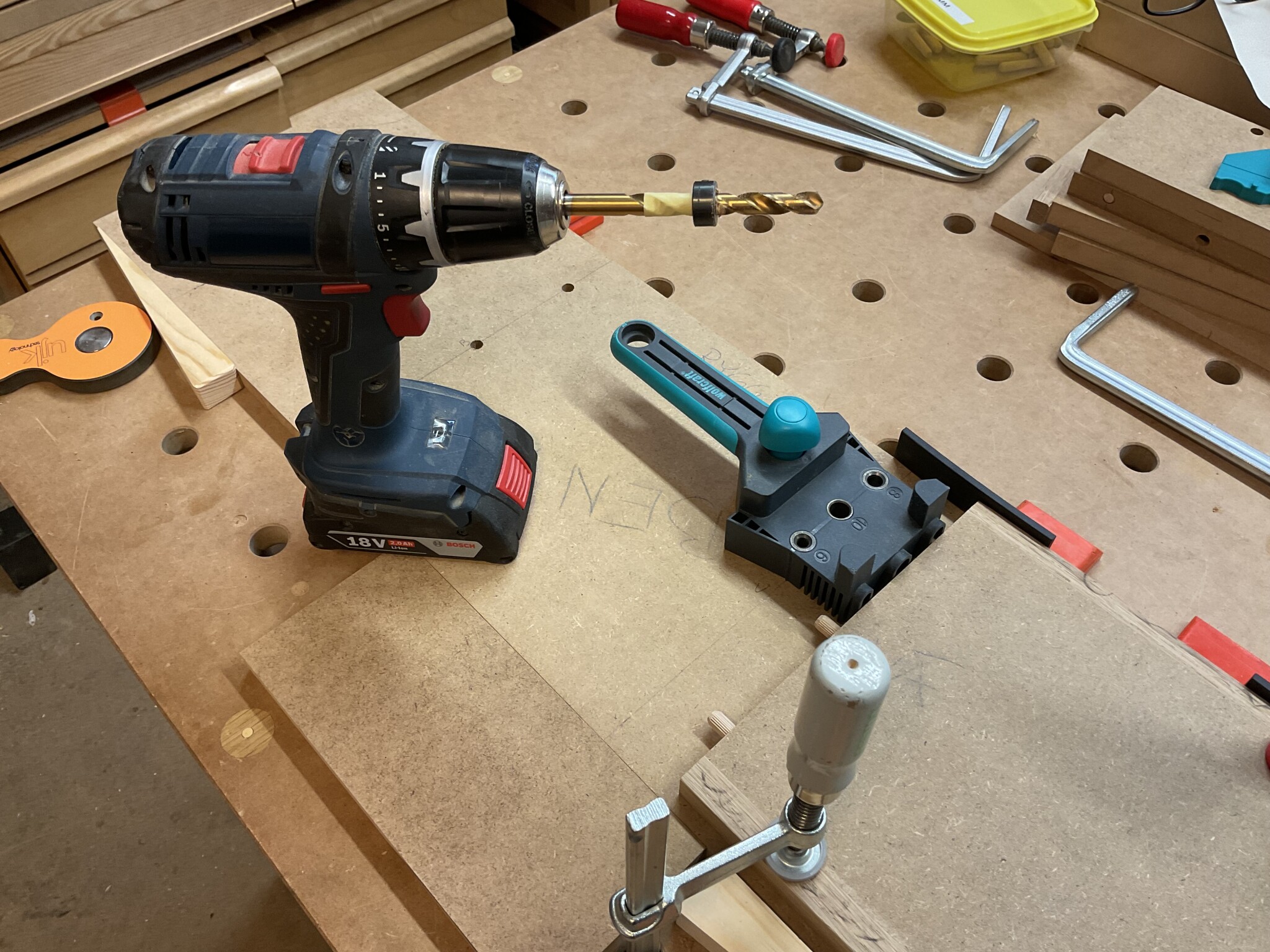 Det har sedan länge kommit små handhållna jiggar för att jobba med träplugg. Köpte en Parkside på Lidl för 79 kr för att testa men blir inte helt övertygad utan ger den till min bror och köper Wolfcrafts variant istället. Tittar på Peter Millards video på tuben om ”dowel jig” några gånger och går sedan loss.