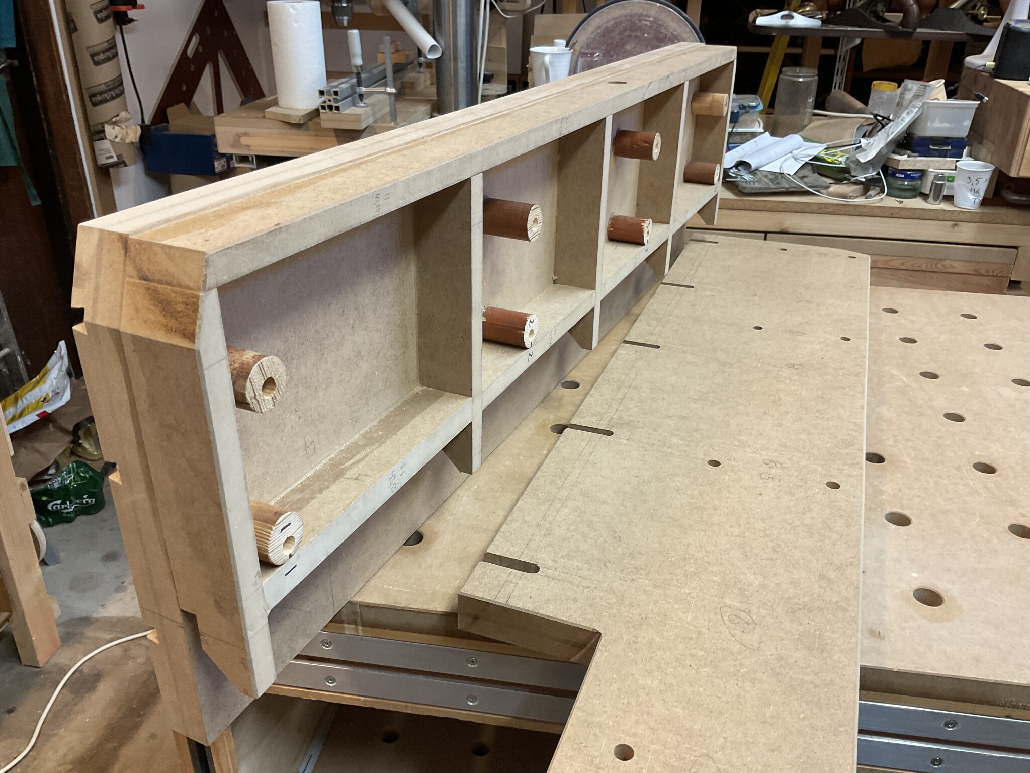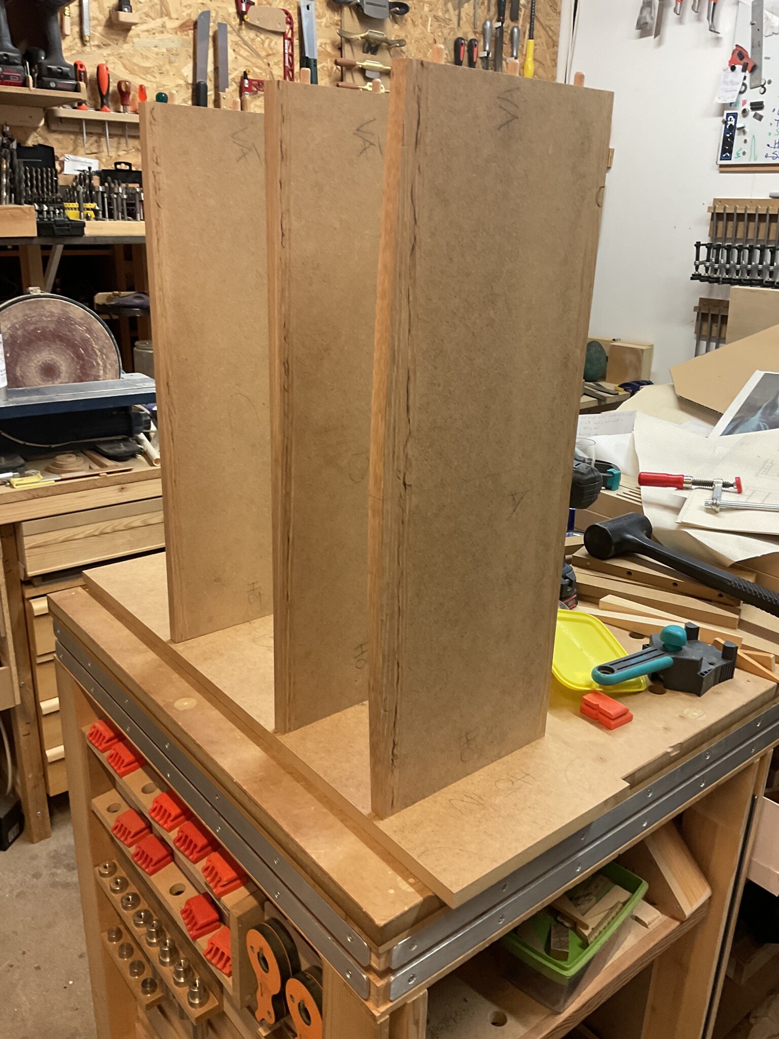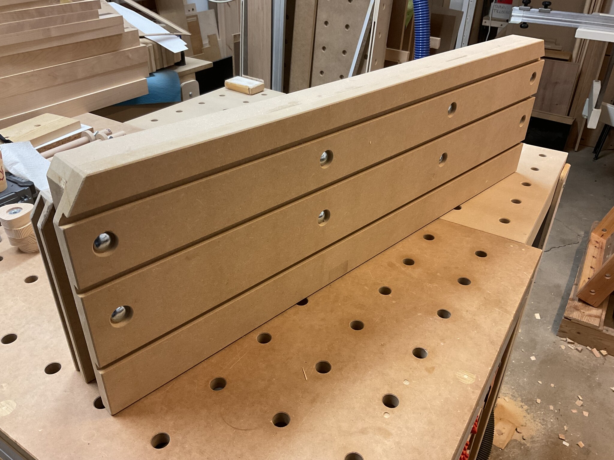 Och då var alla delar borrade för plugg och klara i det avseendet. Överst i traven ligger en liten bit tiomillimeters mdf som ska vara en vertikal avdelare mellan toppskivan och översta hyllplanet.