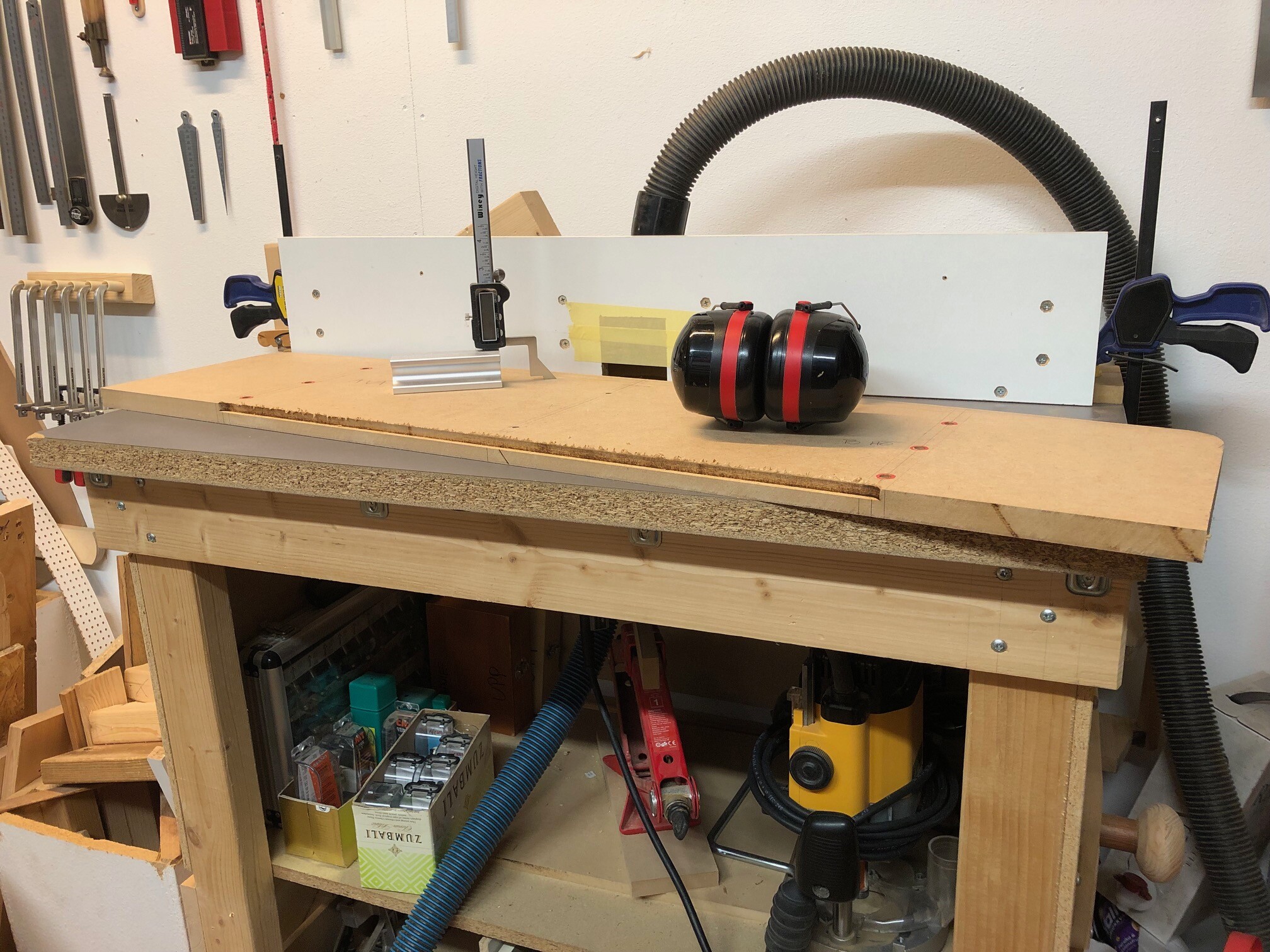 Det är ett rudimentärt fräsbord men det gör sitt jobb. Höjdmätaren från Wixey är suverän både till att ställa stålets höjd (justeras med saxdomkraft) samt fräsdjupet. Genom att tejpa över den överstora stålöppningen i anhållet och ha utsug både under i fräsen samt i anhållet blir operationen dammfri.