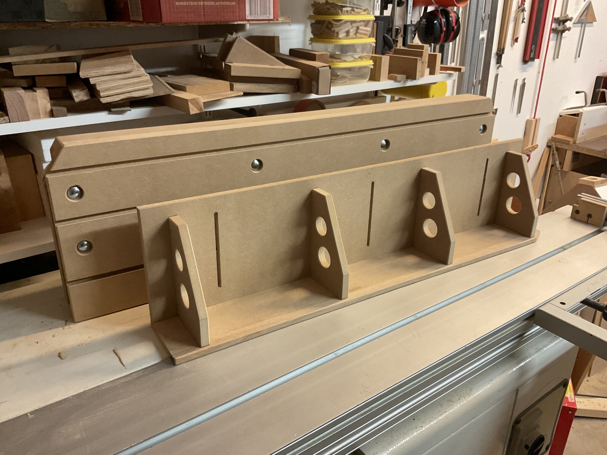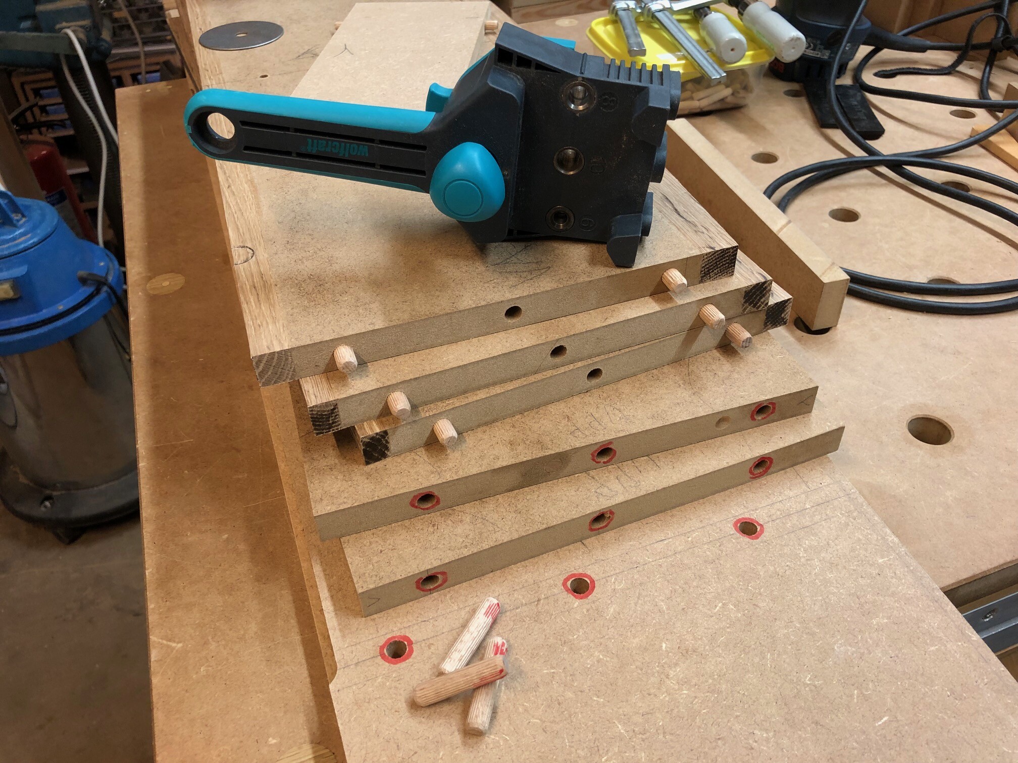 Egentligen är det enkelt, det är bara jag som är ängslig. Hyllorna ska fogas vid gavlarna med träplugg (förlåt till er som kan det här men nu kör jag grundkursen) och de kan sättas helt random i kortändarna på hyllplanen om man vill. Pluggarna centreras i skivan med hjälp av ett slags ben i jiggen eller ett justerbart anhåll.