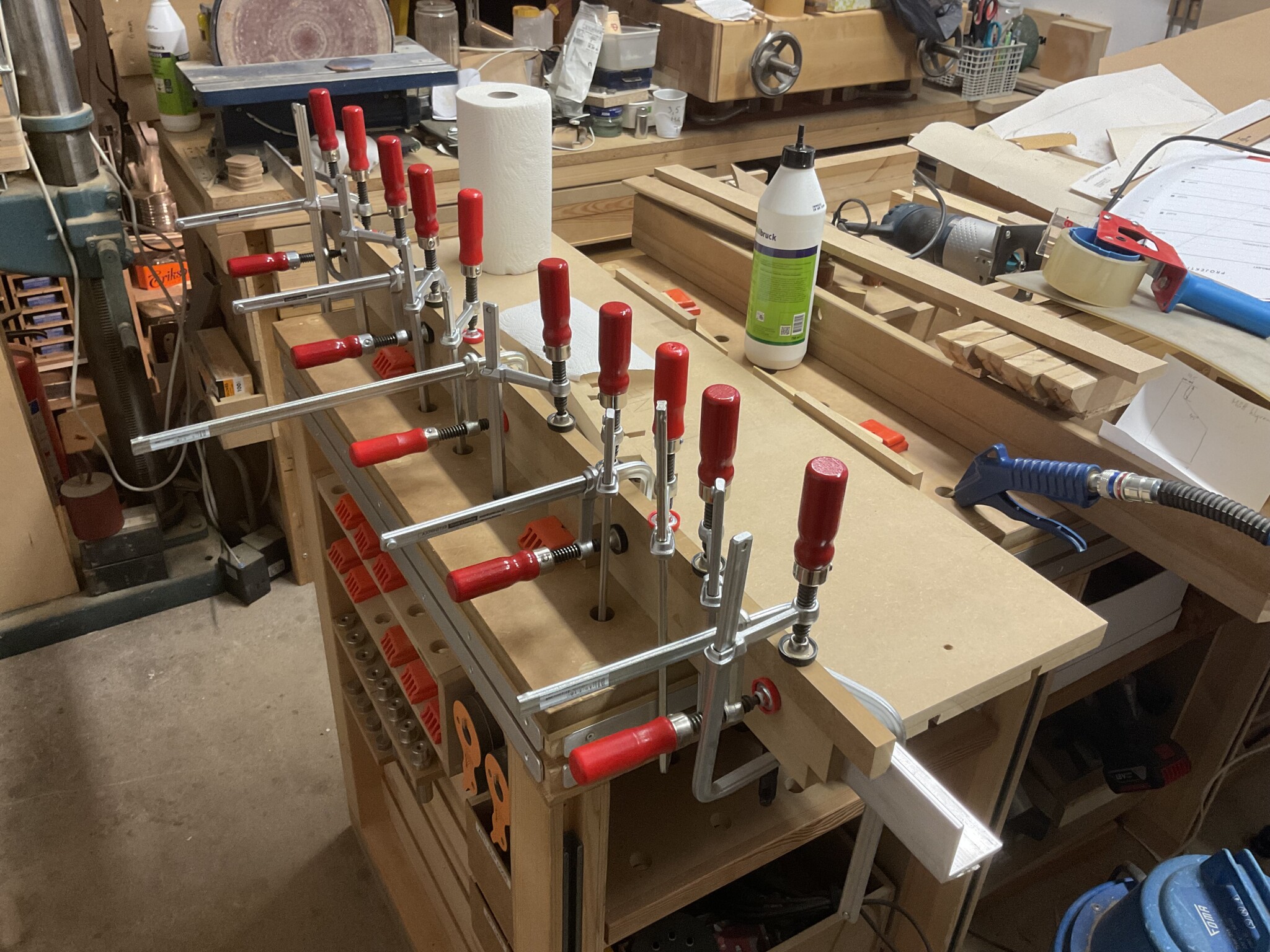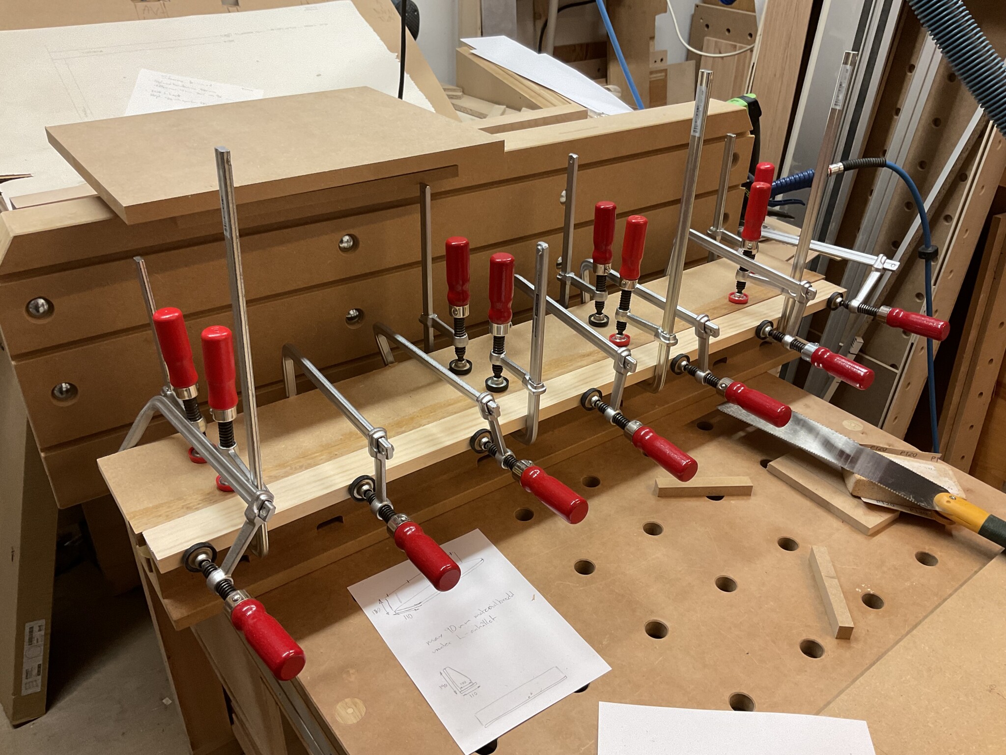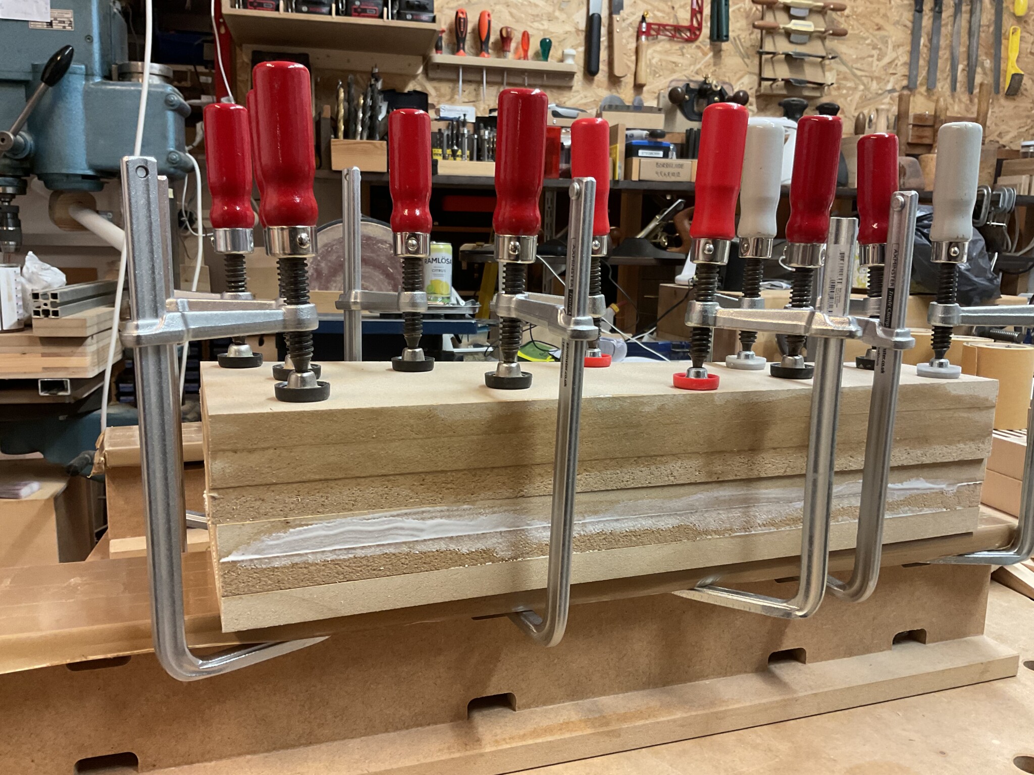 Ett gäng med tvingar. Tre mdf-bitar fick lim emellan sig samt tre andra på sig för att sprida tvingtrycket.