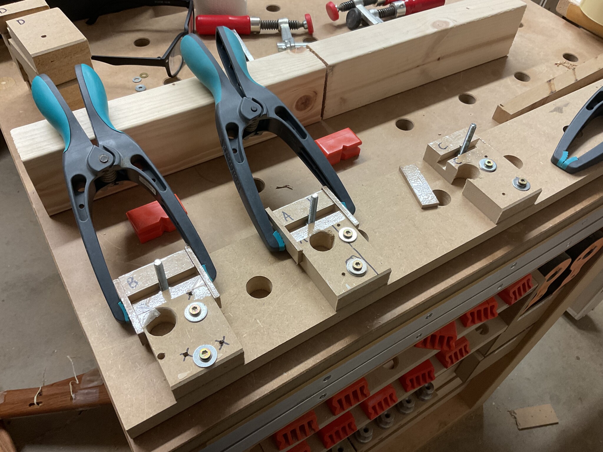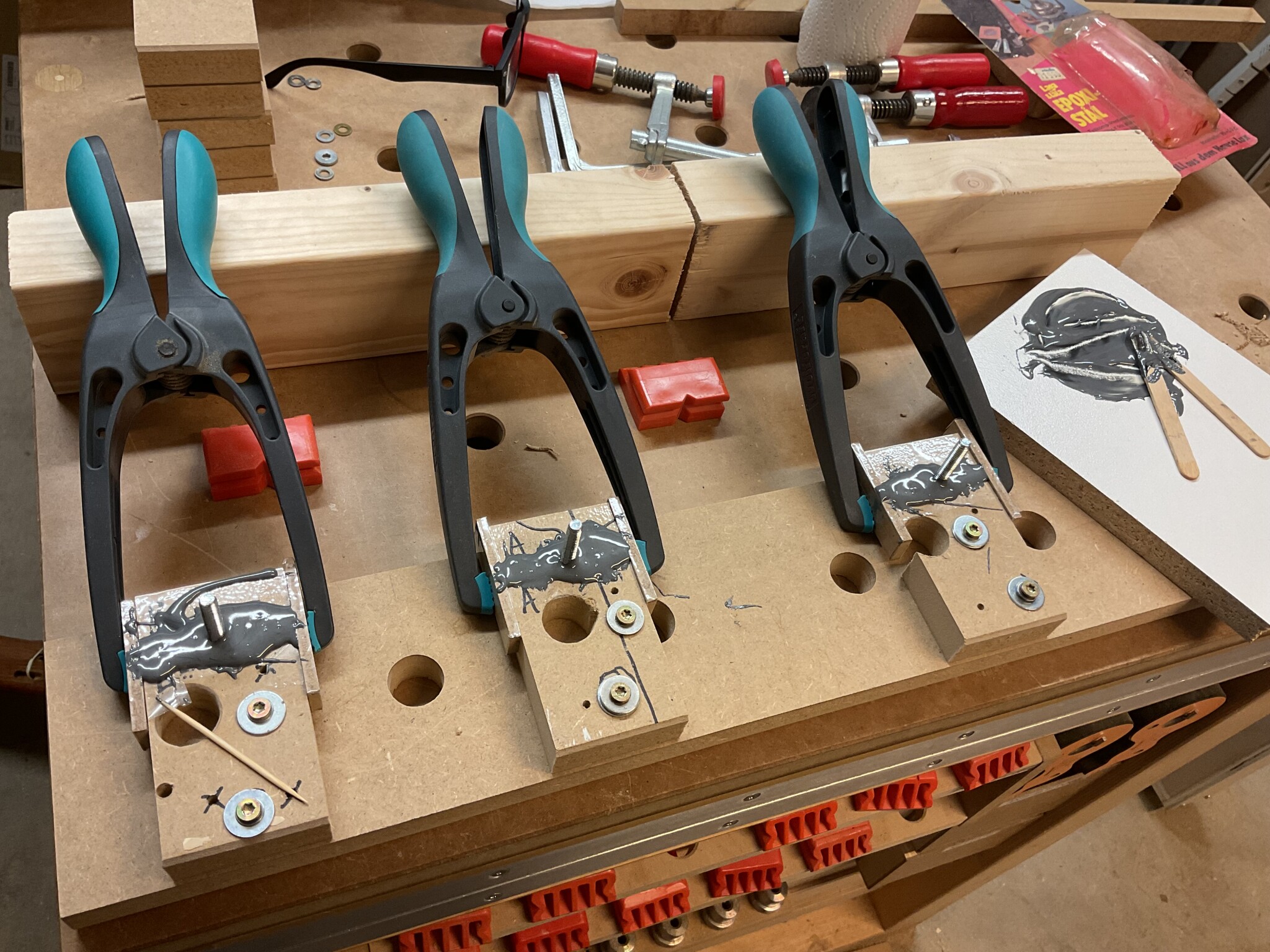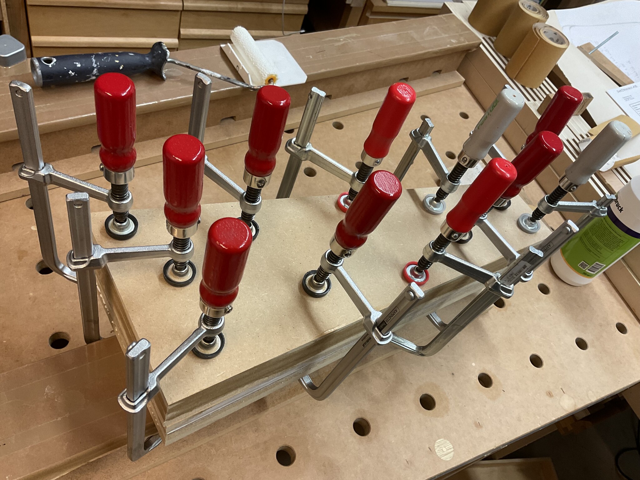 Ett gäng med tvingar. Tre mdf-bitar fick lim emellan sig samt tre andra på sig för att sprida tvingtrycket.