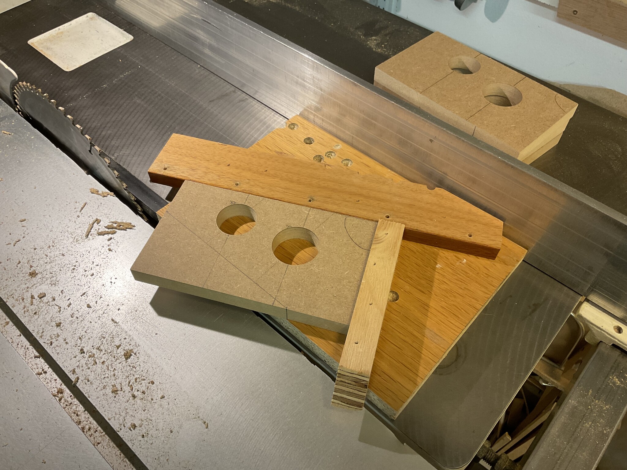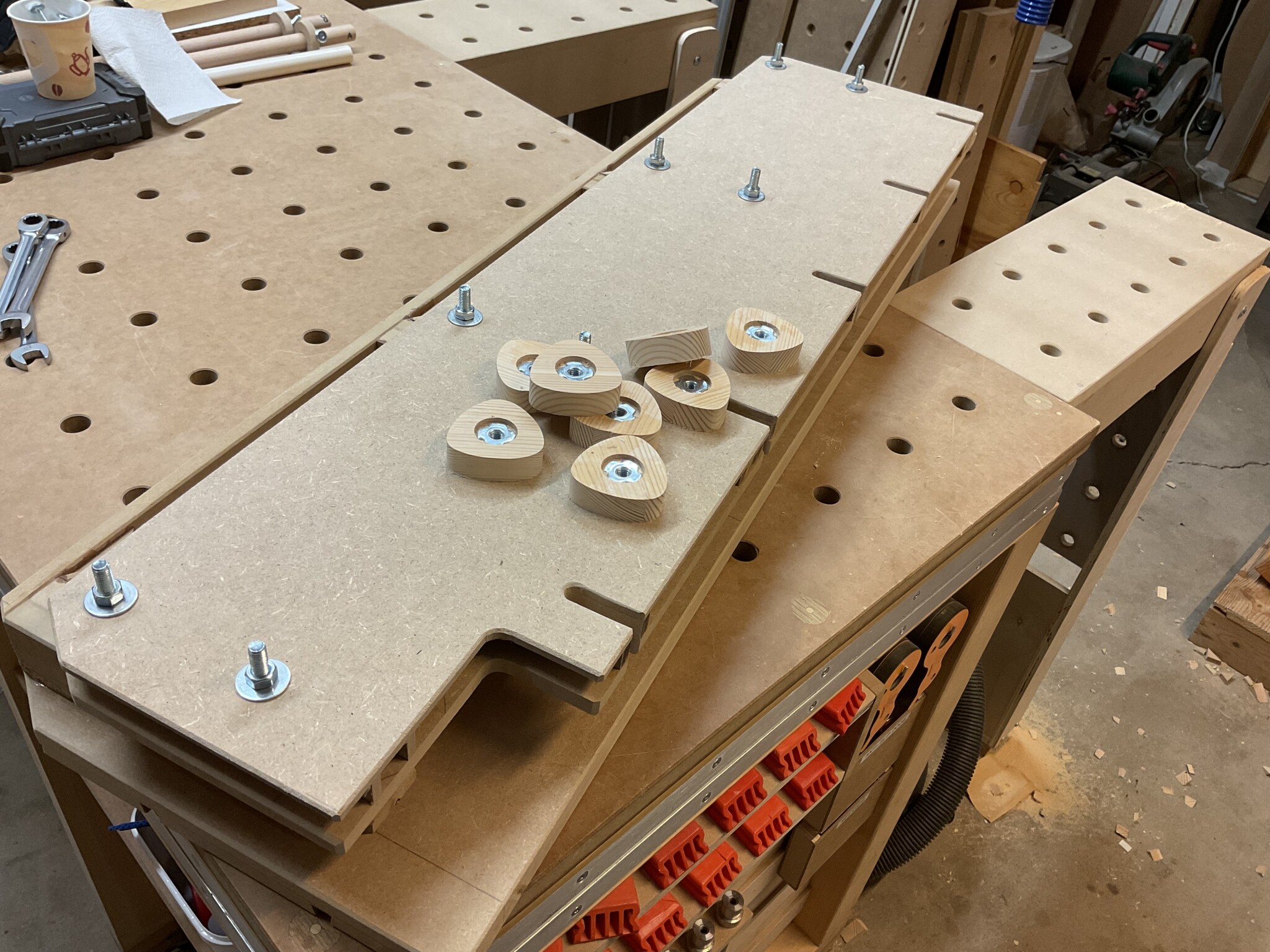 Anhållet som bestod av två halvor grenslar det vanliga klyvanhållet och hölls ihop med vagnsbult och muttrar. I min enfald trodde jag att mdf var tillräckligt styvt så jag hade inget material mellan halvorna där vagnsbultarna skulle dras fast vilket resulterade i att jag kunde överdra bultarna och bakre halvan av anhållet gick i zick-zack och materialet klövs och skiktade sig.