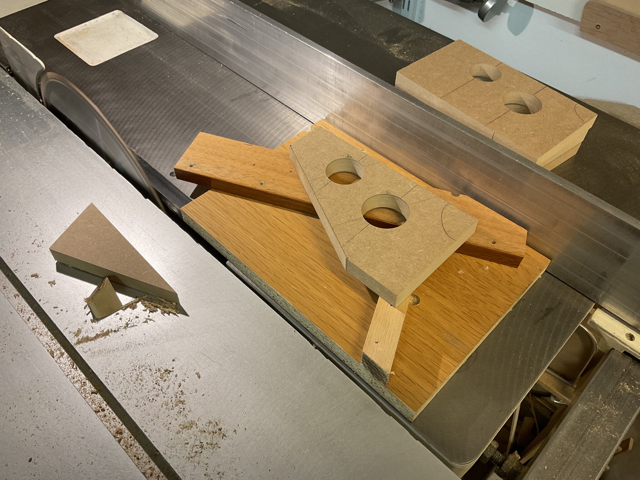 Konstruktionen är en vinkelrät L-profil med några förstyvningar och dem ville jag snedkapa; det fick bli en mycket simpel jig (eller är det en fixtur?) som gjorde jobbet väl så bra.