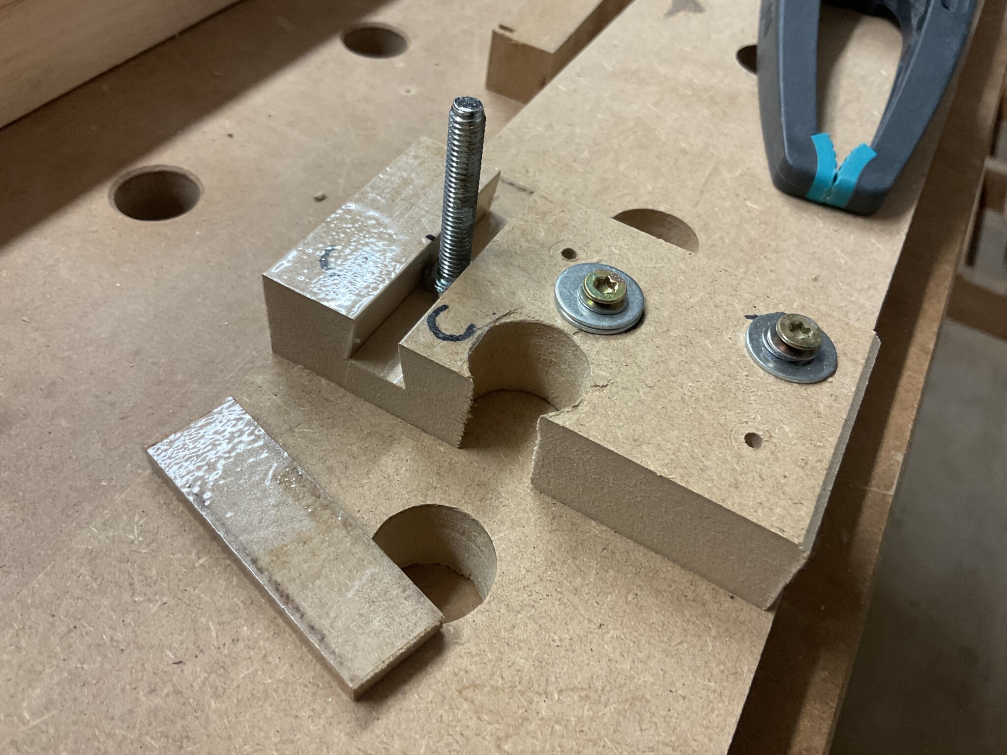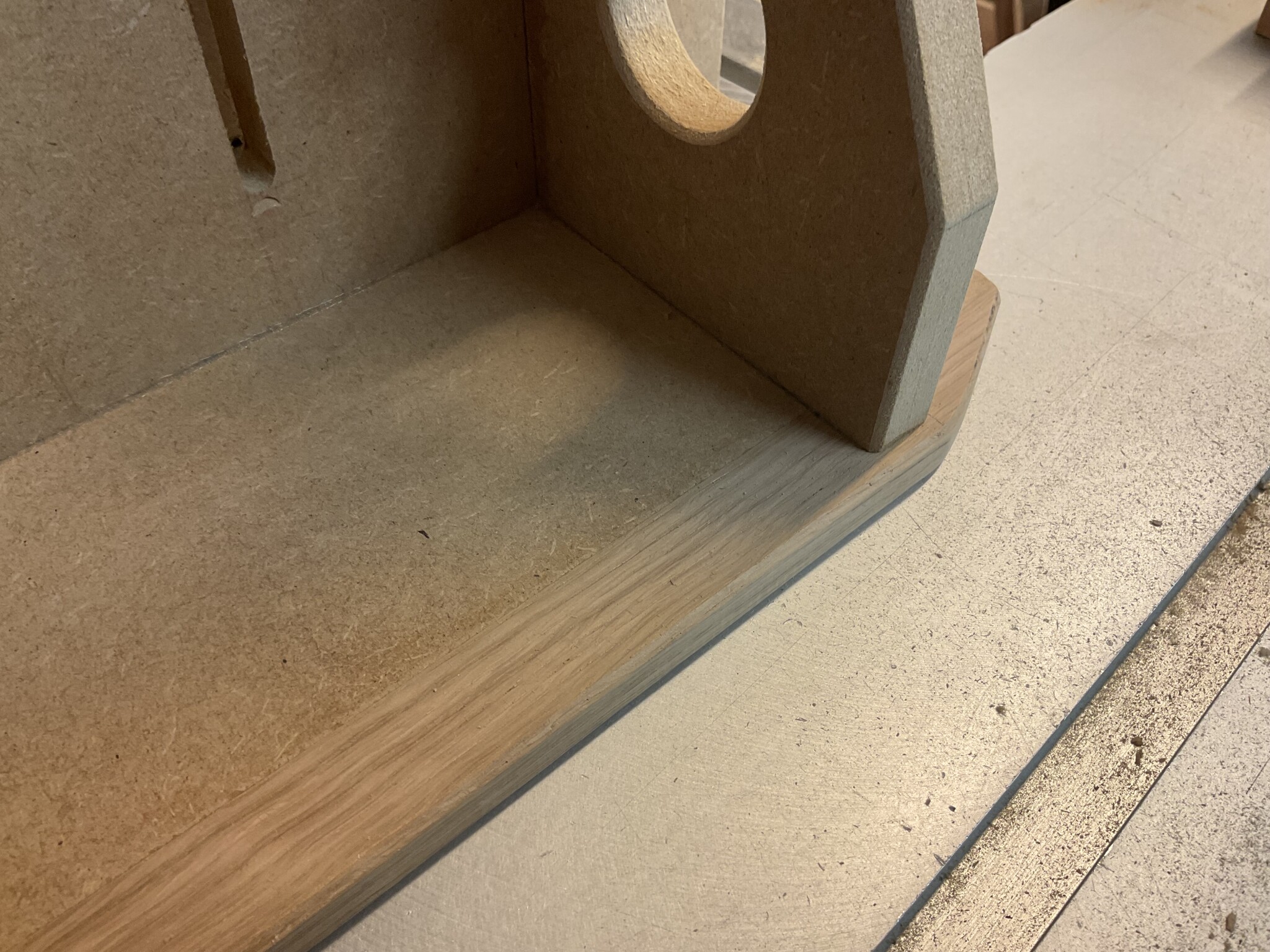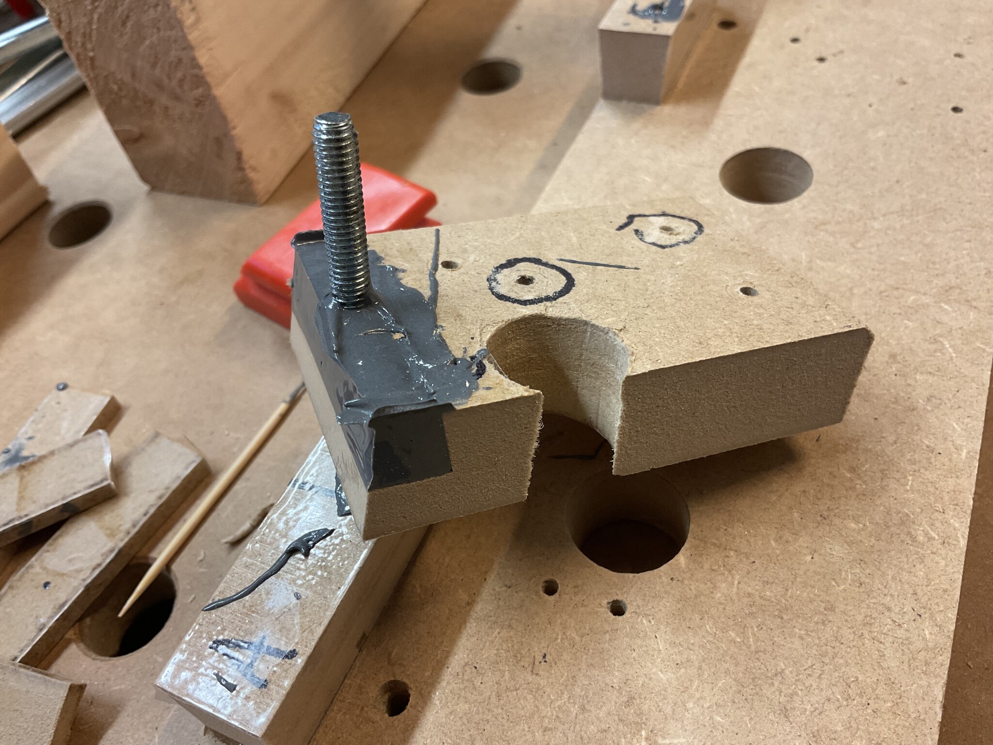 Den ville jag staga upp med några sexmillimeters träplugg men döm om min förvåning när materialet fläktes upp i provbiten när jag slog i träpluggarna. Lösningen blev att tvinga skivan mellan två andra mdf-bitar och limma pluggen med CA-lim som inte tillför så mycket fukt. Det funkade bra och belastningen blir minimal.
