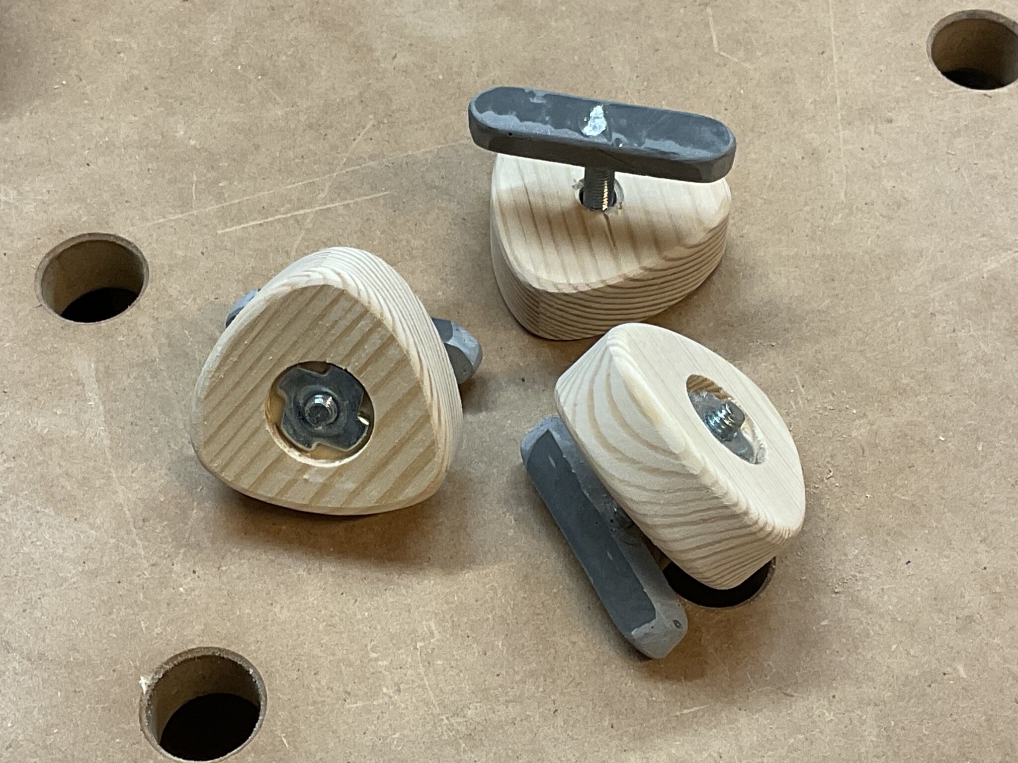Kommer såklart att underlätta ”på och av” betydligt. Bara simpla islagsmuttrar nerslagna i en spillbit limfog av furu som delats upp i rattämnen som sedan slipats till form. Kommer att funka fint.