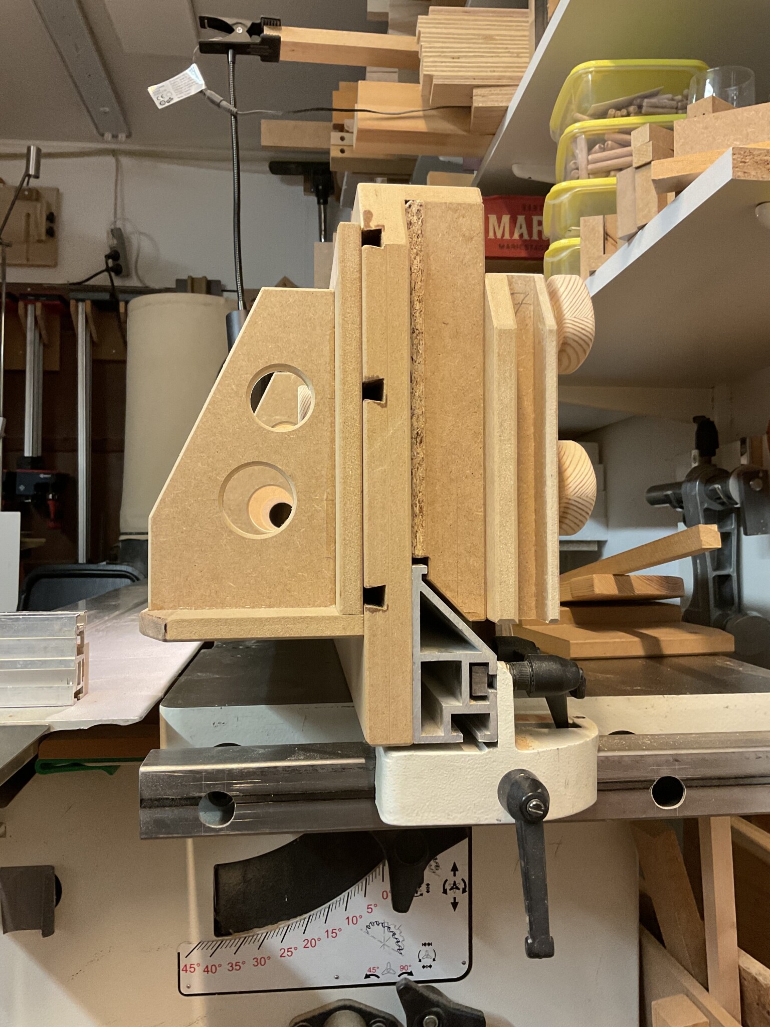 Och här är höga anhållet monterat på klyvanhållet på justersågen samt L-anhållet på det.