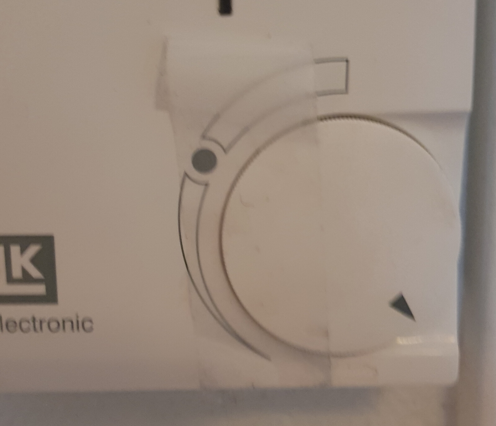 När jag förut frågat de tidigare ägarna om den så svarade de bara att "temperaturen i tvättstugan regleras av termostaten i lilla badrummet" (som finns jämte tvättstugan). Då tolkade jag det som att detta var en onödig termostat som kanske satts dit i bara farten när de satt ut termostater i alla rum och att den sedan inte tagits bort utan de istället bara tejpat den av någon märklig anledning.