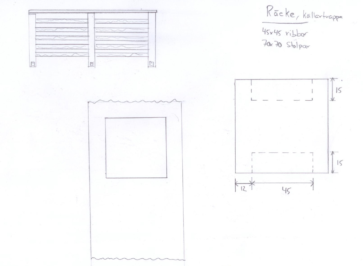 Vill göra ett smäckert räcke som går mot källartrappen och vill därför använda 70-stoplar och 45x45 ribbor enligt bild nedan.Funderar på att fräsa in 45x45 i stolparna enligt bilden men är rädd att det lilla som blir kvar (12 mm) på sidorna om infräsningen inte ska hålla. Vad tror ni ?