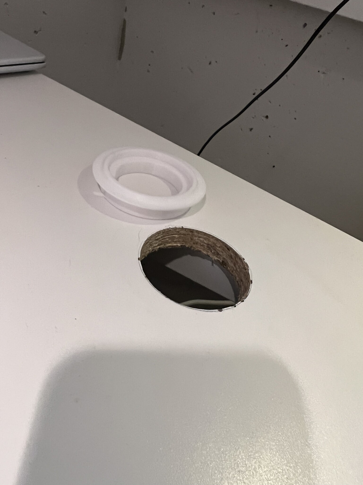 Kanske fel forum men jag vill fälla in den vita distansen i skrivbordsskivan. Distansens diameter är 2 mm större än hålet i skivan. Hur löser jag det på bästa sätt? Har funderat på om det finns något lämpligt frässtål till överhandsfräsen?