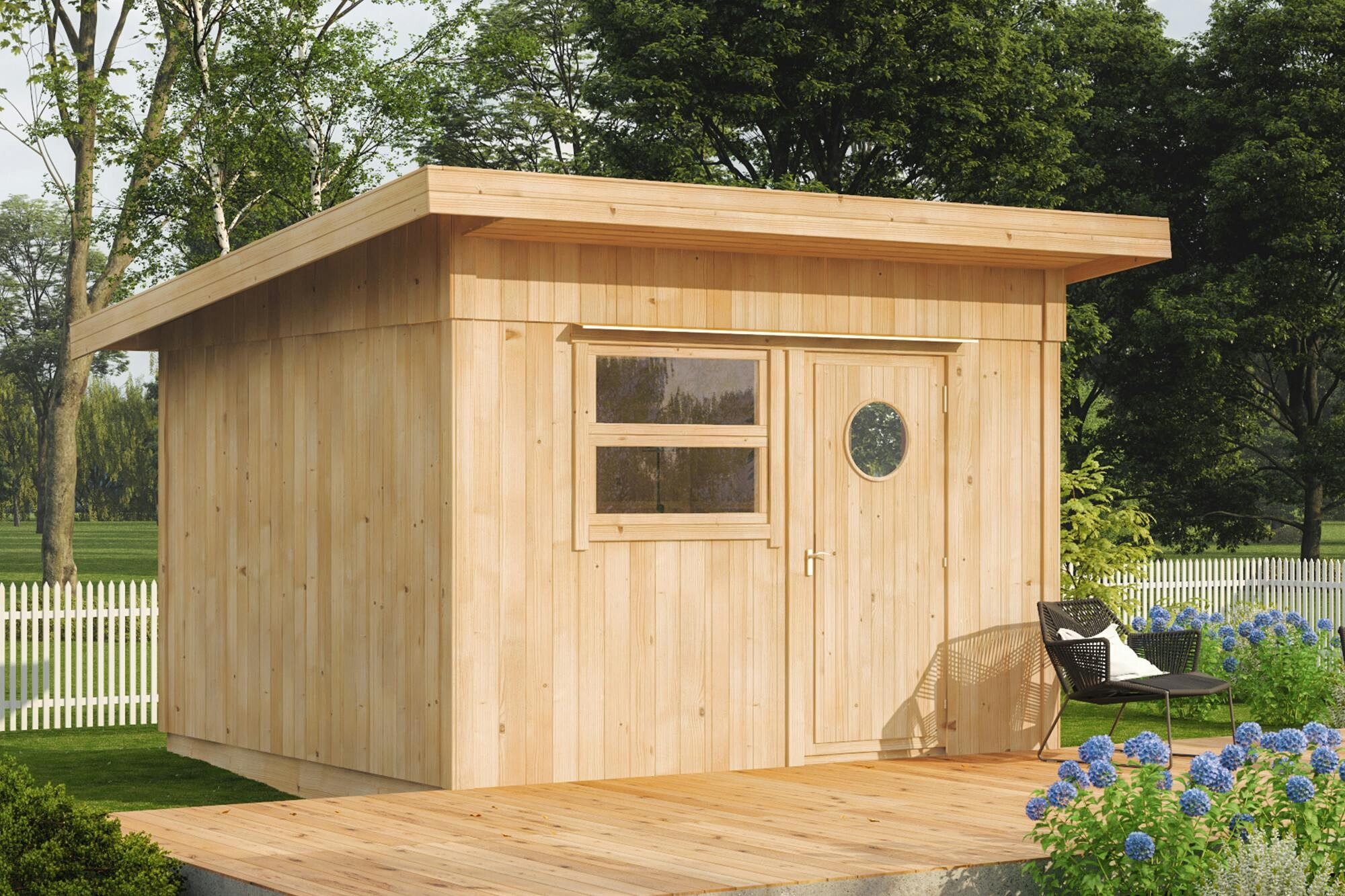Vi funderar på att köpa denna, det är en byggsats som man bygger ihop själv. Allt trä är obehandlat.