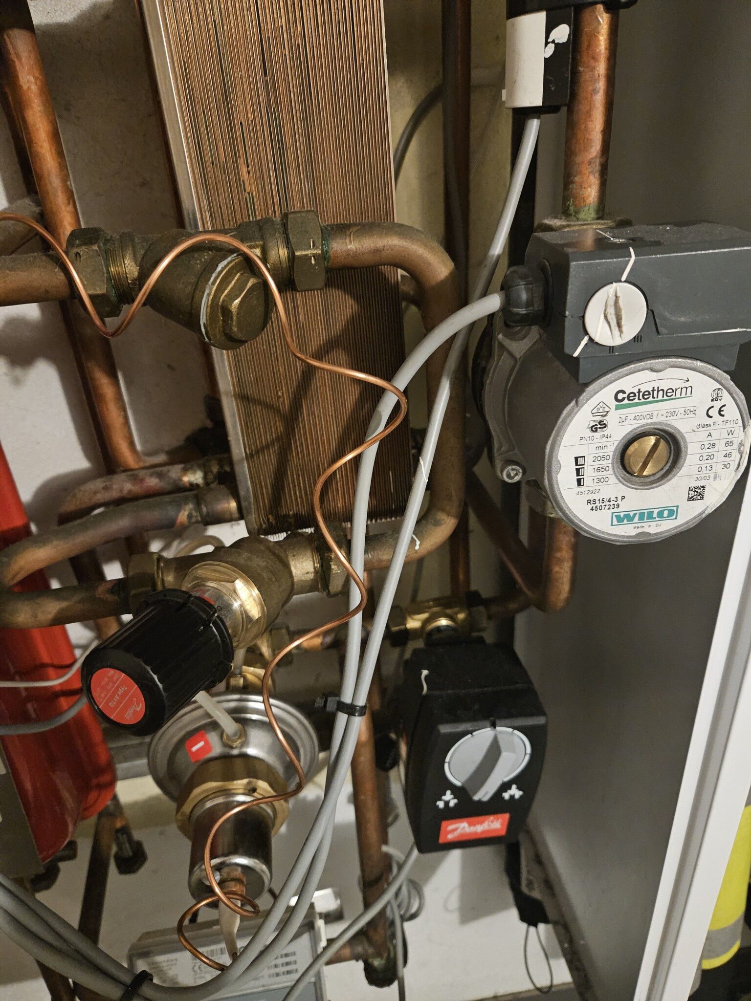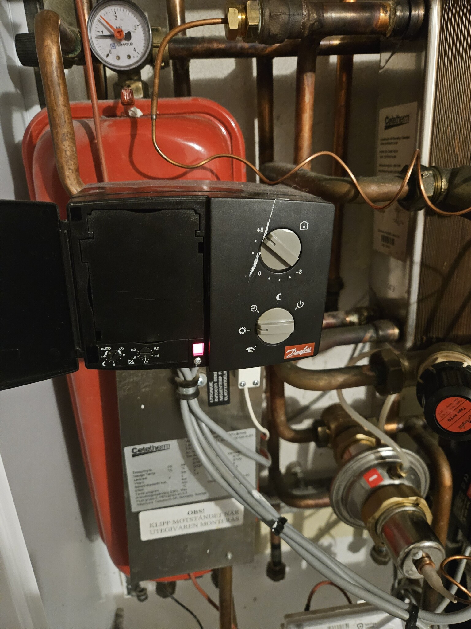Det verkar som att cirkpumpen inte går, den på bild 2 till höger. Se om du kan vrida det vita vredet till 3 på pumpen, sen kan du lossa den stora skruven som är på pumpen, stoppa in en mejsel och känna om pumpen snurra, det kan skramla lite i handen, så håll inte hårt i mejseln.