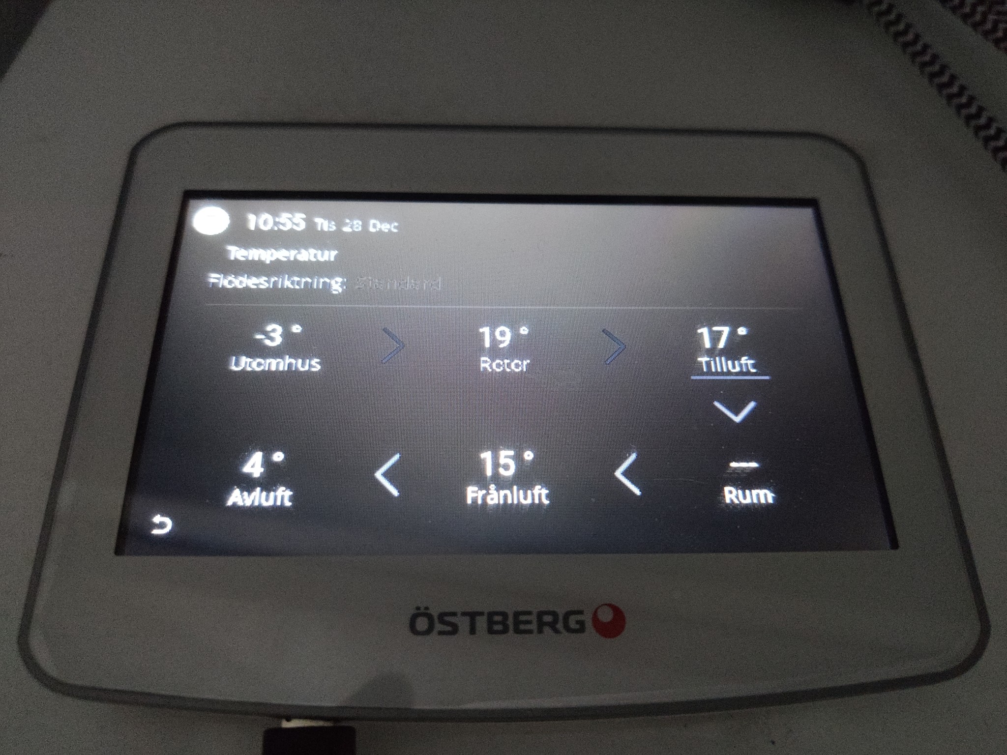 Jag har 10cm isolering men snarlika värden. För min del är dock fuktöverföringsskyddet aktiverat. Funktionen styr rotationshastigheten hos värmeväxlaren för att förhindra fuktöverföring till tilluften på grund av för hög relativ fuktighet. I en roterande värmeväxlare fastnar fukten på rotorns yta som rör sig ömsom i frånluft och tilluft. När det är kallt utomhus kondenserar fukten till vatten och återförs i tilluften. Återföringen av fukt kan bli så hög som 70-80 procent och leda till fuktskador i värsta fall. Just nu 94% luftfuktighet ute.