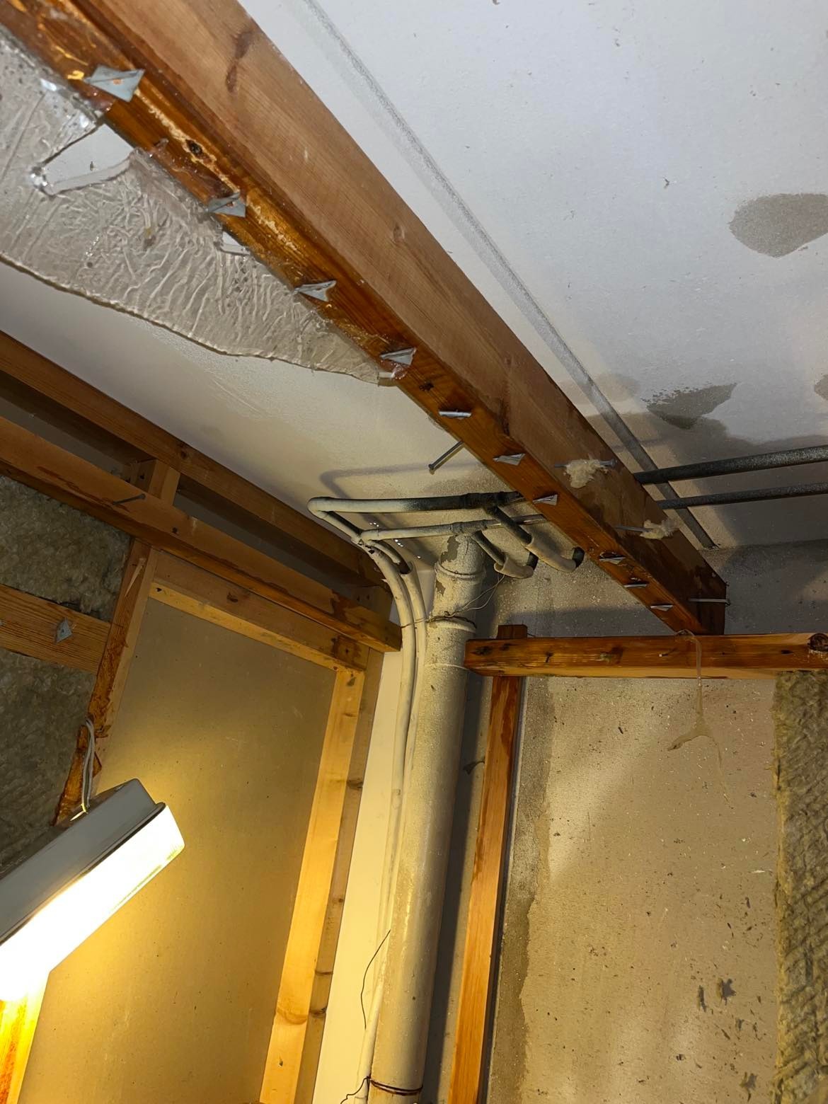 Håller på att riva ut en gammal bastu och märkte igår att det låg vatten ca 4 liter på golvet när jag kom in. Började riva bort panelen för att se vad som hade hänt. Det jag upptäckte var att ytterväggen mot soturäng var fuktig och även isoleringen. Den ena takbjälken var även blöt hela vägen bort mot andra sidan av bastun. Det verkar som att det har legat vatten på plasten mellan isolering och panel. För övrigt är det torrt. Så vitt jag kan se så är det inget fel på rören eller avlopp. Kan det röra sig om kondensvatten som samlats under en längre period från vattenrören? bastun har inte används på många år enligt tidigare ägare. Bifogat ser ni bilder på det hela.