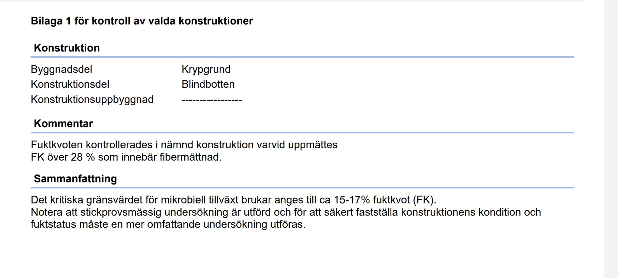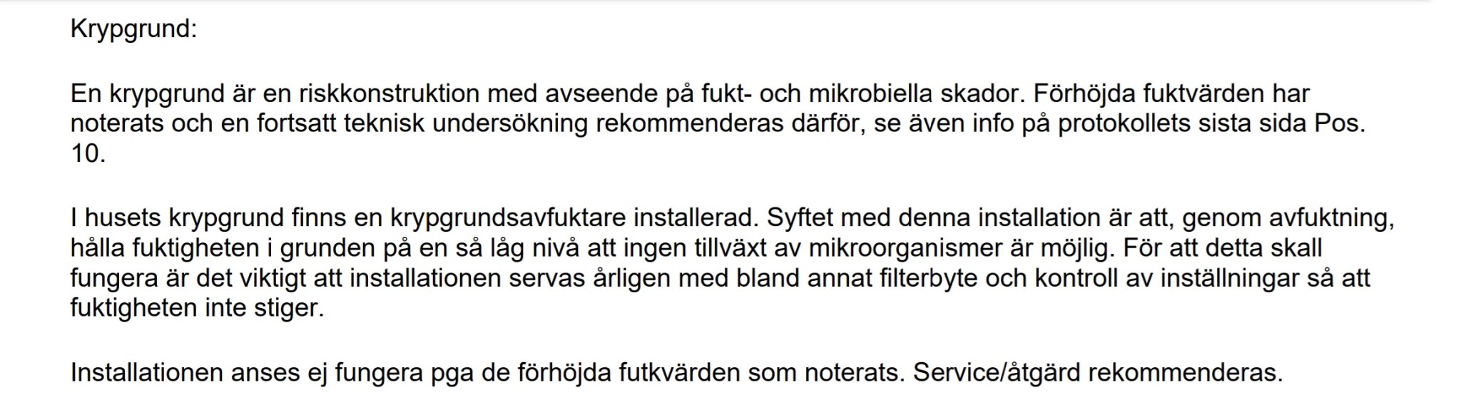 Jag och min sambo är intresserade av ett hus byggt 1976 med krypgrund. På besiktningen så framkom vissa brister i grunden som jag bifogar i bilerna. Besiktningen skedde för en månad sen ungefär och efter det har de haft ett företag där som ska ha dragit fler rör i grunden från avfuktare och idag var Besiktningsmannen där igen och sa att det inte hängde droppar längre men virket är ju fortfarande fuktigt vilket jag antar är 28%+-