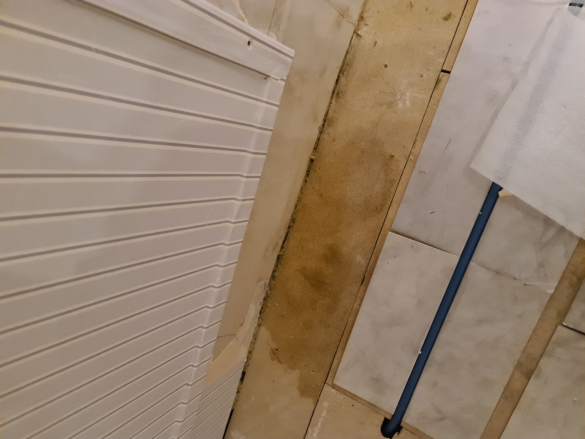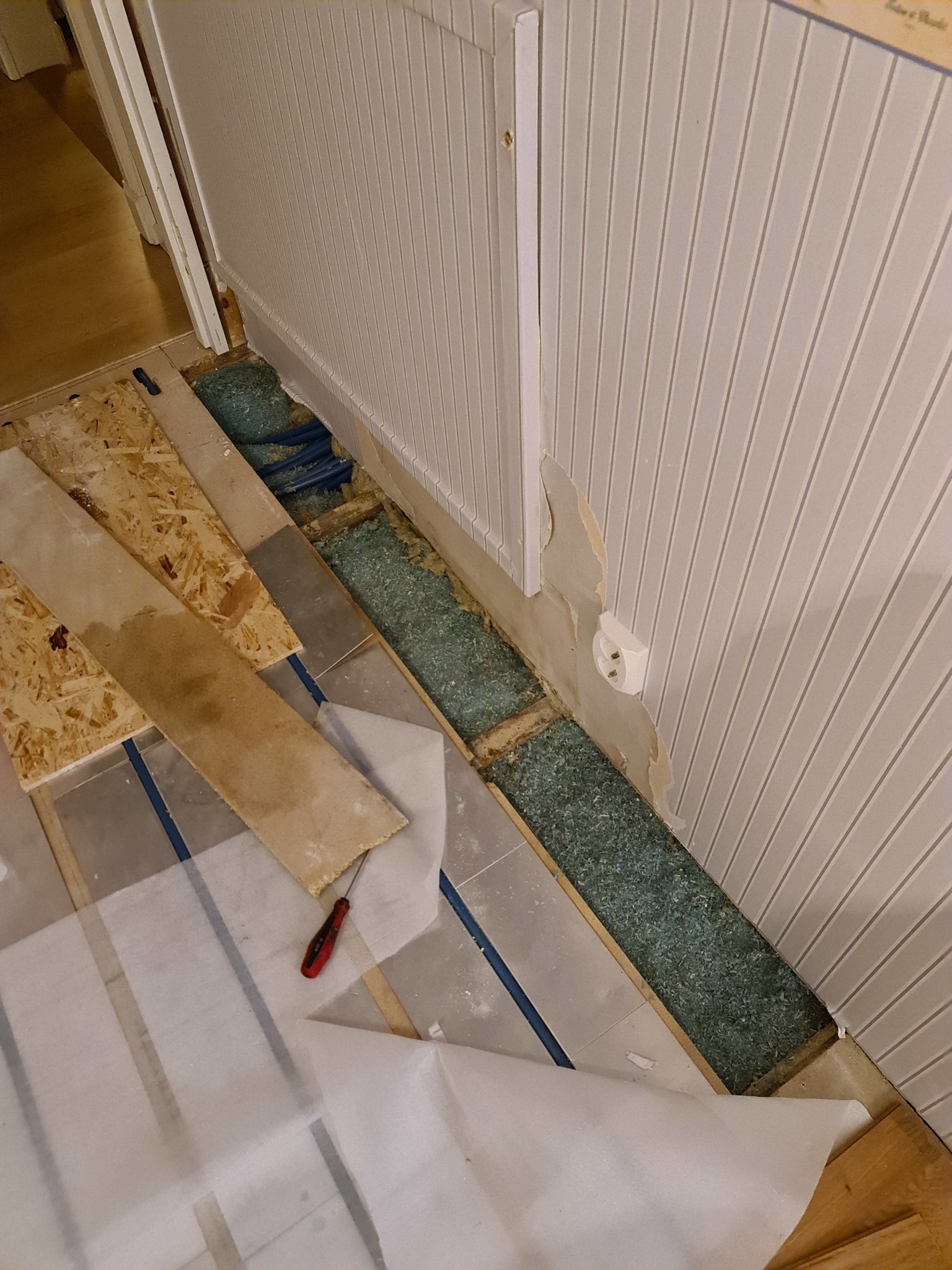 Jag misstänker att detta kommer från när vi flyttade in och en koppling i golvvärmecentralen ovanför gick sönder när allt kollades och vatten sprutade ut i nån sekund, det torkades såklart torrt men ingen lyfte på golvet och torkade uppenbarligen. Bör jag byta ut den spånskivebiten eller kan jag gott bara strunta i det och lägga på nytt golv?