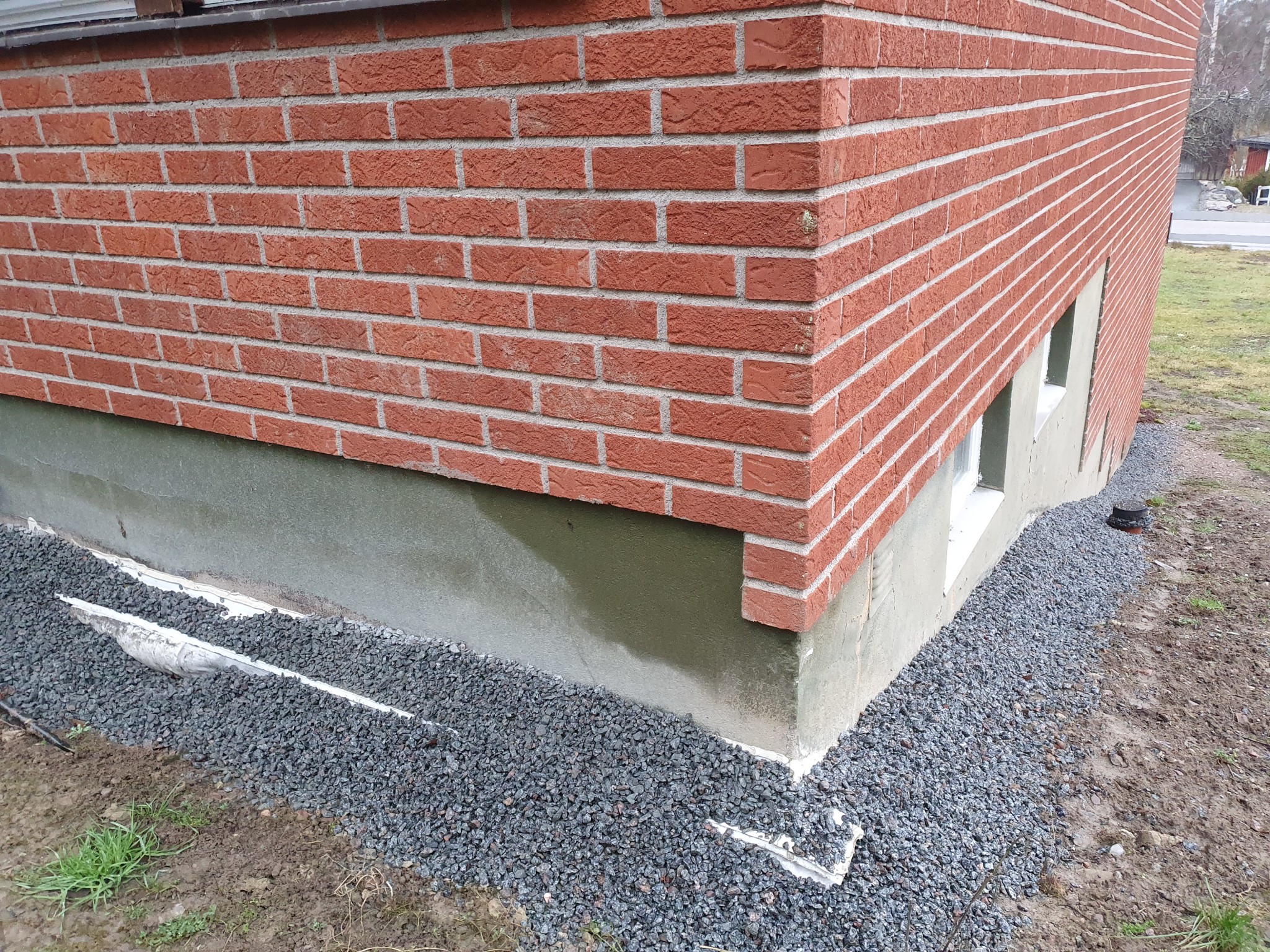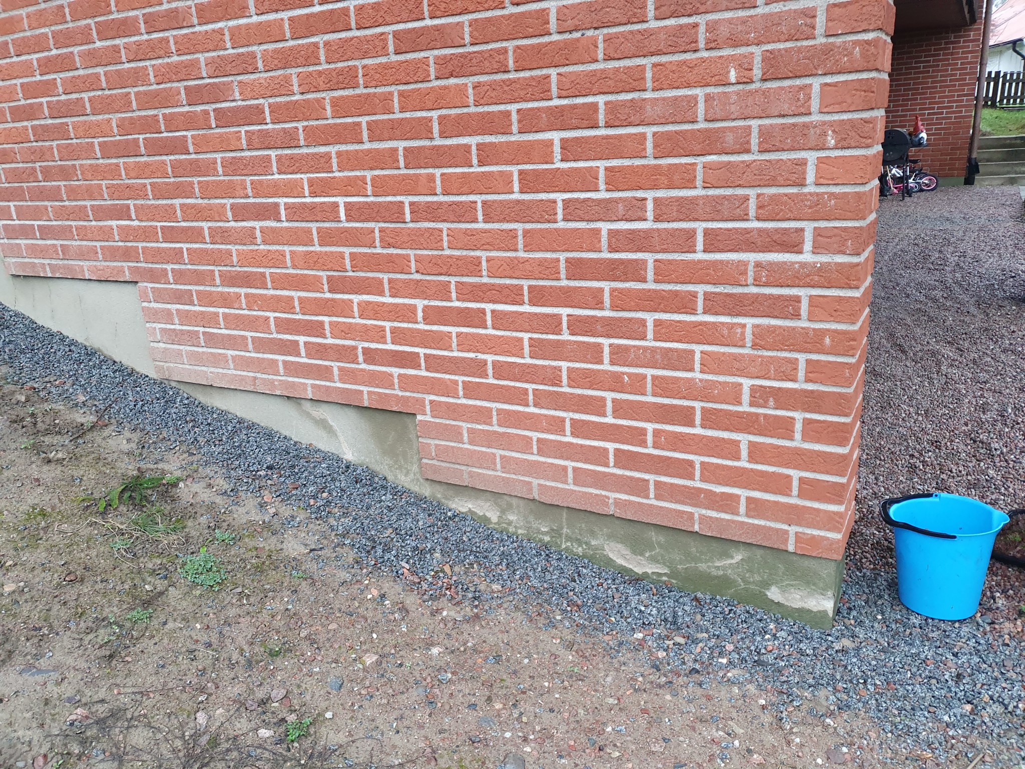 På husets framsida fortsätter kortsideväggarna nån meter extra efter att de mött långsidan. De är alltså något längre än vad huset är brett (fattar ni hur jag menar?). Där är det fukt inte bara på grunden utan även upp på tegelfasaden, främst på "insidan". Hur kommer det sig tro?