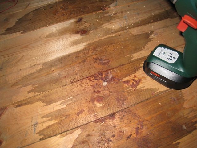 Vi köpte ett 50-talsradhus (i Umeå) för ca 1,5 år sedan. Under det senaste året har det växt fram någon form av fuktig, rostbrun, kladdig och grynig beläggning på en del av trägolvet uppe på vår kallvind (se bifogad bild). Vad tusan är det för någonting? Någon form av svamp eller mögel? Behöver vi åtgärda det (det känns ju inte särskilt bra att området växer) och i så fall hur?