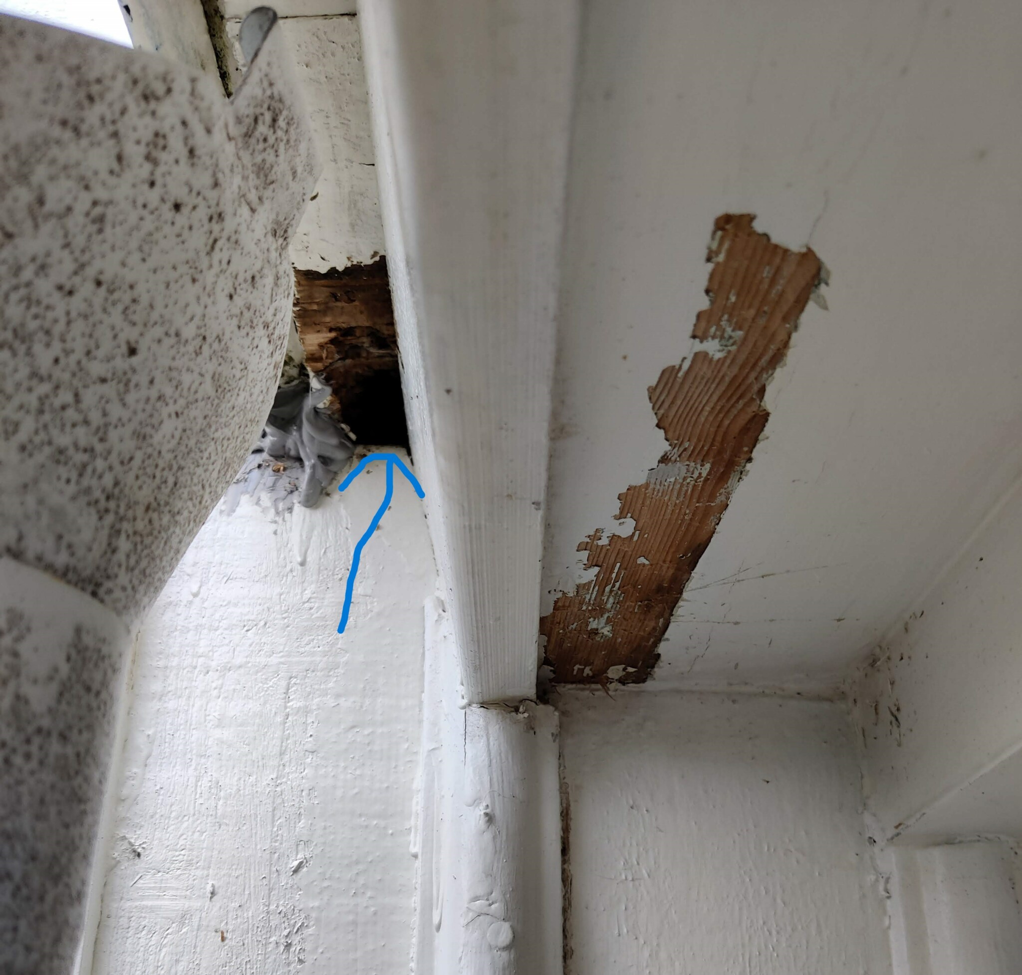 Upptäckte att vatten runnit in och skadat råsponten på entretaket.