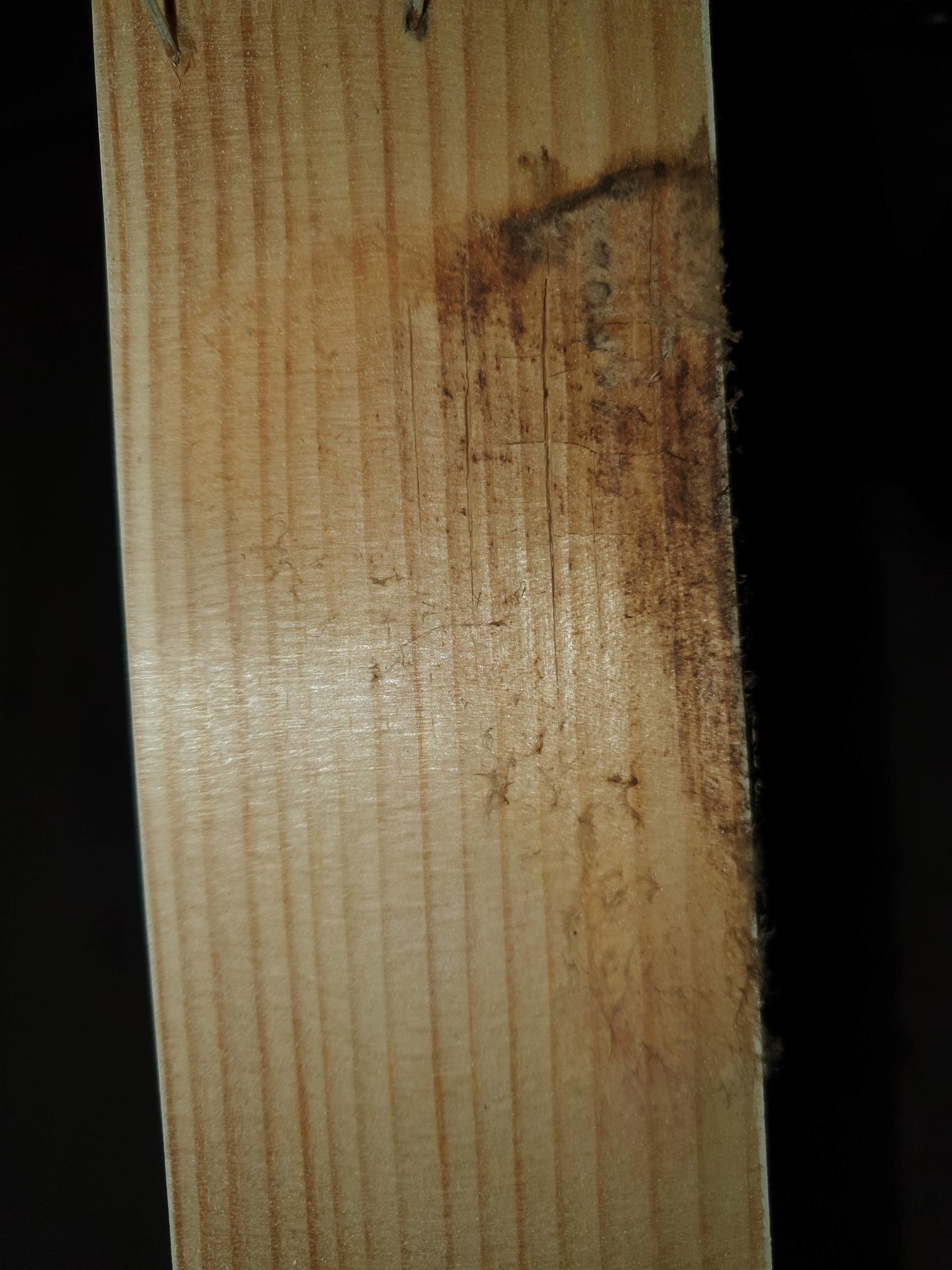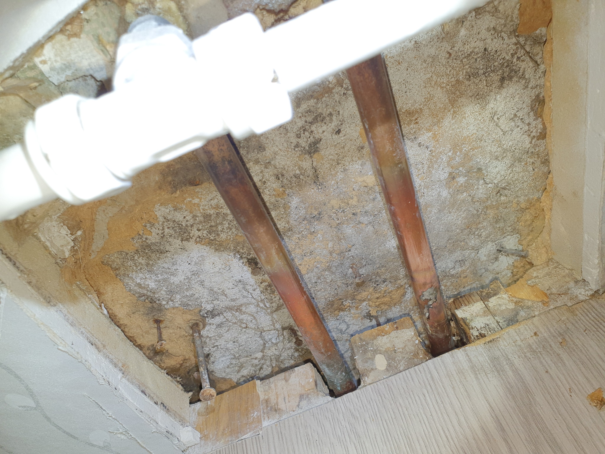 Huset är stenkonstruktion med trä innanmätet. Det är fiberskivor direkt mot stenen och den har sugit fukt så det är blött ca 3 meter nedanför skadan i röret. Det klassiska bruna pulvret som relateras till hussvamp fanns även på golvet.